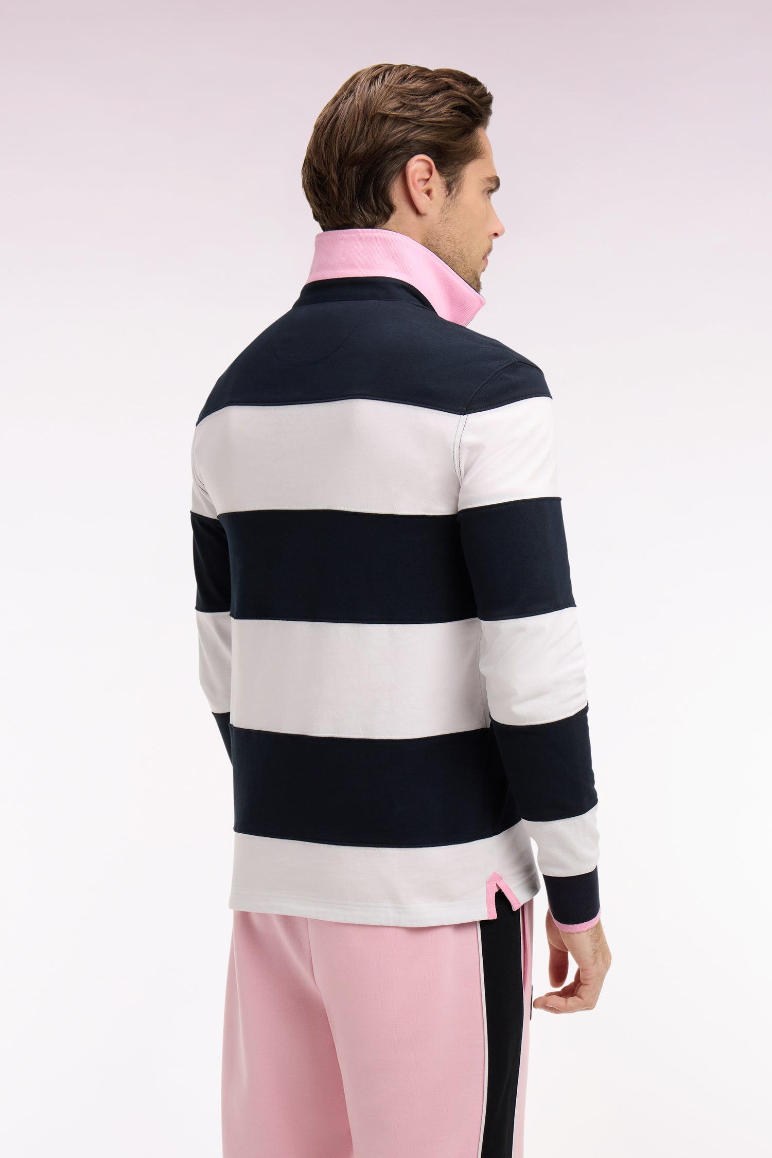 Ce maillot à manches longues célèbre l’esprit sportif du Tournoi des 6 Nations avec un style empreint d’élégance et de caractère. Confectionné en jersey 100 % coton, il se distingue par ses découpes sportives et son écusson brodé mêlant les emblèmes de l'ovalie. Le dessus de col en twill contrasté et les finitions soignées, poignets à bords contrastés, ruban herringbone aux fentes d’aisance et boutons rugby siglés, signent une pièce à la fois authentique et raffinée, fidèle à l’héritage de la Maison.