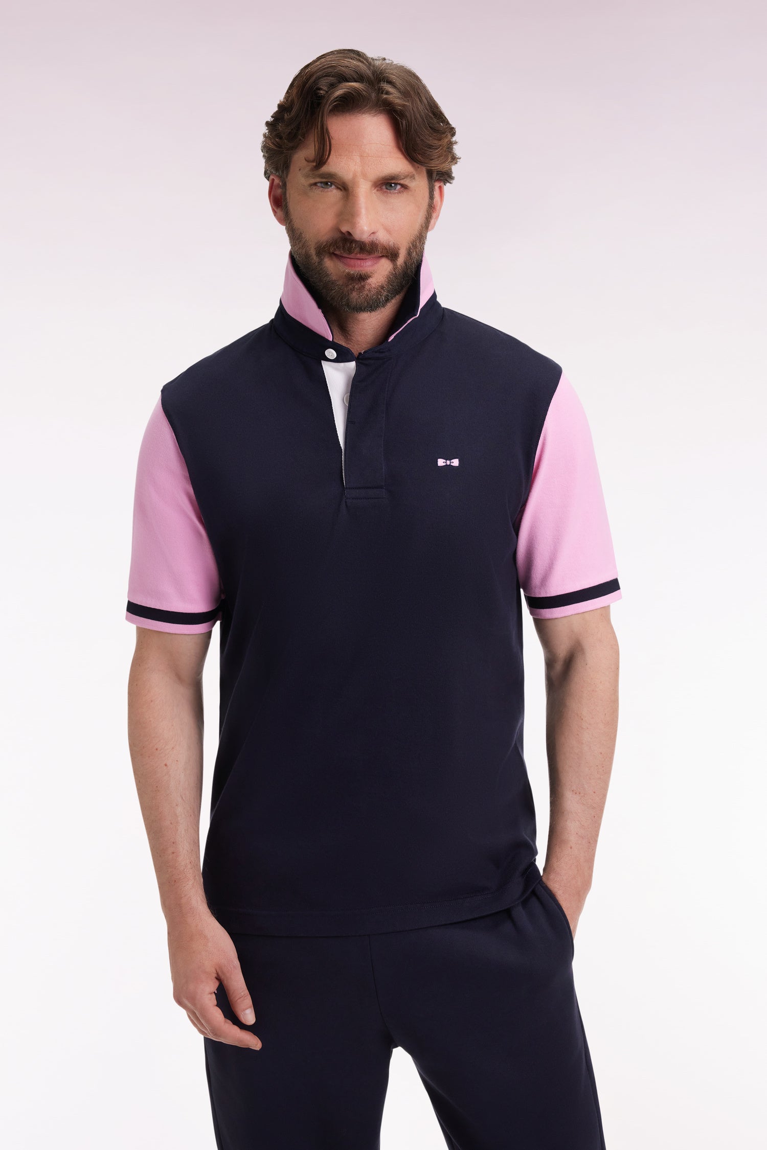 With contrasting pink sleeves and collar on a navy base, this cotton jersey shirt embodies the subtle audacity of the Eden Park wardrobe. Comfortable and easy to wear, it features the House's signature finishes, from the button-down collar to the bow-tie embroidery, for a sporty-chic silhouette with casual elegance. A statement of style, its back is enlivened by a large embroidery inspired by our rugby heritage.