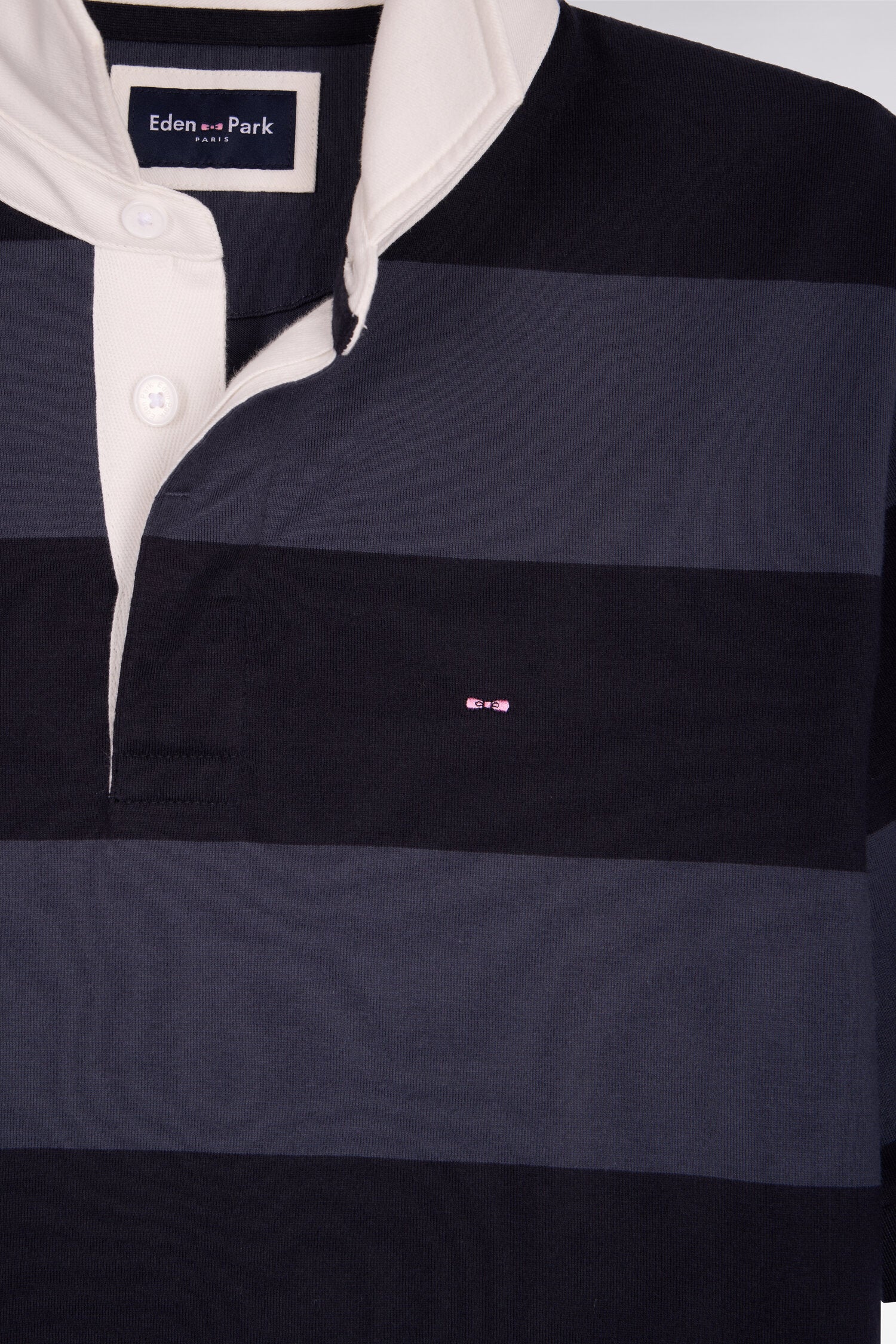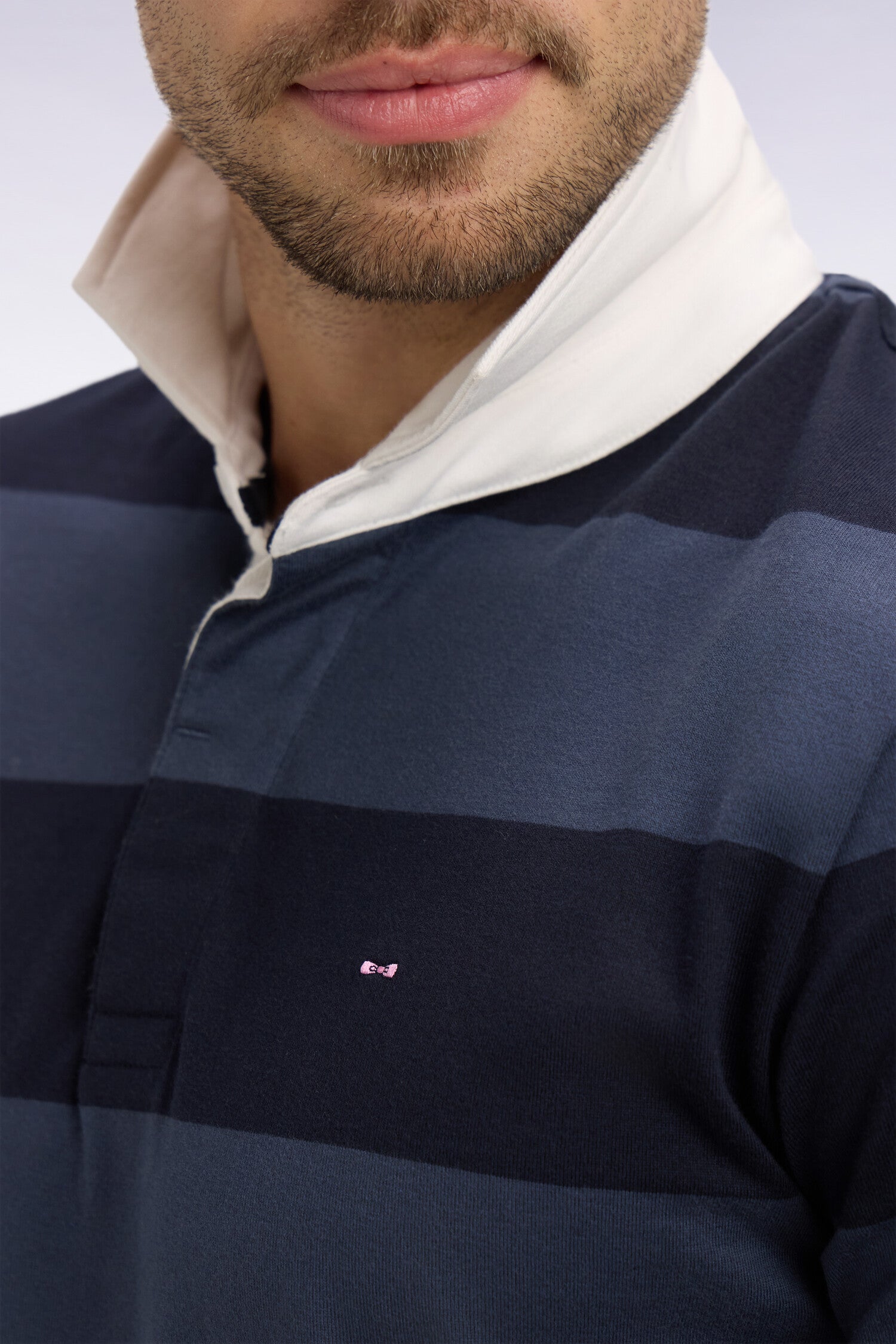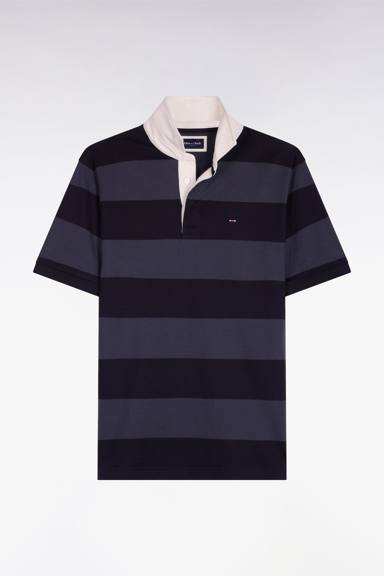 Ce maillot à rayures horizontales marine et grises revisite l’iconique jersey de rugby à travers un graphisme affirmé et une palette classique riche de contrastes. Son col maillot en twill structuré et les boutons ovales rugby renforcent son caractère authentique. La broderie poitrine signe une allure preppy maîtrisée. Un modèle moderne et dynamique pour les silhouettes casual chic.