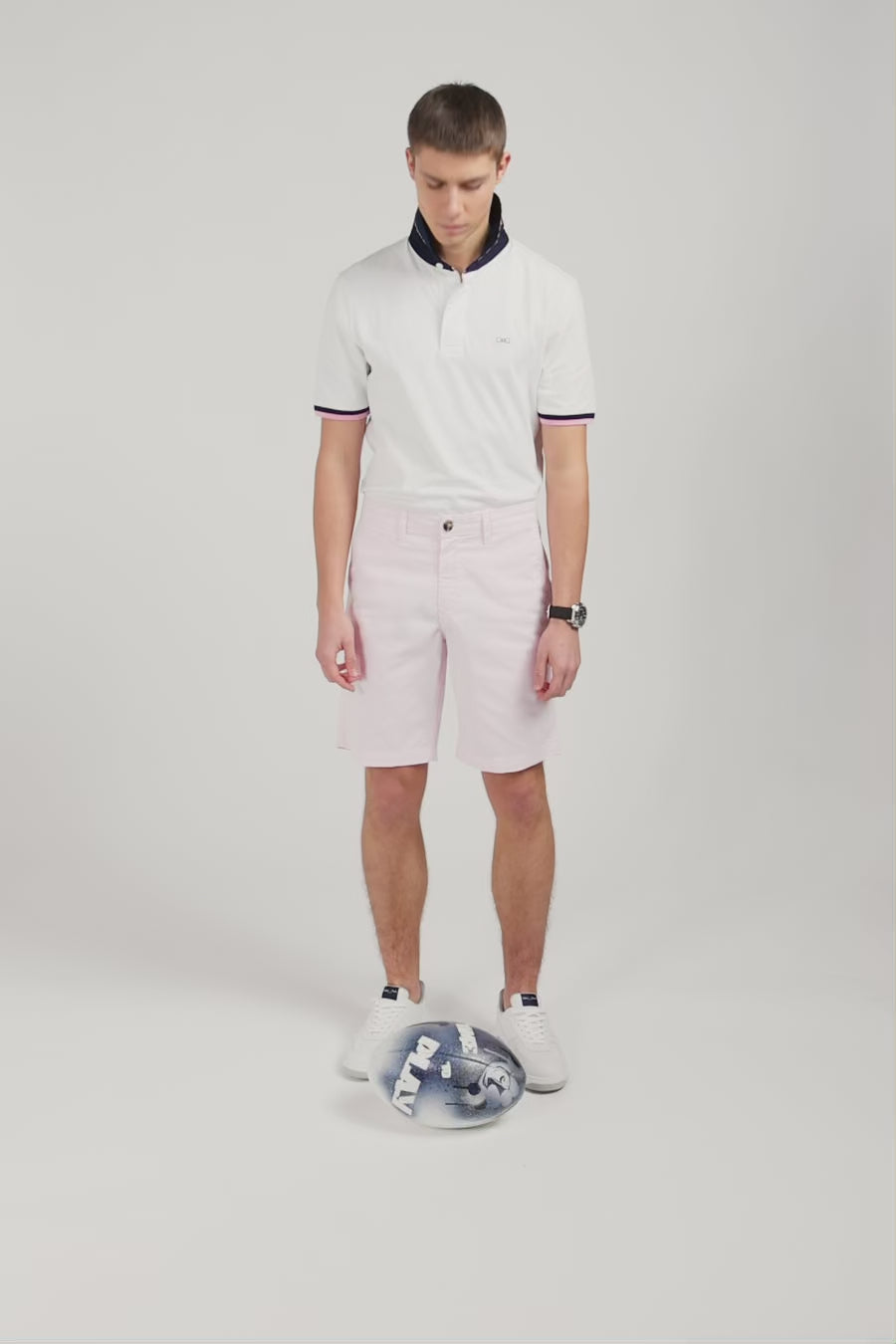 • Twill collar with signature oval buttons under placket