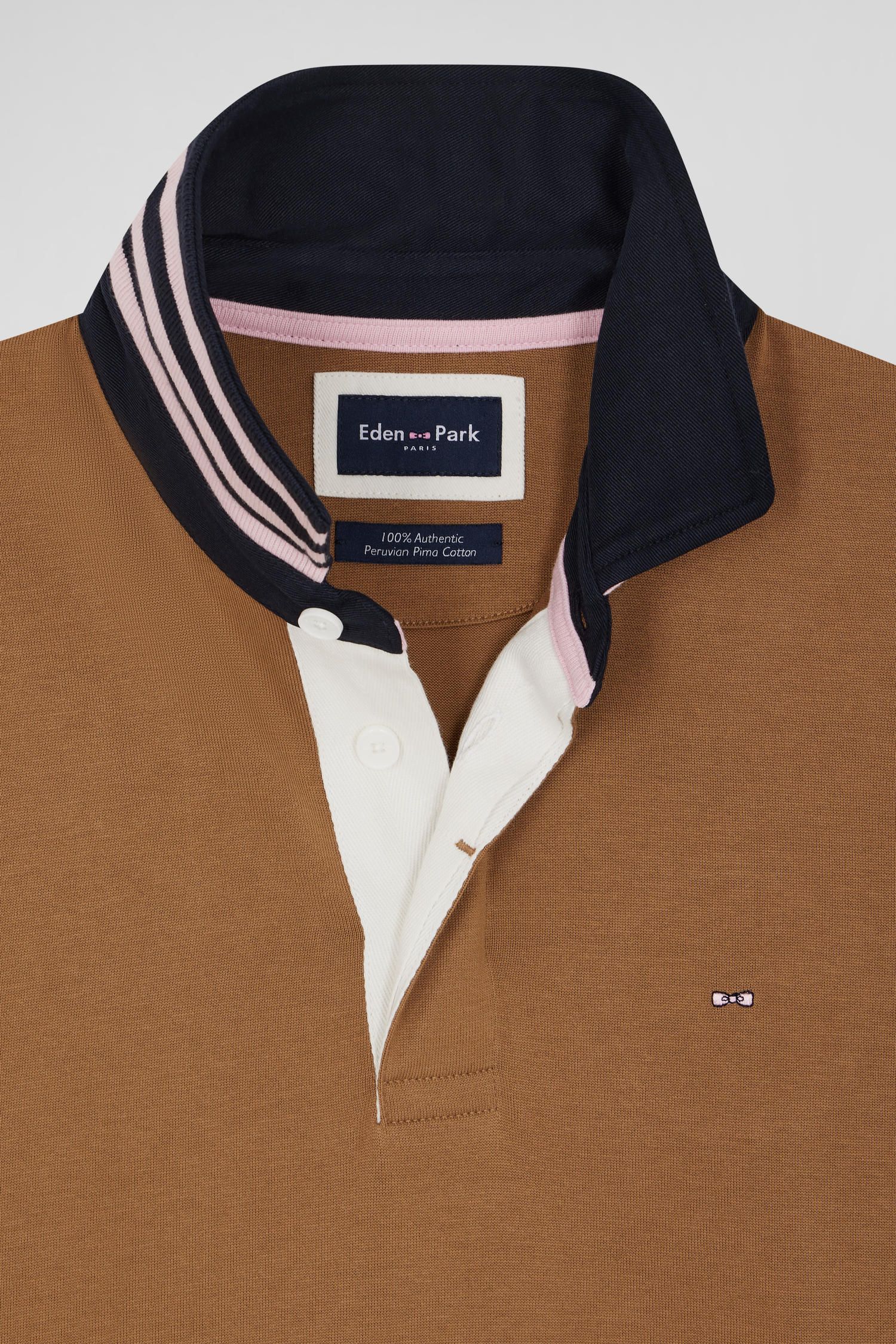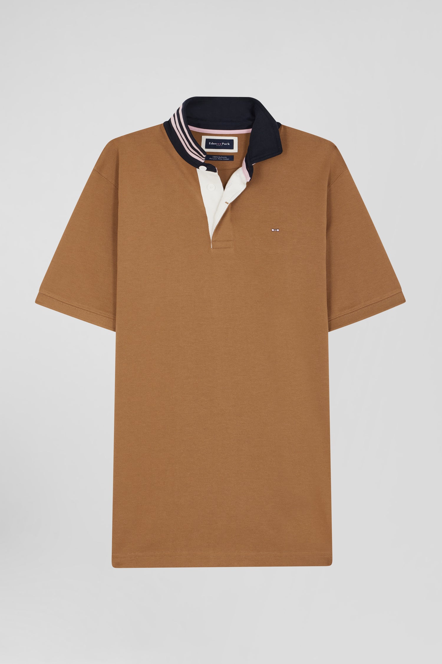 Embrace Eden Park's signature French Flair look with this men's short-sleeved jersey. Its original hue and contrasting collar, adorned with distinctive pink stripes below the collar, offer a touch of presence. The white button placket lends a sophisticated silhouette to this rugby-inspired city jersey. This model reflects unique craftsmanship, with details designed for assertive style and impeccable quality.