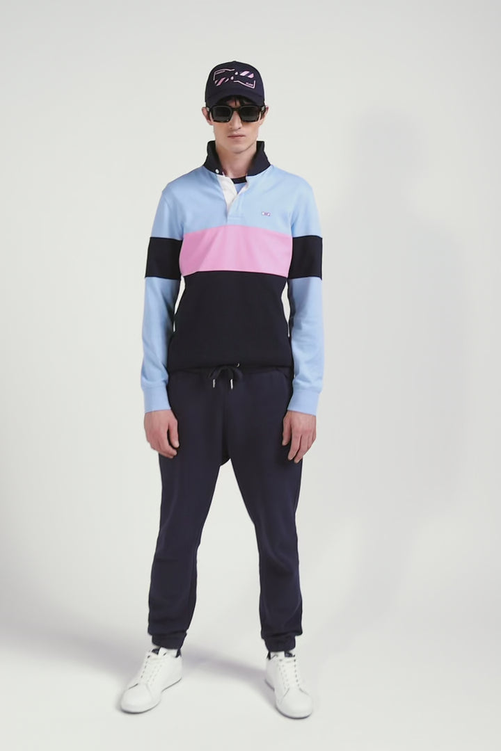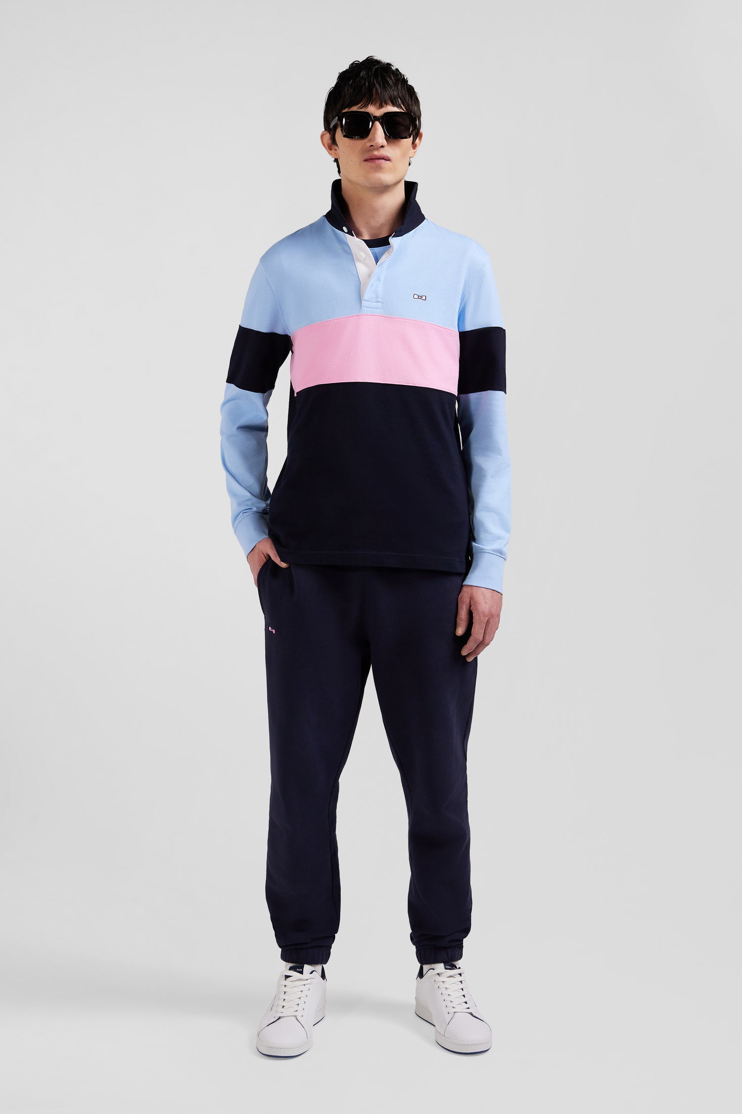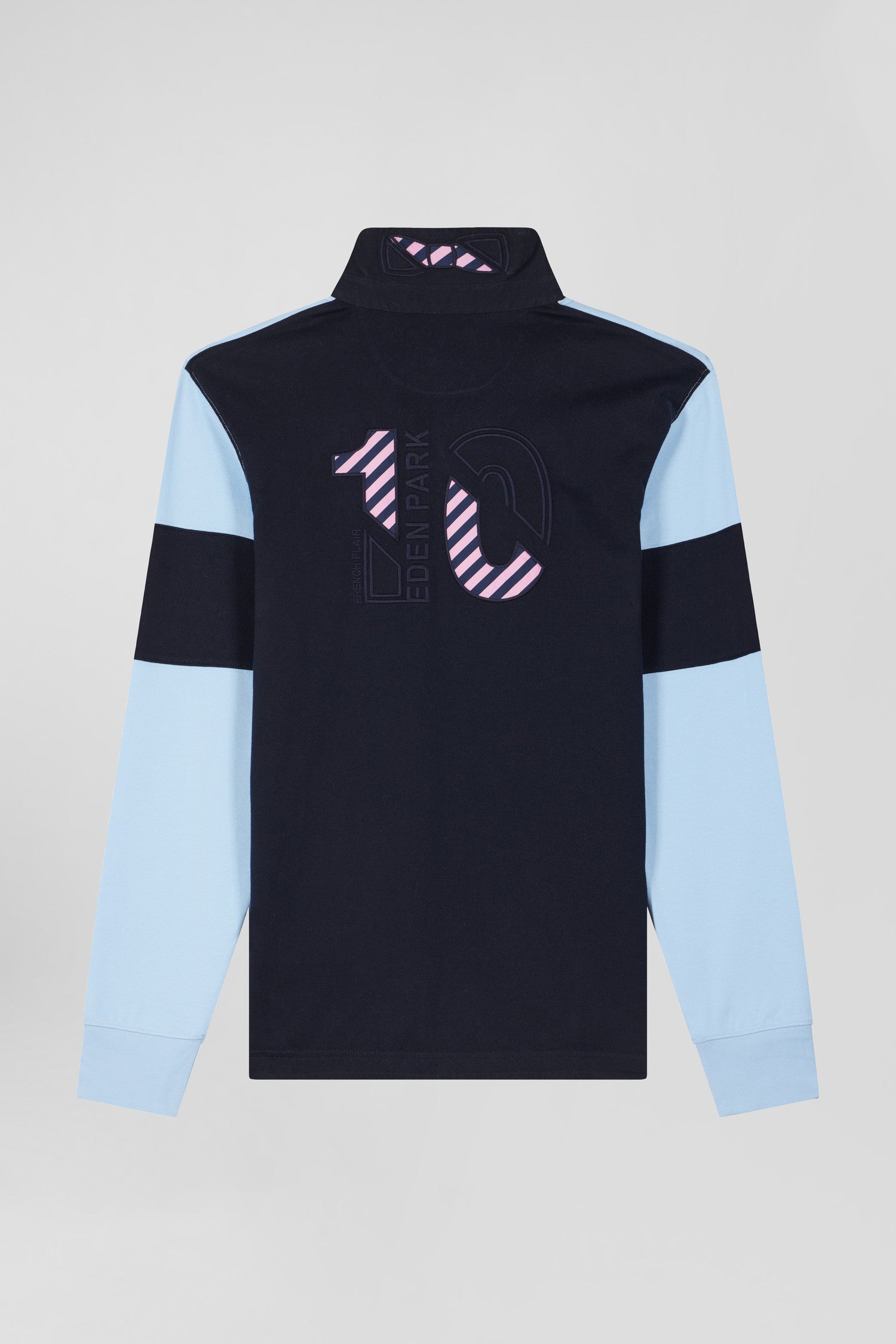 Make a style statement with this Eden Park long-sleeved men's jersey. Sporting elegance is reinvented in a colorblock tribute to the iconic colors of our House. The bold embroidery of the number 10 on the back, highlighted by hooped tie fabric, celebrates rugby heritage with panache. The classic collar, contrasting button placket and iconic embroidered bow tie give this characterful piece a distinguished finish.