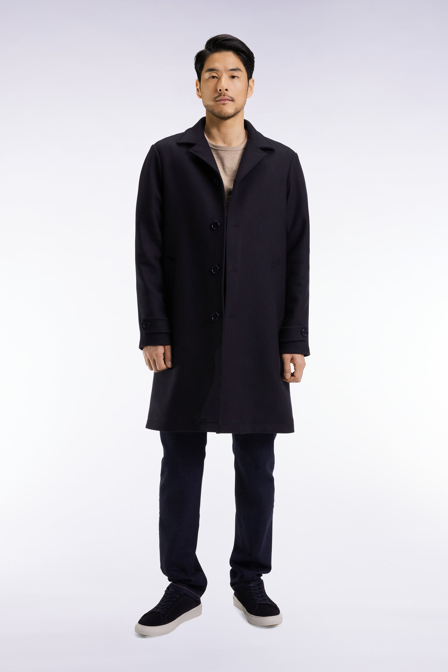 Eden Park's signature: durable, well-thought-out pieces, impeccably executed with respect for materials. Purity, softness and timelessness perfectly define this straight coat in navy wool-blend. Its structured cut and discreet finishes, such as the buttoned tabs on the cuffs, emblem patch and navy lining, make it an essential part of the men's wardrobe. An elegant piece in a supple, warm fabric to carry you through the seasons with style, whatever your day's agenda.