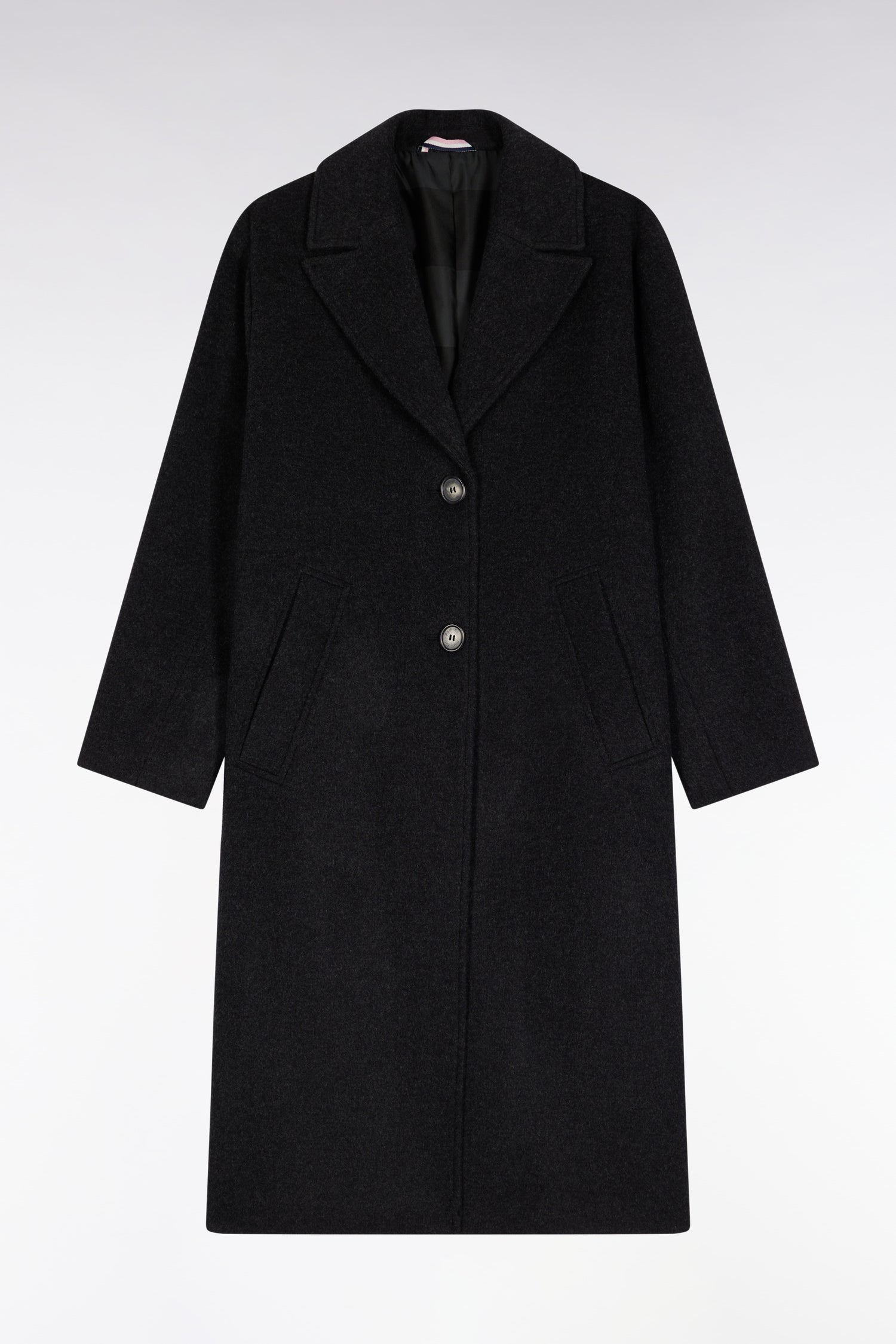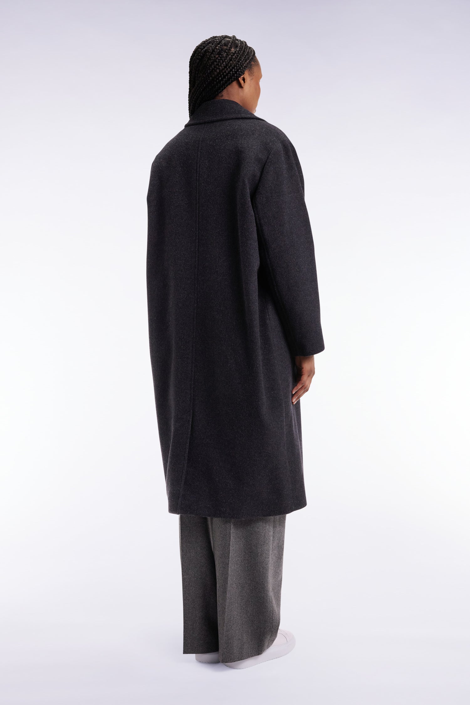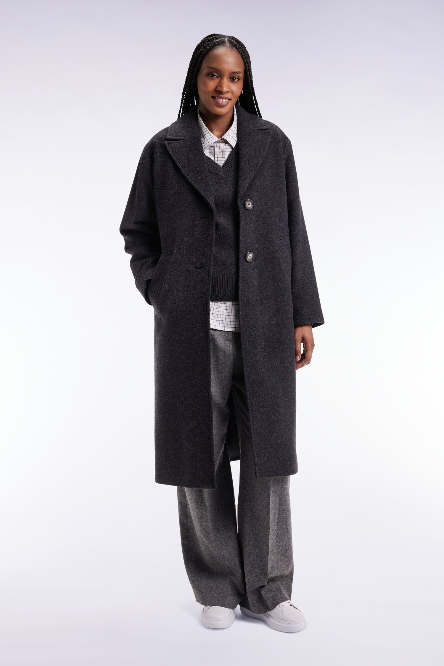 Inspired by the men's outdoor wardrobe, this oversized coat for women has a structured line that's both chic and casual. Crafted in deep-gray double wool twill, it features a loose, straight cut, a classic collar adorned with our signature crest, two exposed button closures and side pockets. An inner lining ringed with rugby stripes and the oval shape of its custom buttons complete the nod to the DNA of our French house. Uncompromising cut and finish reveal the refinement of the Eden Park wardrobe.