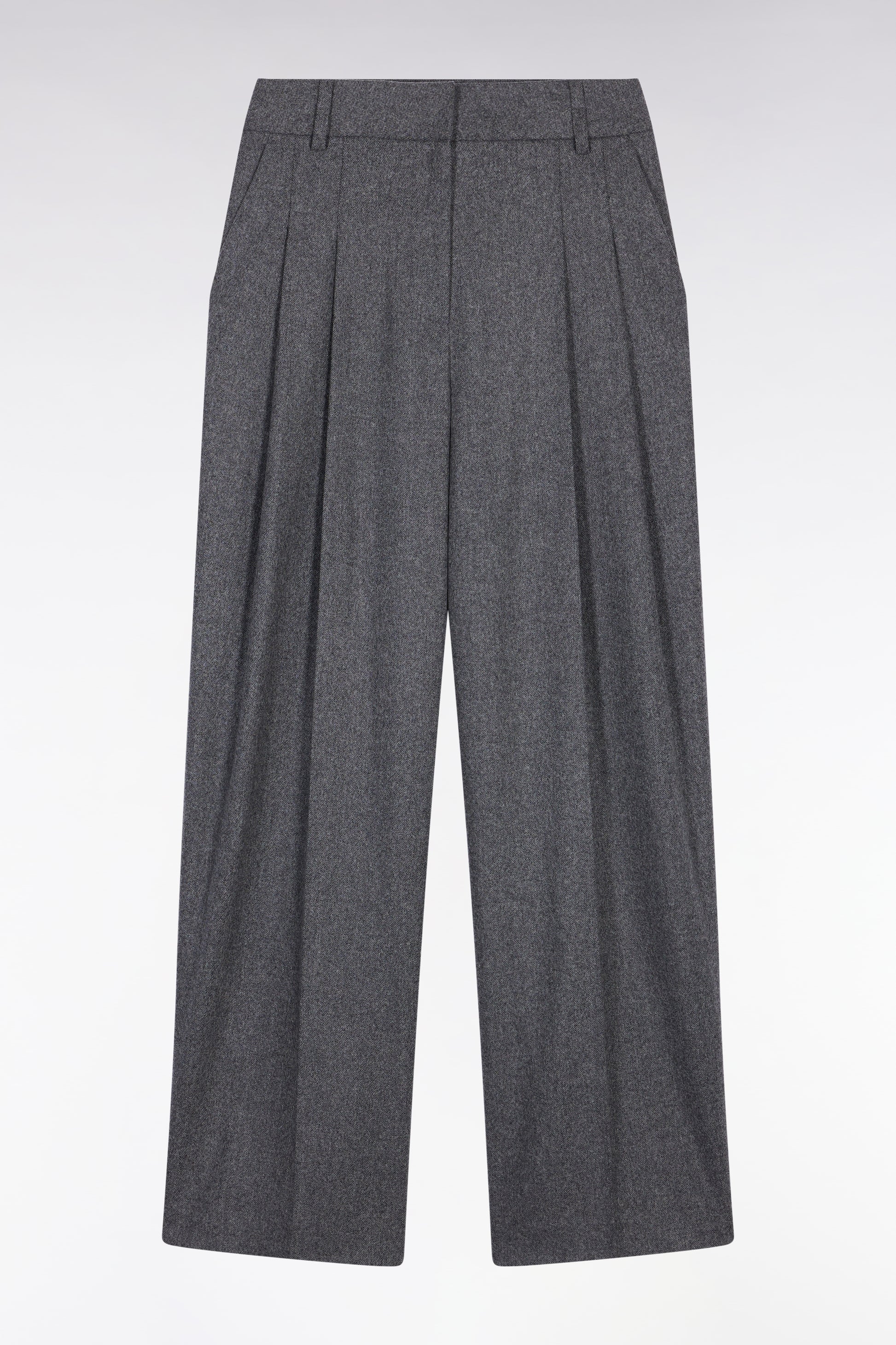 Made in a herringbone fabric with virgin wool for softness and warmth in winter, these gray flannel pants are a sure bet for feminine elegance. The oversized cut and wide leg with two front pleats add a boyish touch to these pants with a fitted waist that revisits the sartorial savoir-faire of French fashion. Wear with a tailored shirt or as a total look with the coordinating blazer jacket for a trendy urban silhouette.