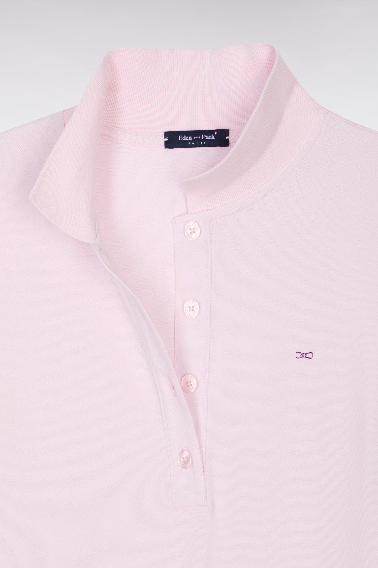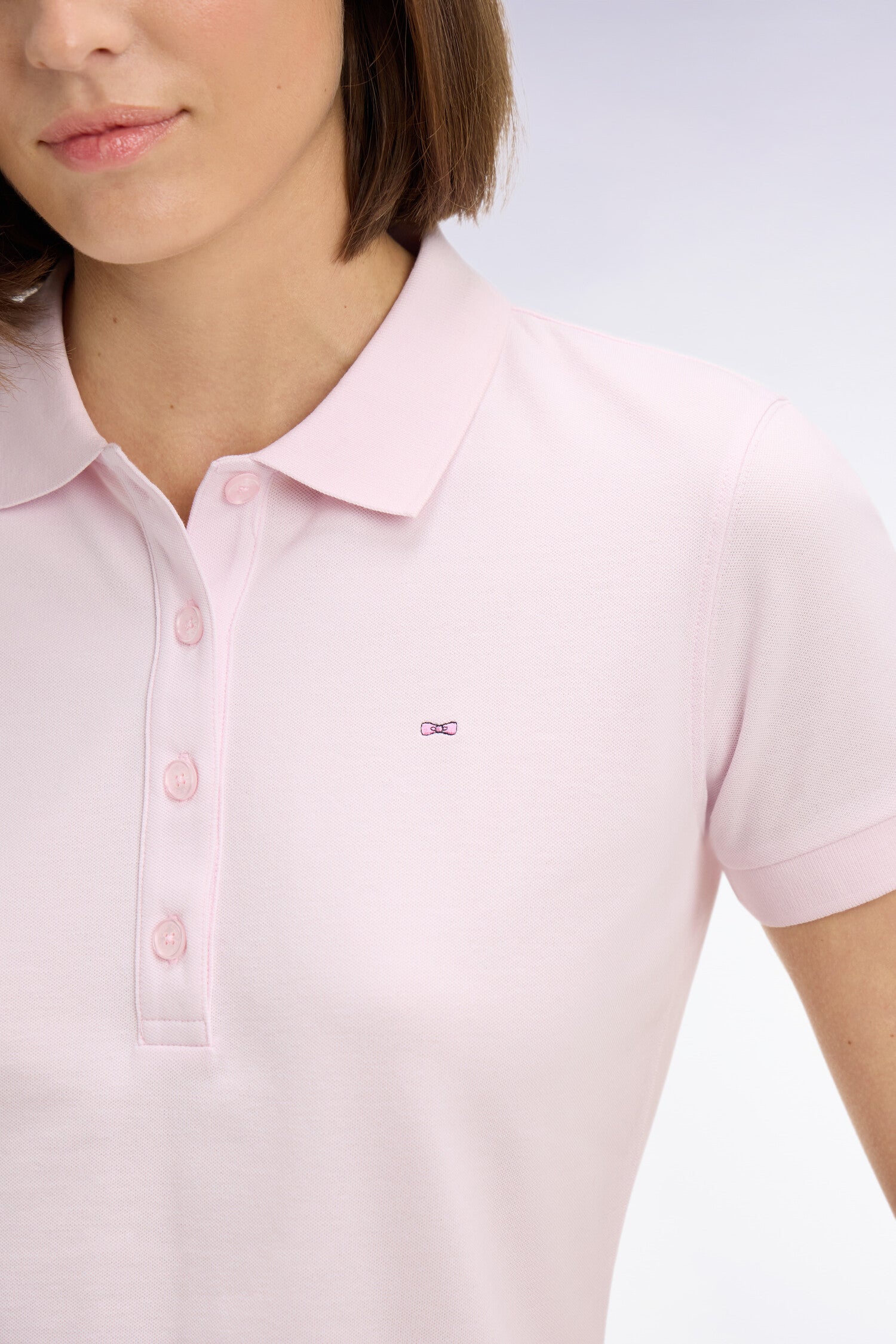 Ce polo femme à manches courtes confectionné dans un coton stretch doux et léger est disponible en coloris blanc, marine ou rose. Sa coupe slim plus cintrée assure une allure chic et sportive au quotidien. Ce modèle iconique arbore notre broderie signature : l'emblème nœud papillon Eden Park.