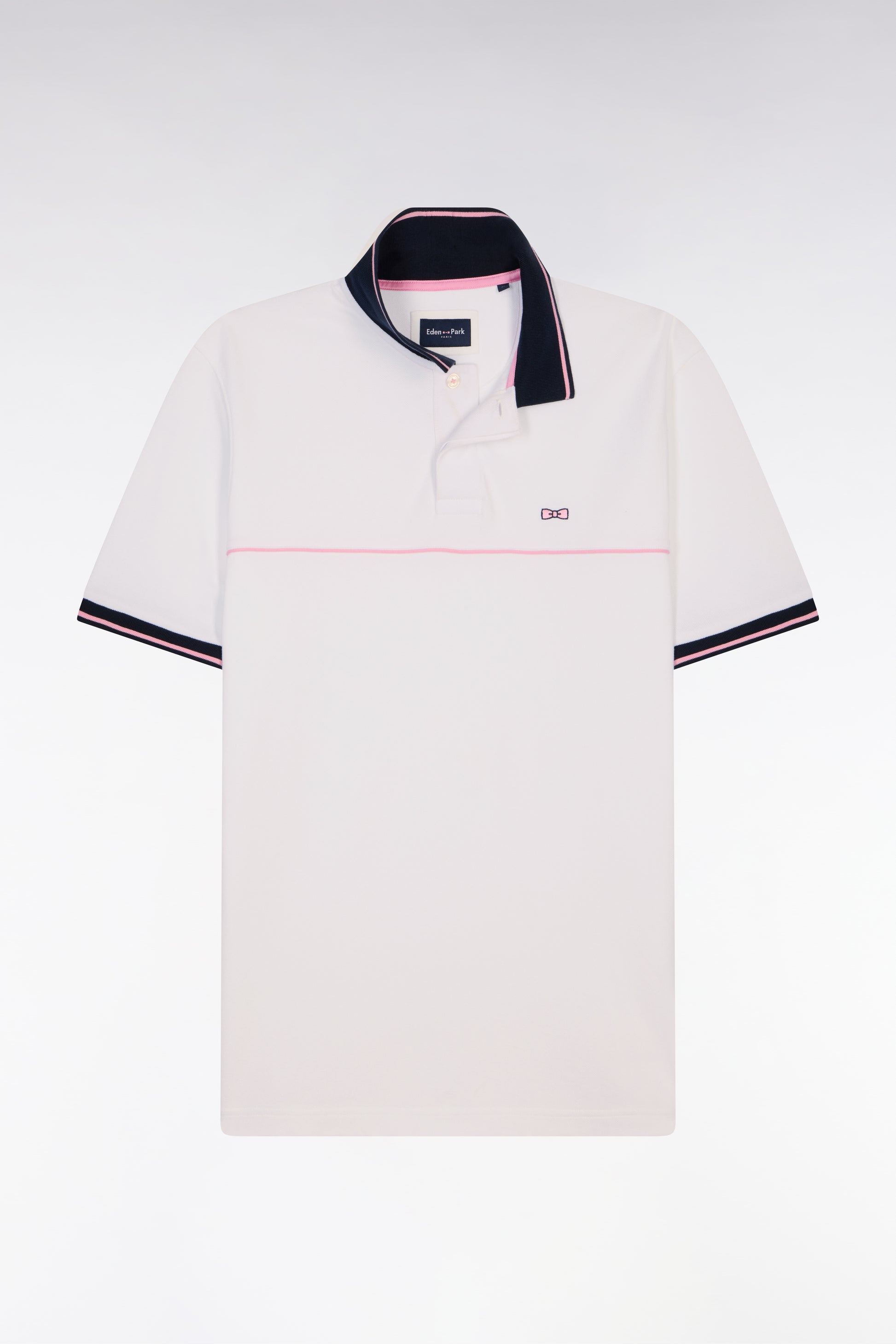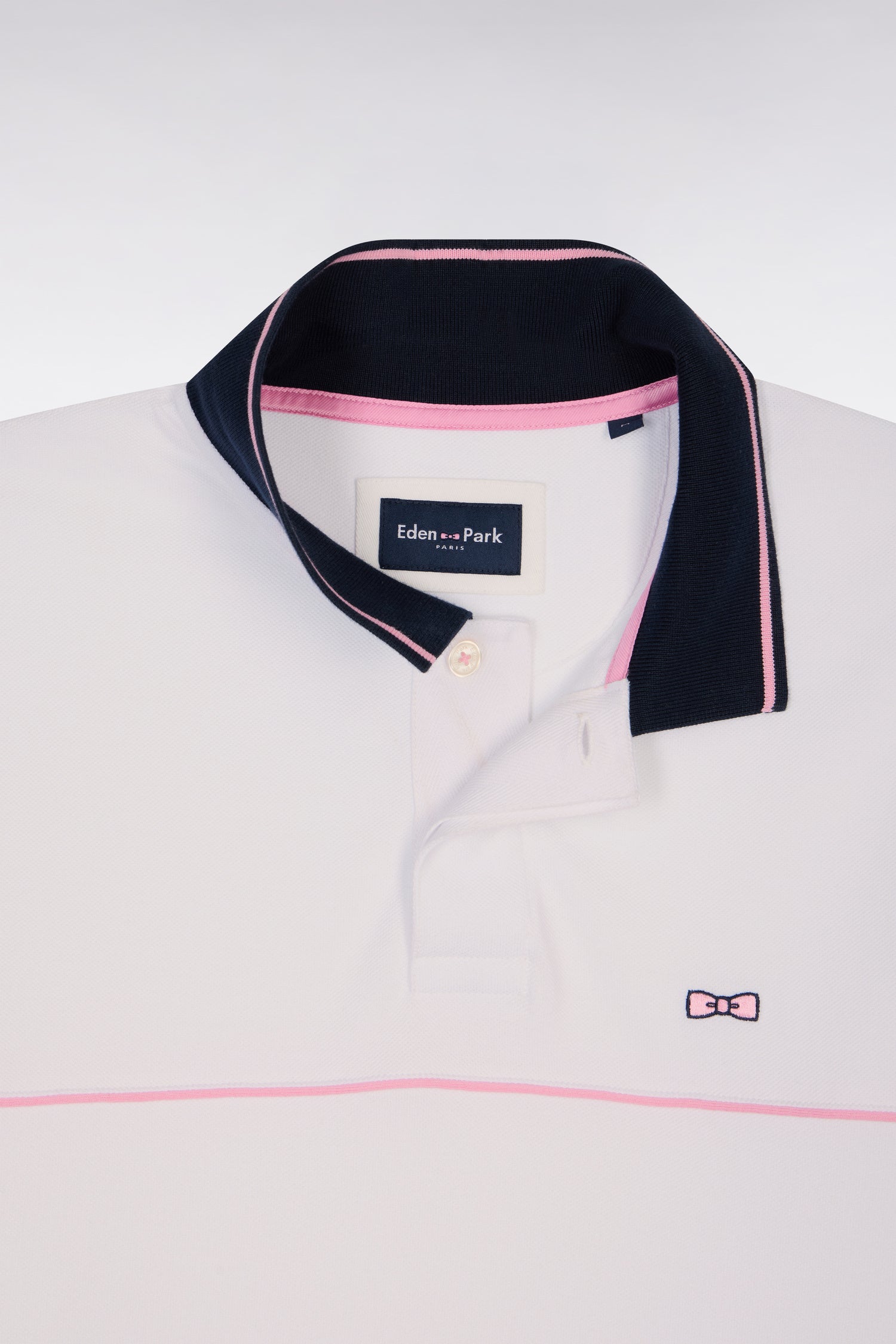 Notre polo masculin blanc ou marine se distingue par ses fines rayures roses agrémentant ses bords-côtes manches et col, un détail repris sur le passepoil qui traverse sa poitrine et sur le pourtour de ses fentes d'aisance. Ces finitions en font un modèle emblématique, reflétant l'esprit rugby chic de notre Maison.