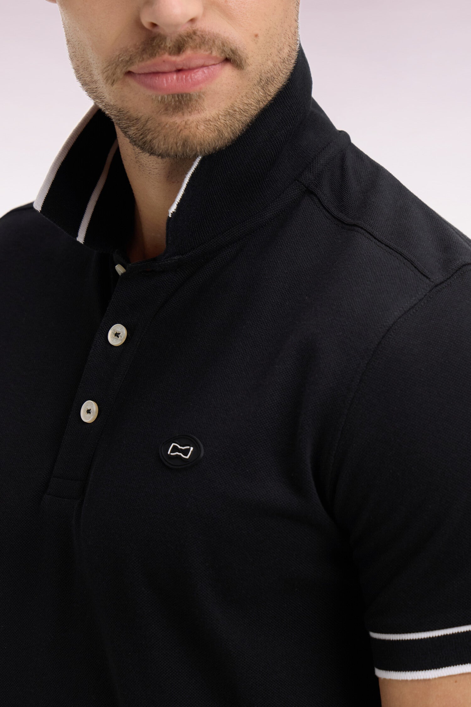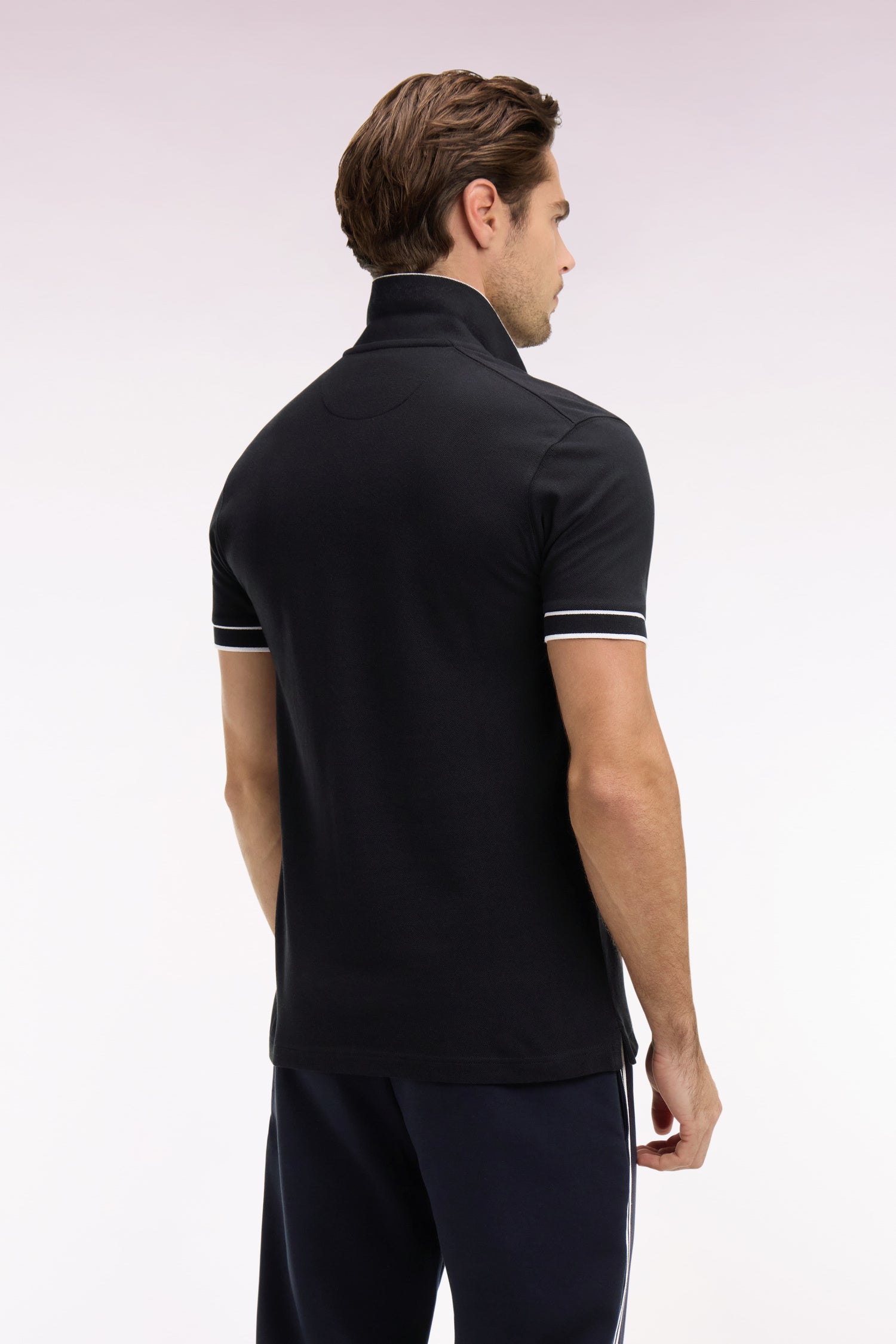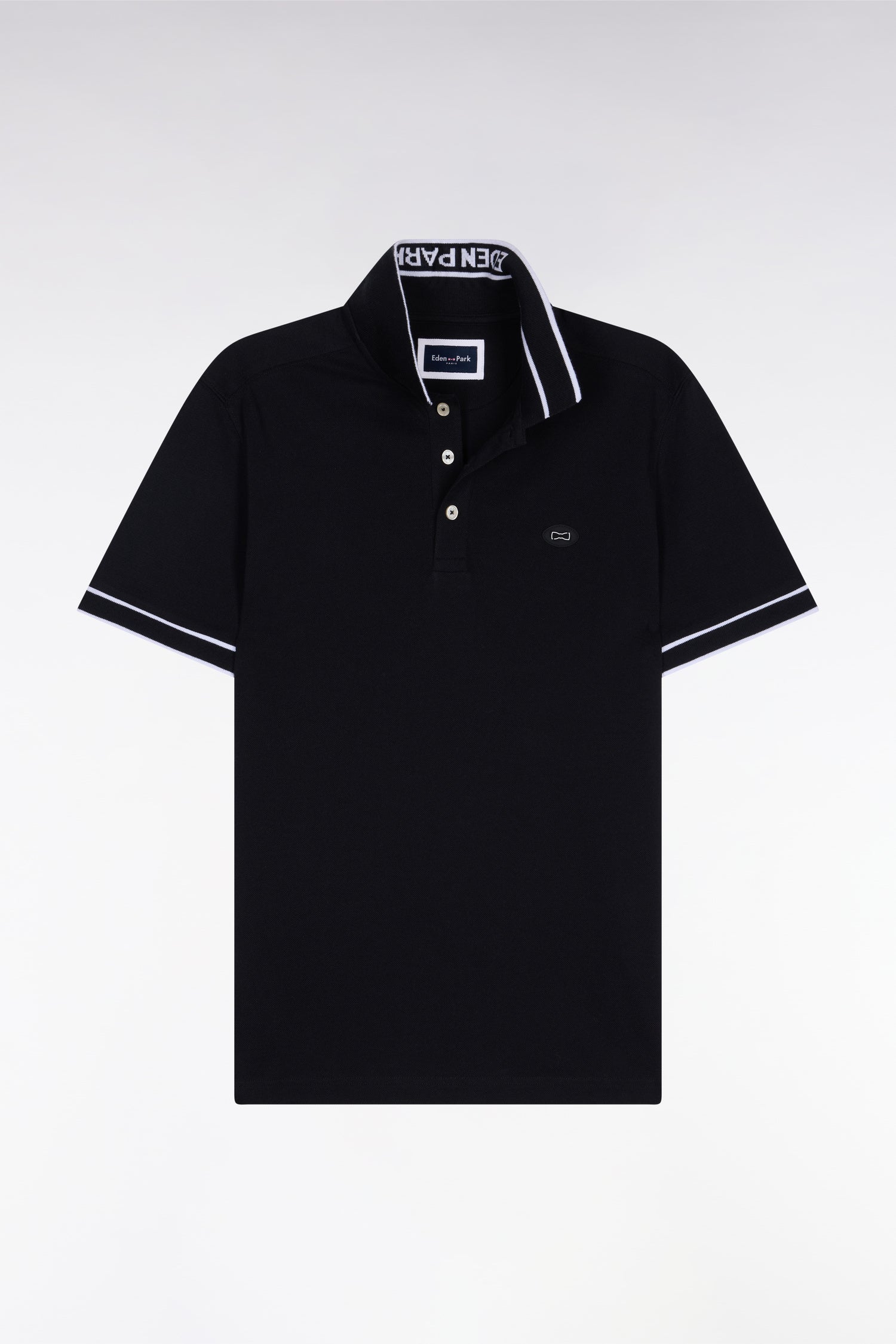 Ce polo masculin en piqué de coton façonné dans une coupe regular affirme une allure sport chic grâce à son badge poitrine et ses finitions bords-côtes rayées au col et aux manches. Le jacquard Eden Park au dos du col et la découpe sur les épaules, héritage coupé cousu de nos ateliers, renforcent son caractère graphique. Décliné en noir, ciel ou rose, ce polo à manches courtes incarne l'élégance moderne et assumée de l'homme Eden Park.
