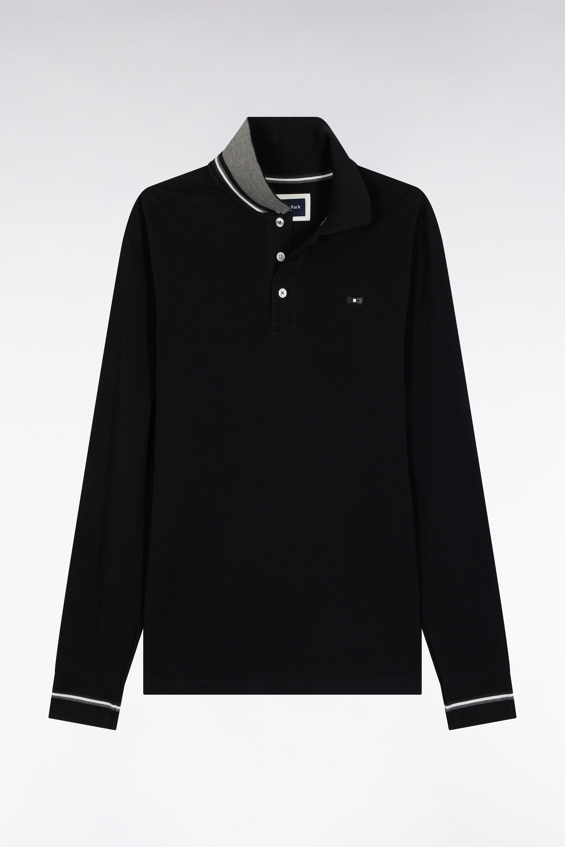 Inspired by the company's rugby heritage, this men's long-sleeved polo features tricolored striped trim on the collar and sleeve cuffs. Made from piqué cotton, the Relaxed cut is slightly looser than a straight cut for greater ease of movement. It features a unique trompe-l'œil overlay effect on the collar and cuffs. A staple of the Eden Park sport-chic wardrobe, available in navy or black.