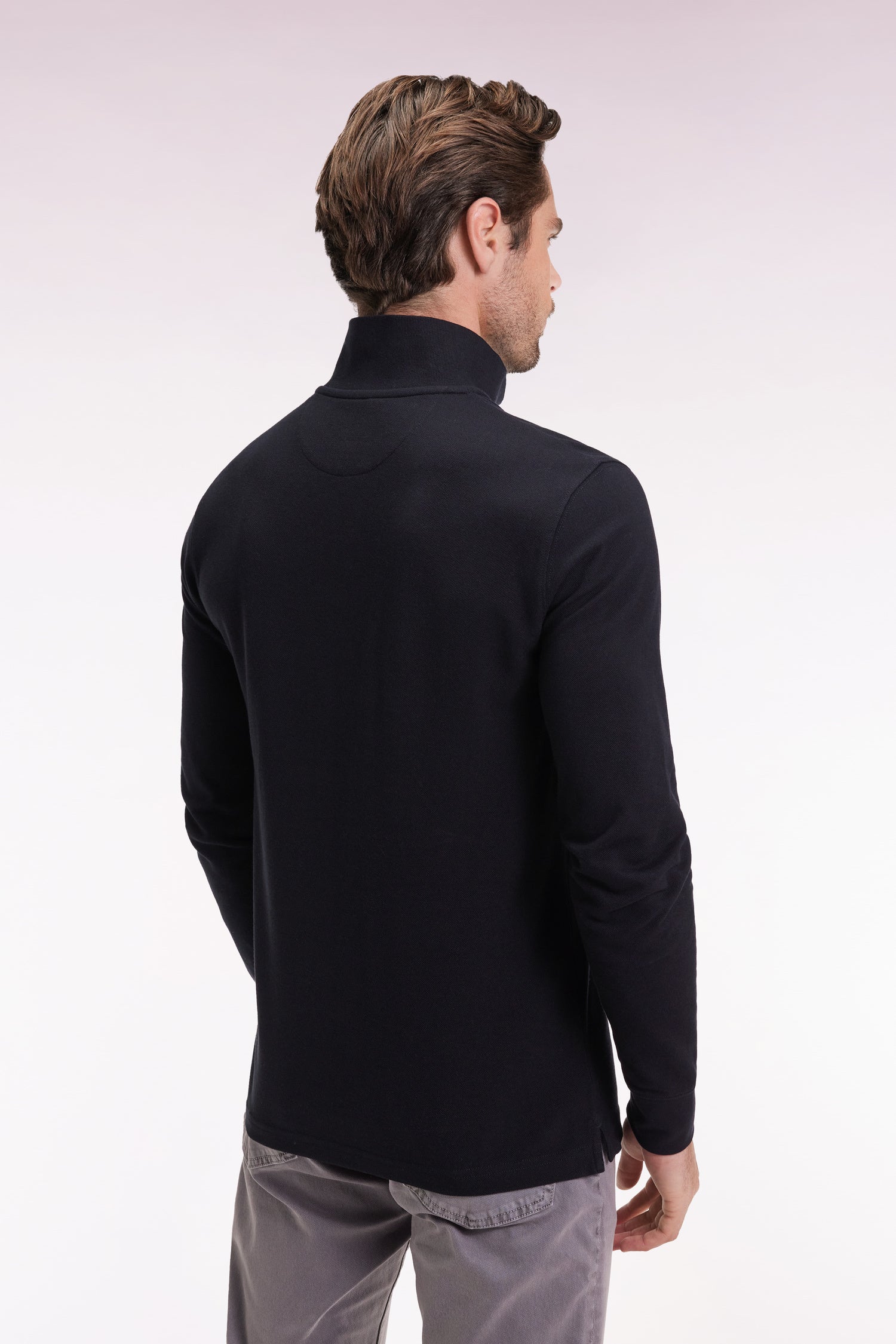Long-sleeved polo shirt in black Pima cotton, straight cut