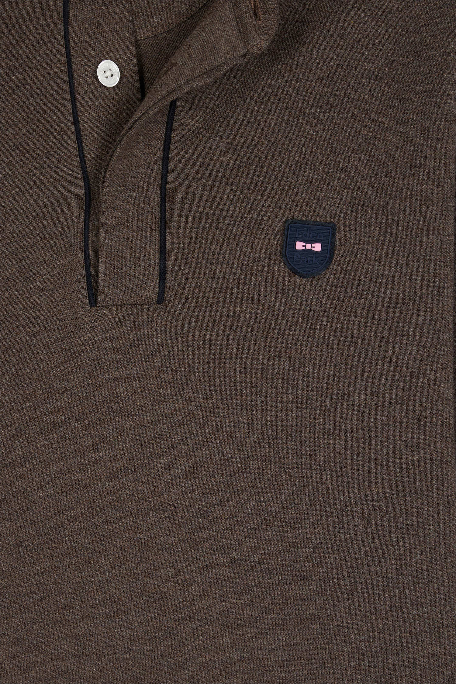 Long-sleeved polo shirt in brown stretch cotton with piping, slim fit