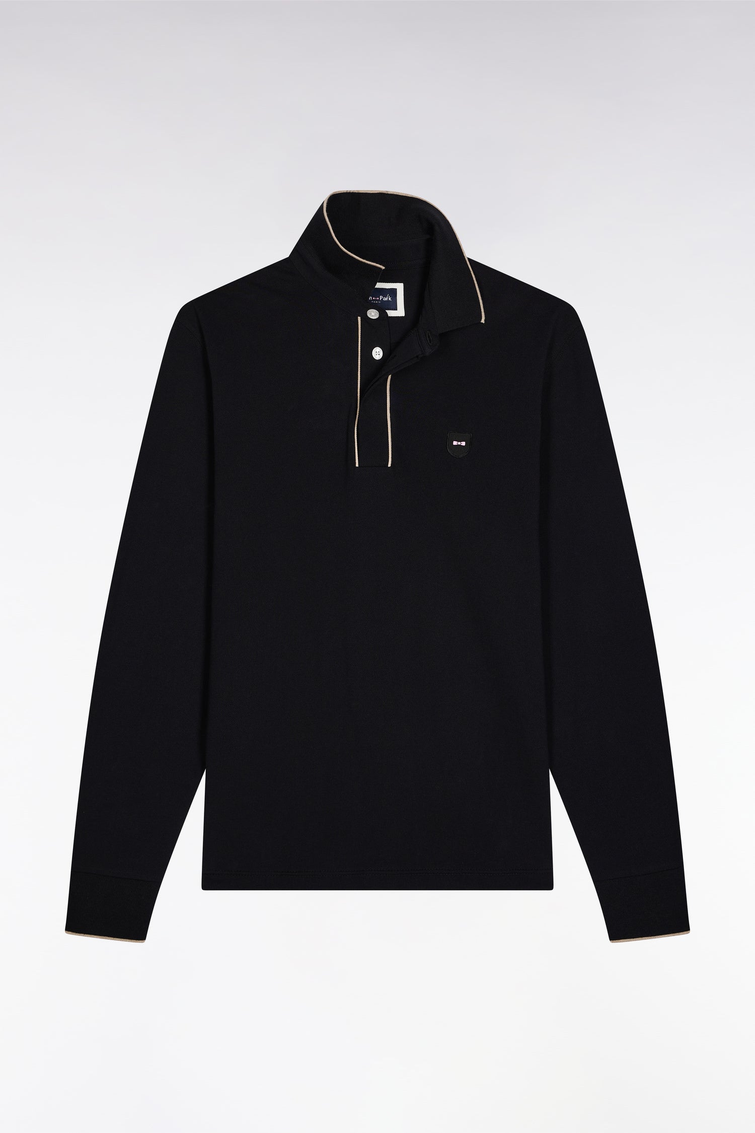 Long-sleeved polo shirt in black stretch cotton with piping, slim fit
