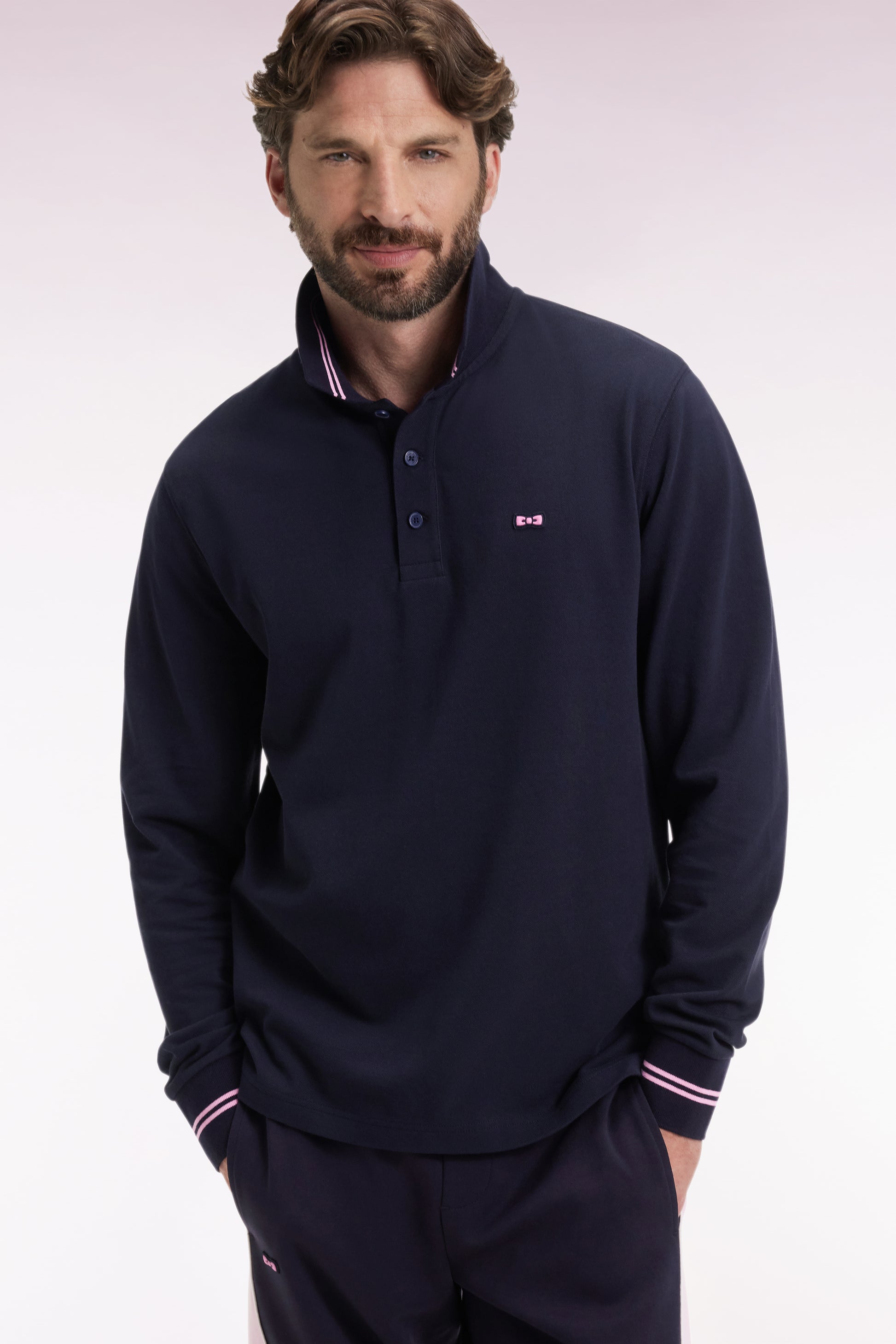 Long-sleeved polo shirt in navy cotton piqué with striped collar.