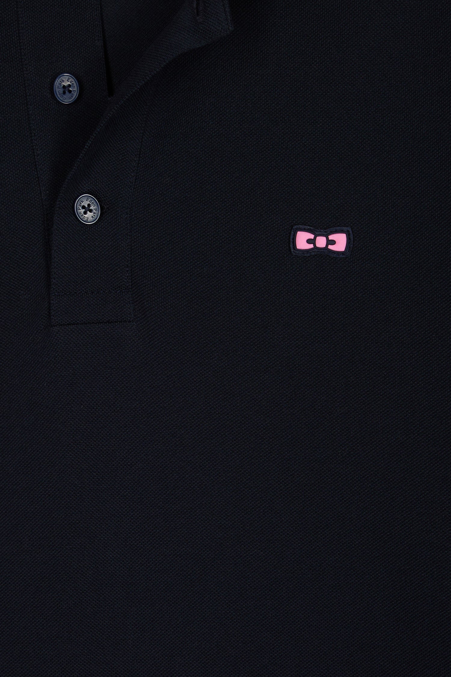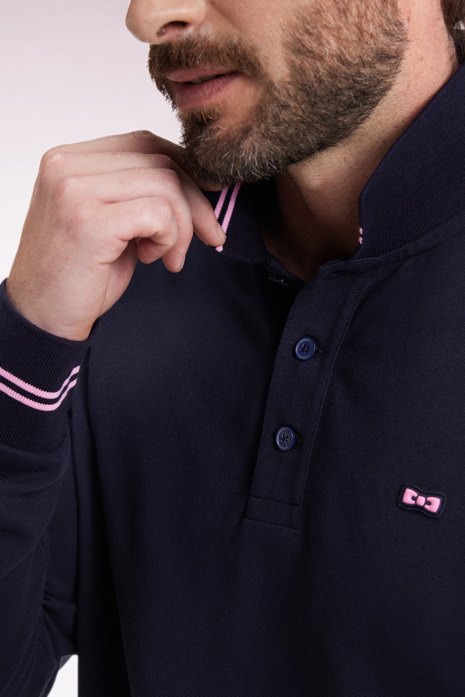 Simply enhanced by a pink rugby-striped collar, whose ribbed cuffs offer a subtle reminder, this navy long-sleeved polo is a pillar of sporting elegance. An original detail, its bow tie emblem is worked in a silicone rubber version for a more athletic, modern touch.