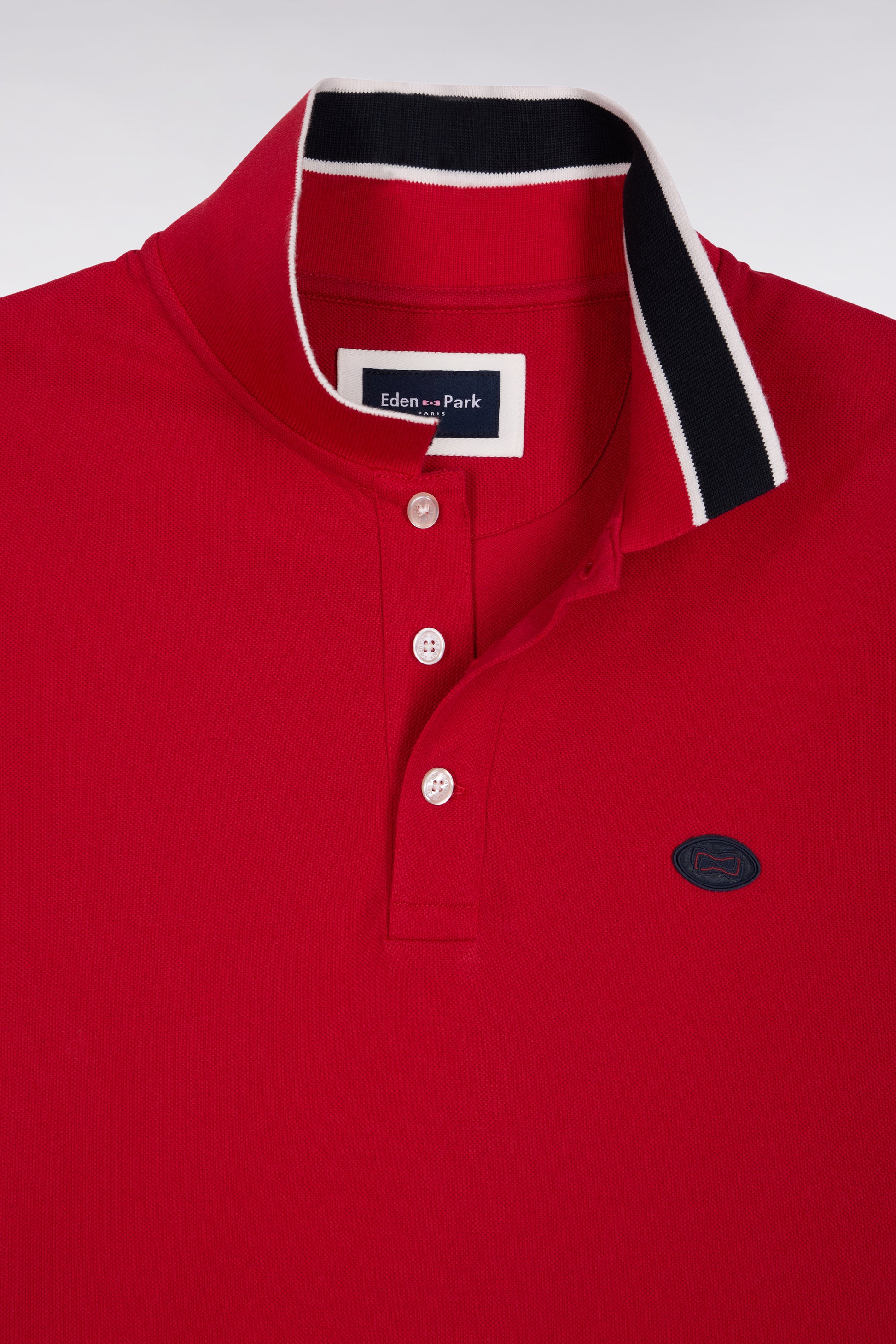 Available in blue, white or red, this polo pays homage to the hexagon! Its soft, lightweight cotton is enlivened by a silicon badge in the shape of a rugby ball, featuring our emblem: the bow tie. With its subtle stripe pattern on the collar and bottom sleeves, this loose-fitting polo shirt is the perfect upgrade for everyday wear.