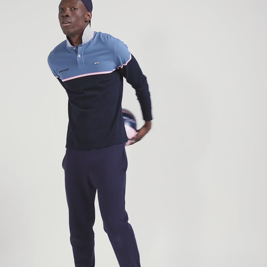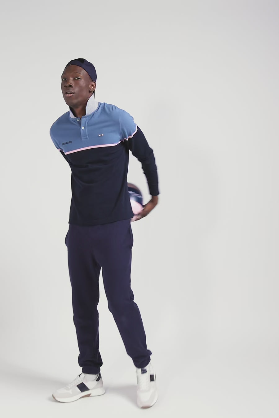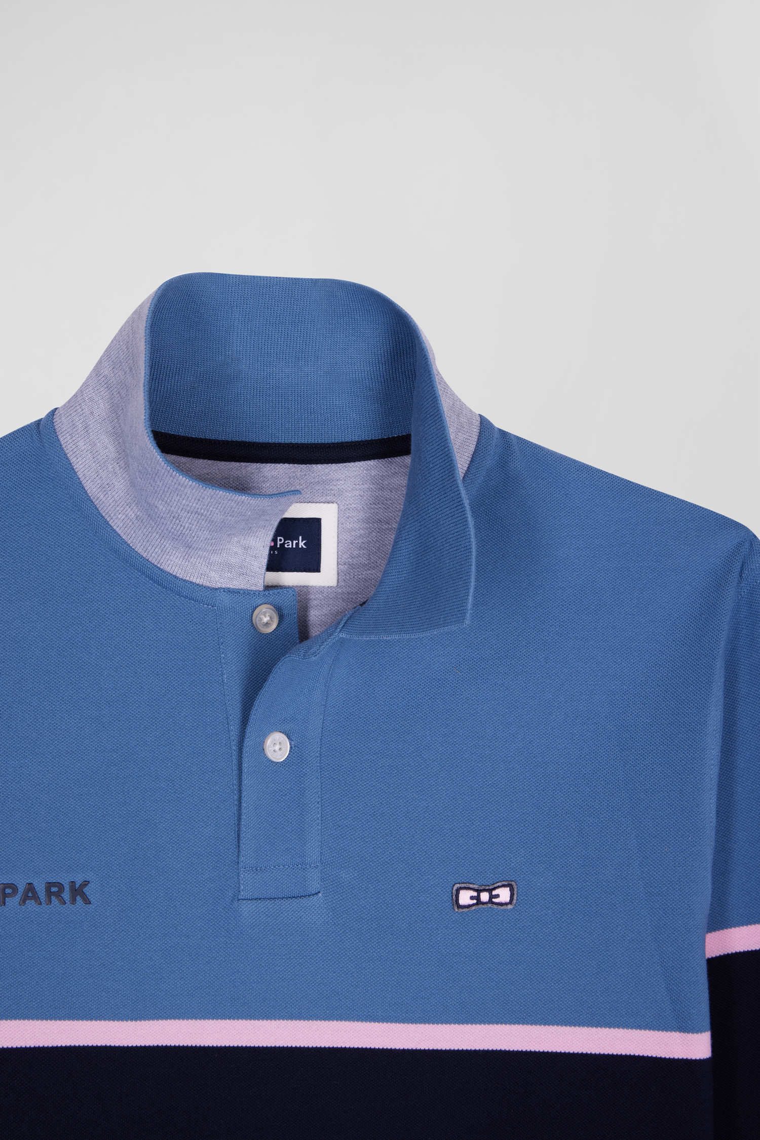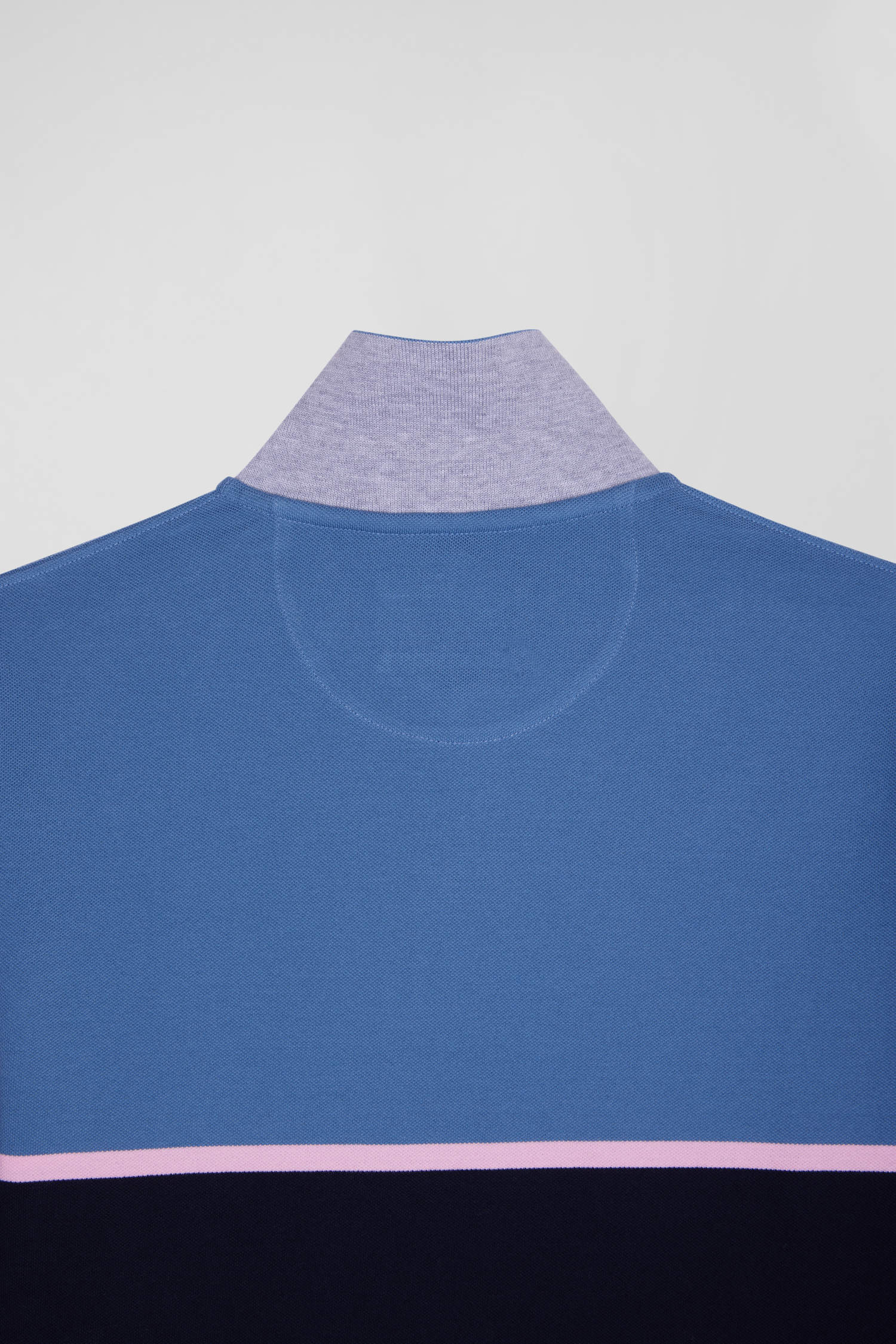Regular blue bicolor long-sleeved cotton piqué polo shirt