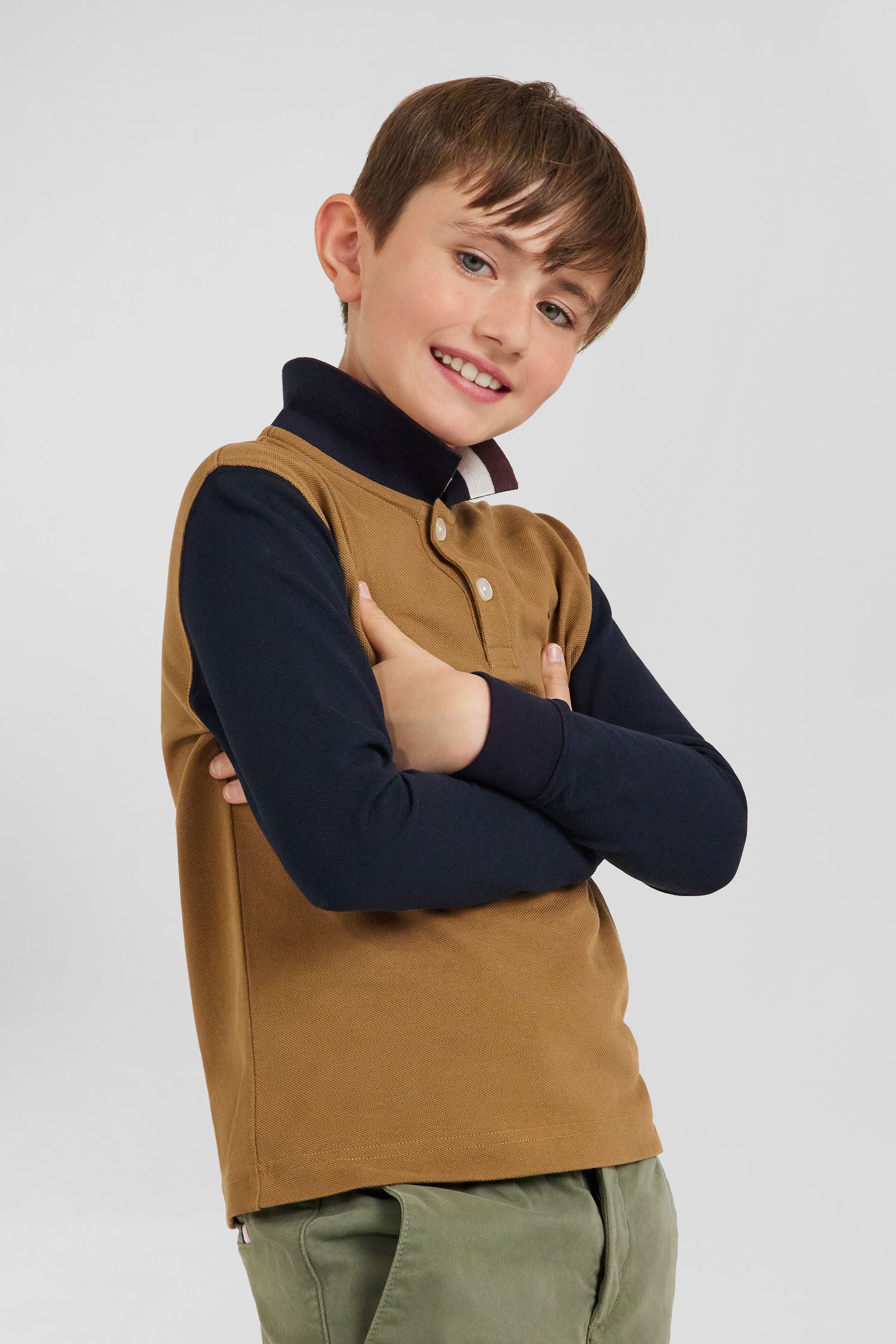 Introduce a touch of distinction to your child's wardrobe with our long-sleeved polo shirt, elegantly designed in hazelnut color with navy sleeves for a striking contrast. The collar features a tri-color jacquard with Eden Park lettering, adding an iconic signature to the design. On the chest, a tricolor bowtie embroidery enhances this polo, fusing classic style with sporty details. Perfect for special occasions or to enhance everyday wear, this polo is a symbol of refinement and youthful elegance.