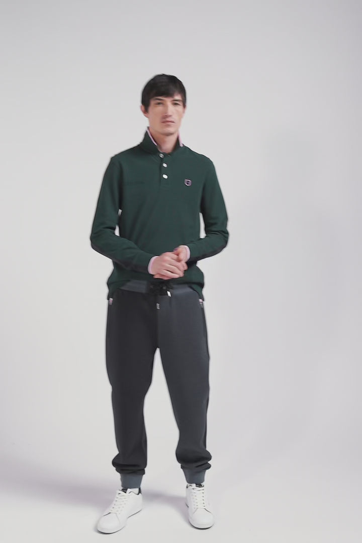 Regular green long-sleeved cotton piqué polo shirt with tricolor details