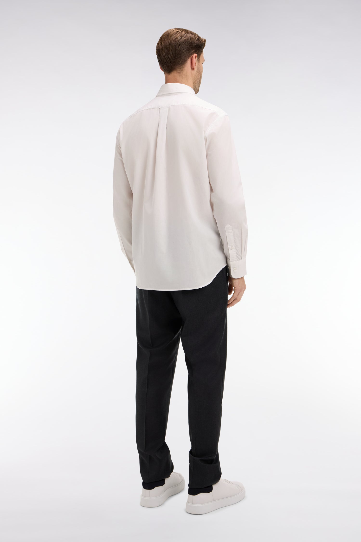 Designed in fine wool, these pants are as elegant as they come, with their straight cut and broken-pleated legs. They feature an adjustable waistband with button placket and belt loops. Functional, the pants feature Italian pockets, a ticket pocket in the seam below the waist, and two welt and buttoned pockets on the back.