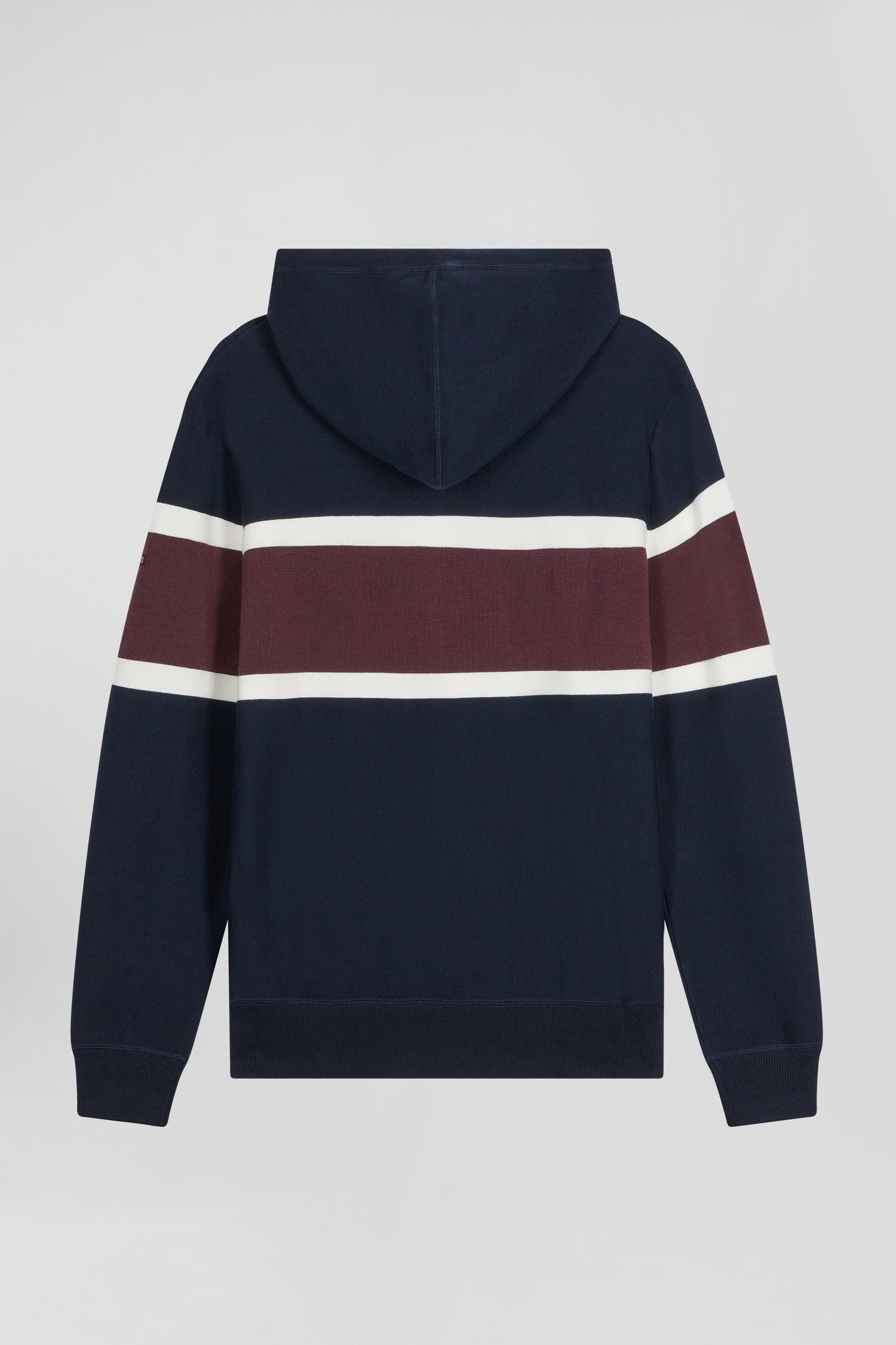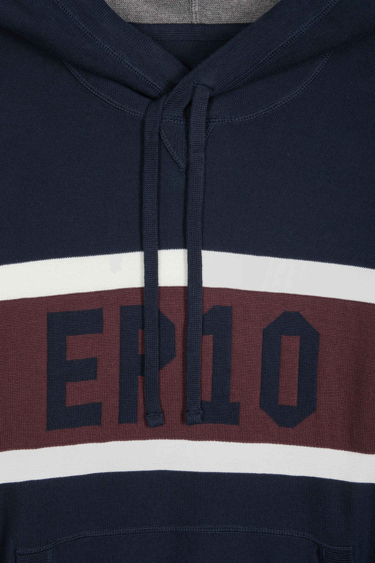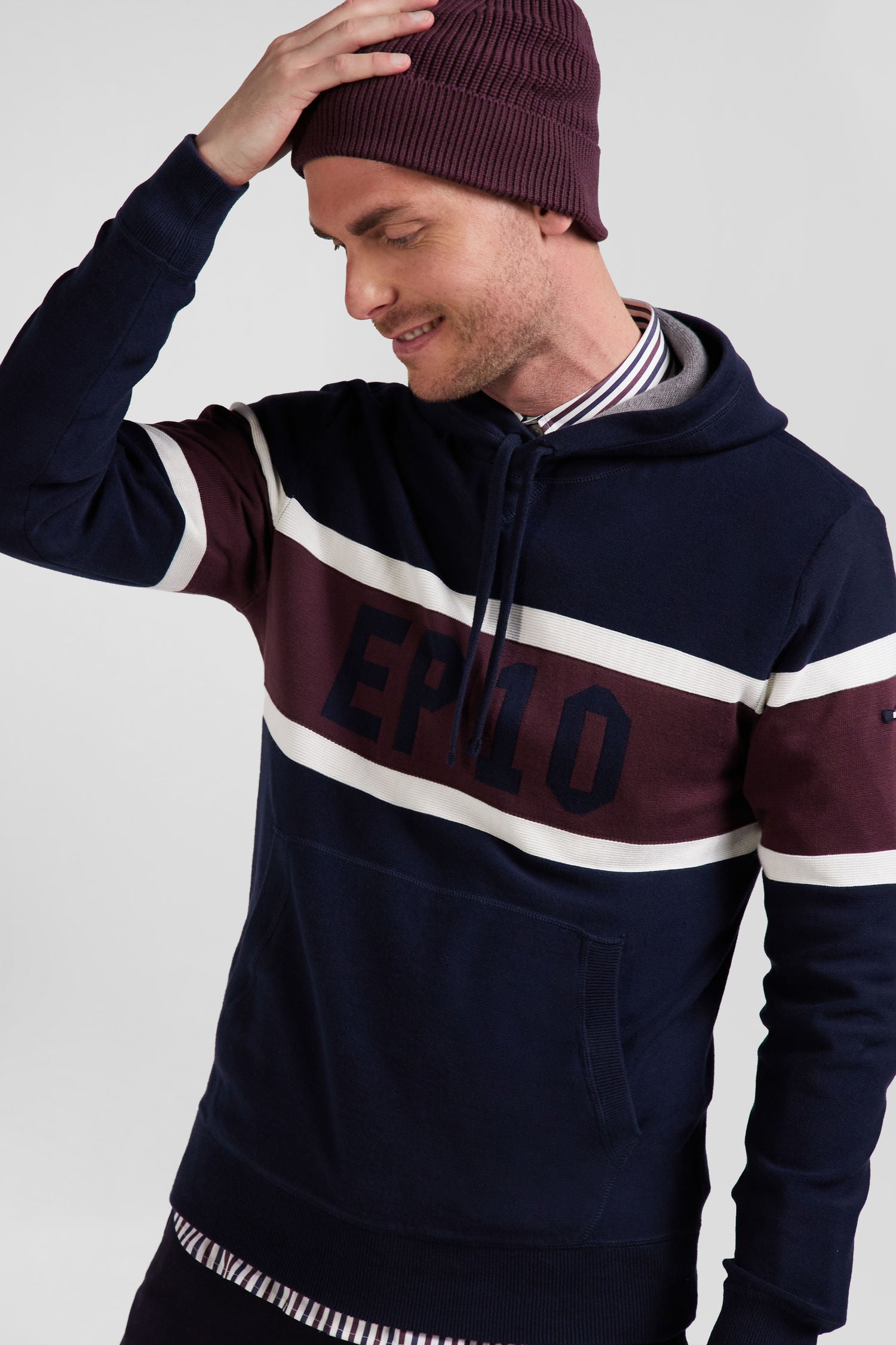 Work on your casual look with this hooded sweater, which skilfully combines contrasting knits for a dynamic visual effect. On the chest, a jacquard stripe highlights the EP 10 logo. Inspired by the sweatshirt with its ribbed trim, integrated hood, jersey body and reverse jersey half-moon, this sweater is the perfect blend of style and comfort.