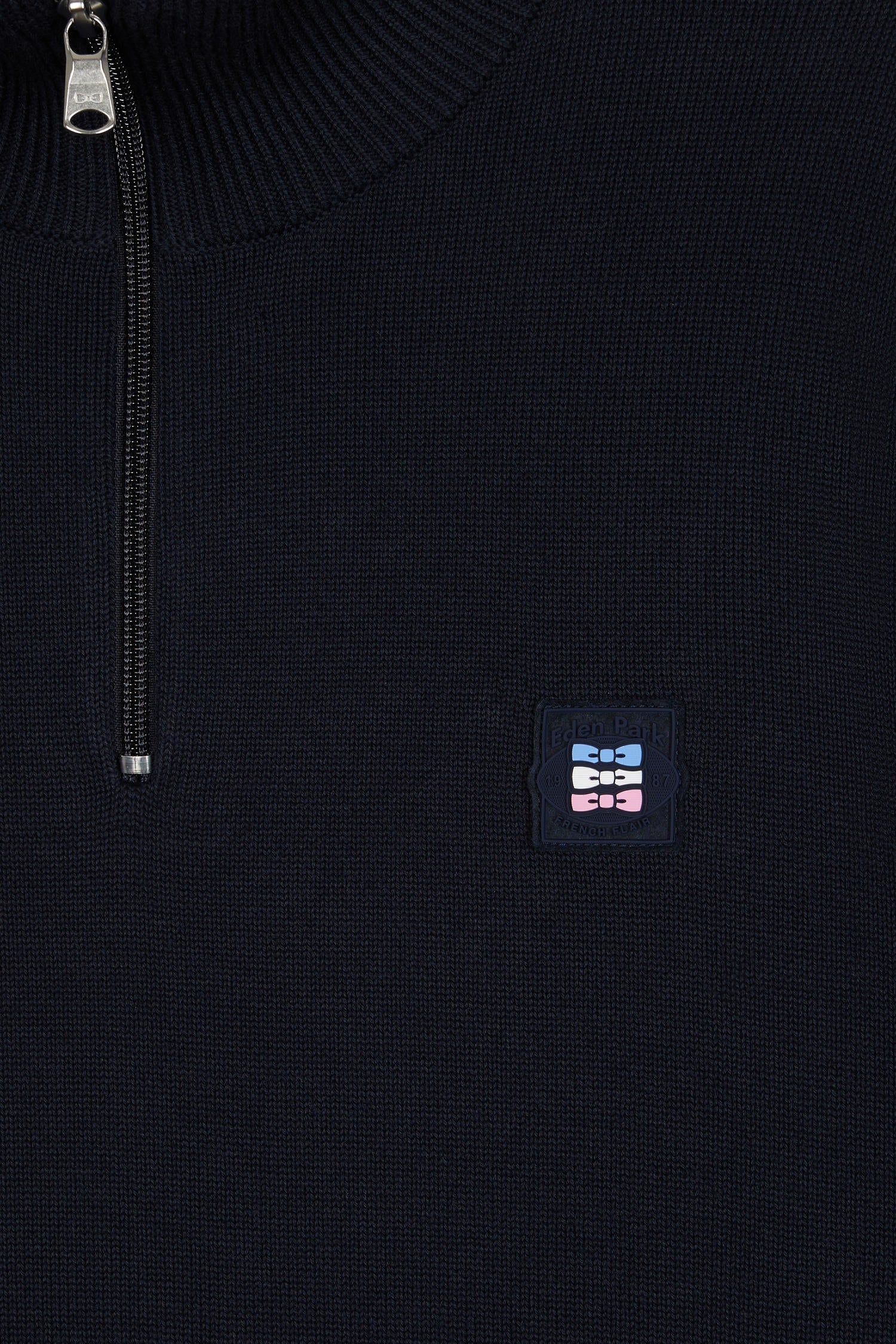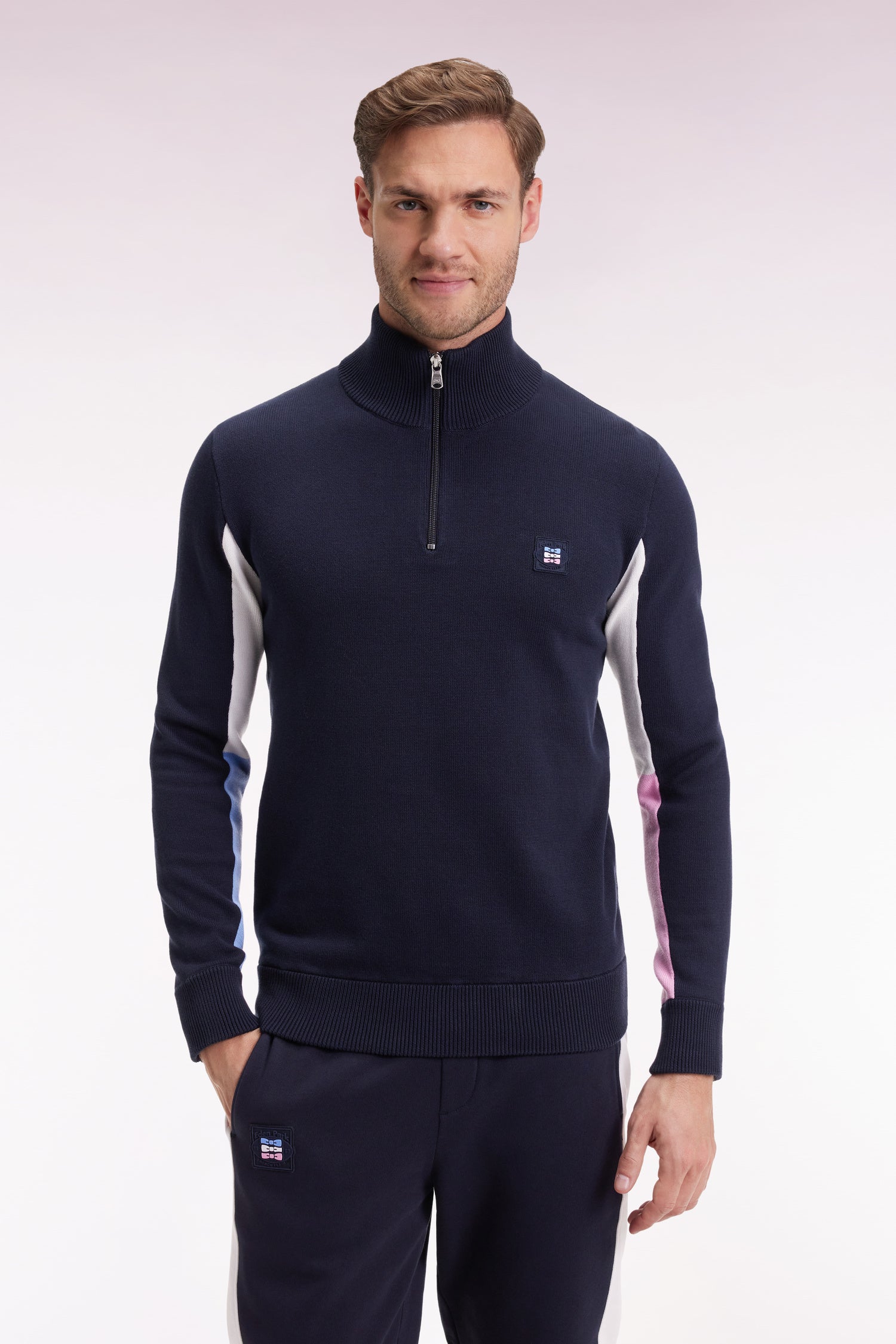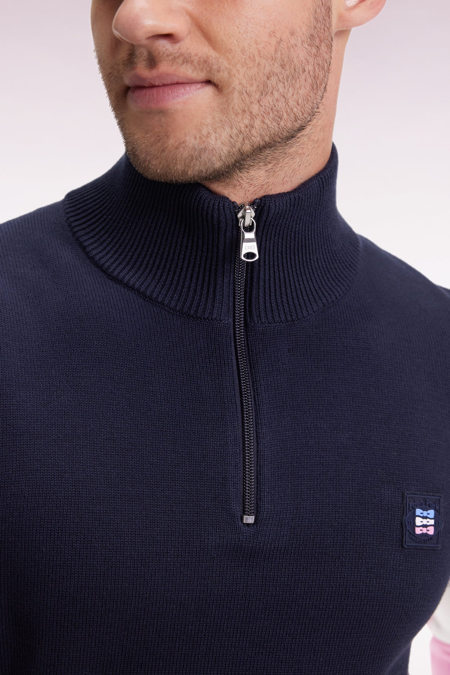 A graphic twist and a sporty-chic look for this trucker-neck zip sweater in soft cotton. True to the Eden Park spirit, this classic-looking model is distinguished by its colorful remaillage on the inside of the sleeves. This colorblock, created during the knitting process, is available in navy, sky and royal blue, or ecru, sky and pink: a typical Eden Park alternative. The comfortable straight cut, zipped stand-up collar with contrasting interior and meticulous finishing touches, including a gum badge on the chest and ribbed trims, make this model a strong piece in the men's wardrobe, ideal for energizing everyday silhouettes with elegance.