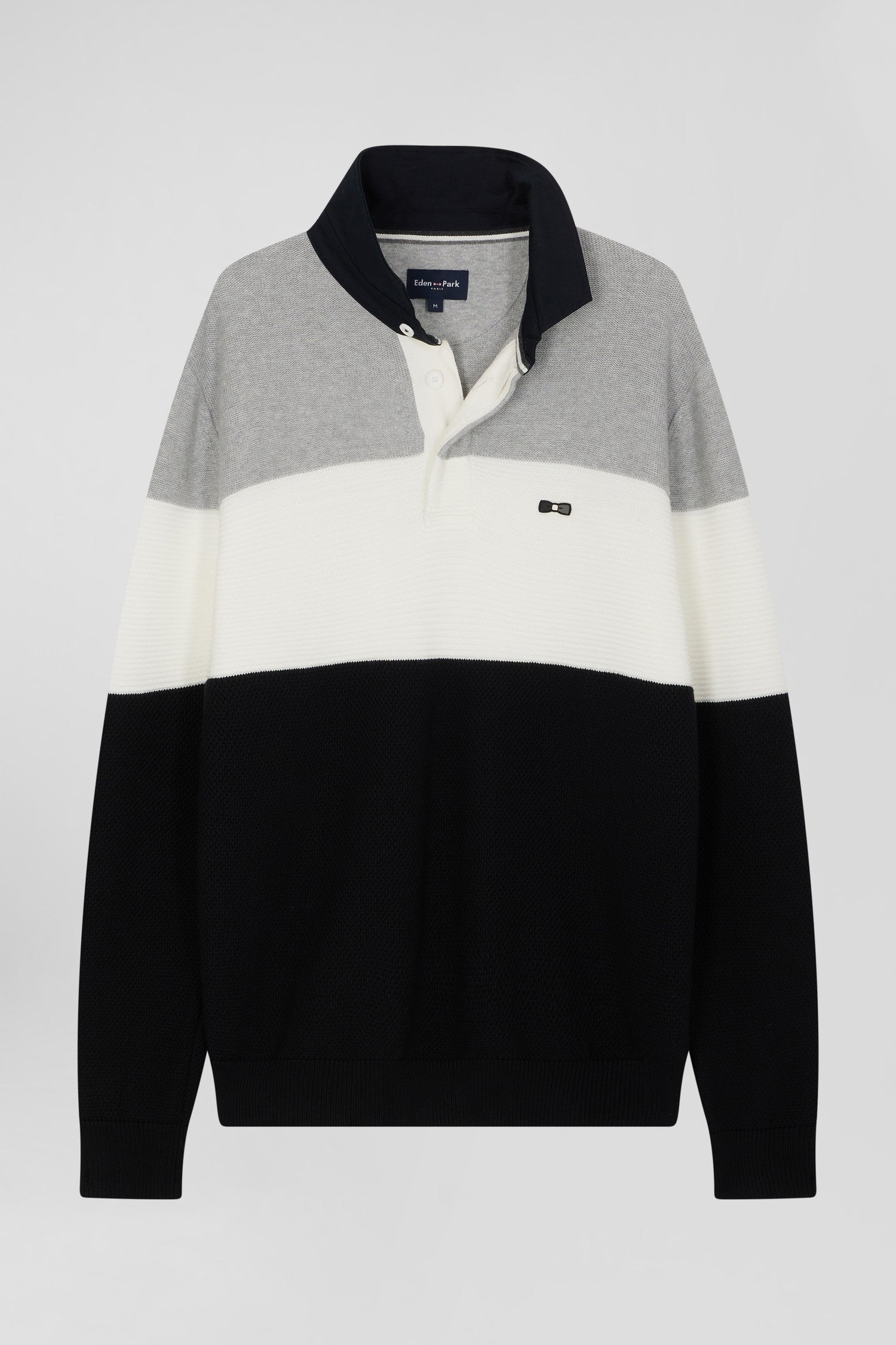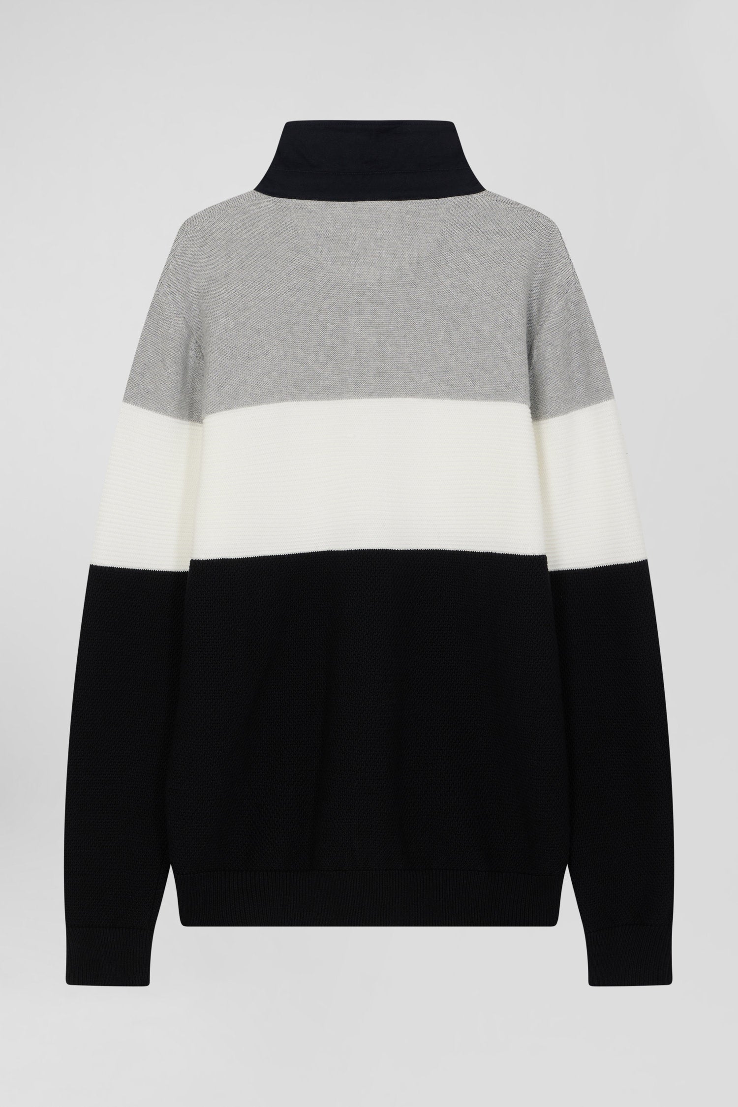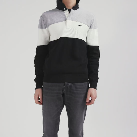 This sweater with twill jersey collar displays subtle sophistication with its contrasting interior stripes. Its jersey half-moon and tricolored ribbon knit enrich the interior, while the alternating textures created by the varied knitting (purl jersey stitches, Ottoman stitches and piqué) offer a captivating visual effect, combining style and comfort while drawing inspiration from our mythical rugby jerseys thanks to a cut and sewn assembly.