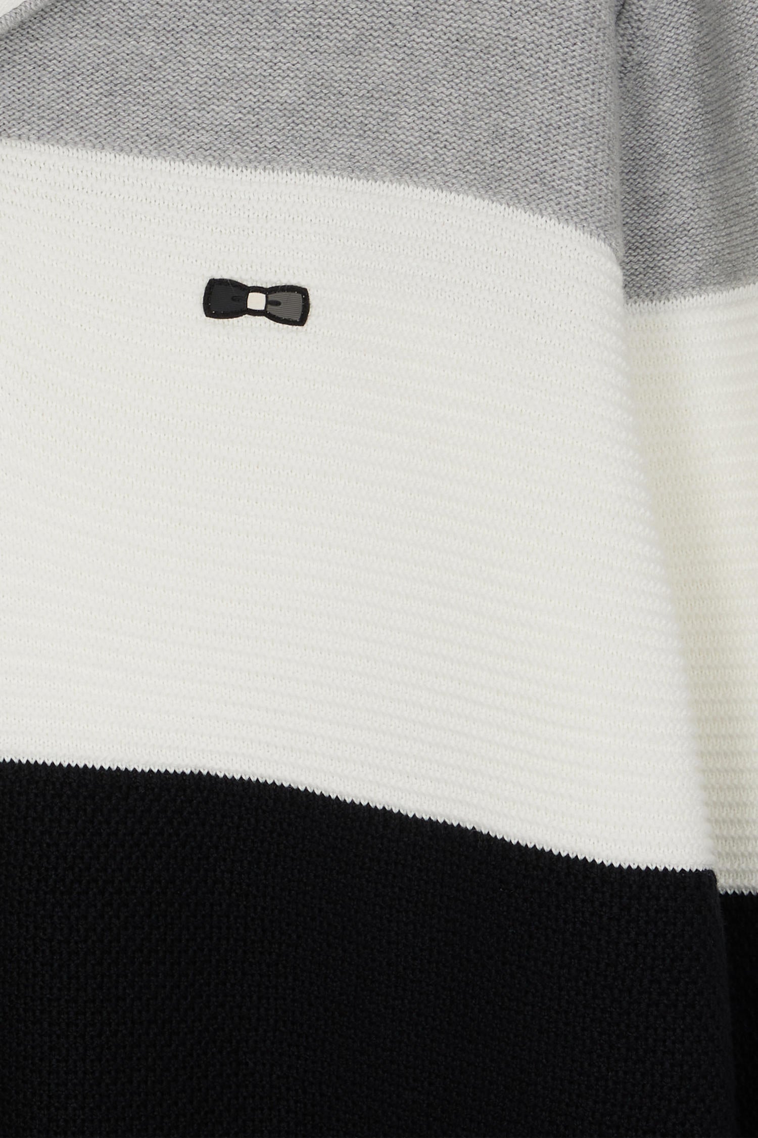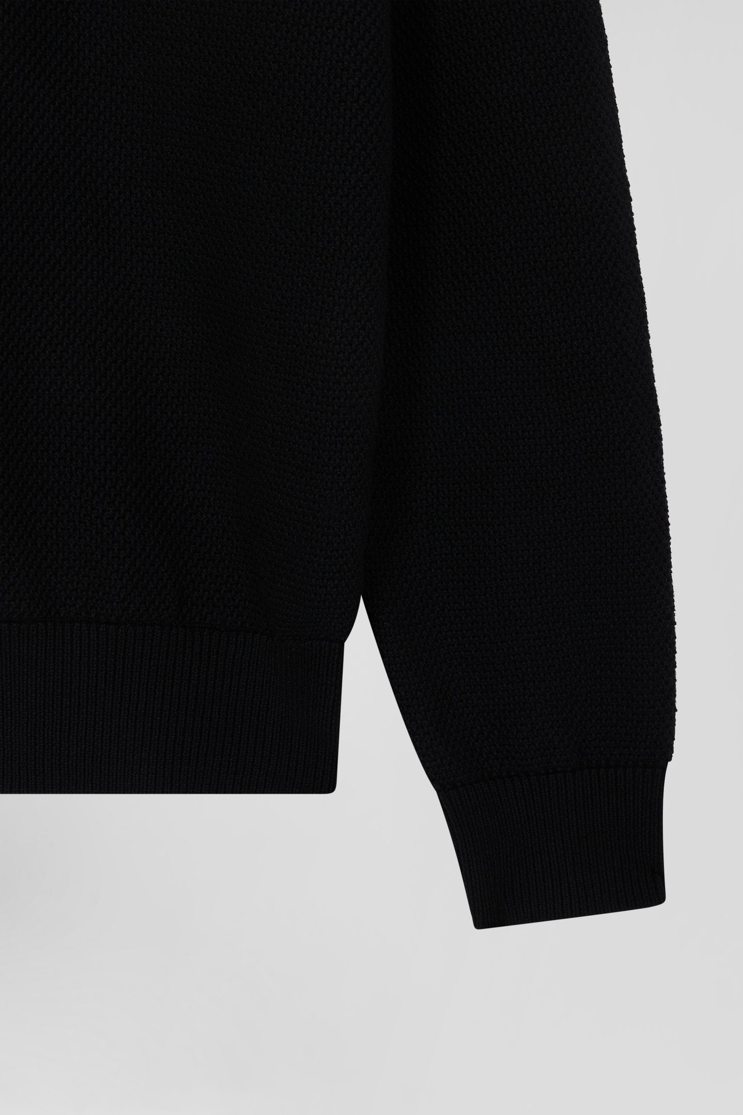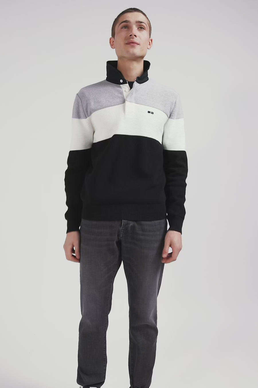 This sweater with twill jersey collar displays subtle sophistication with its contrasting interior stripes. Its jersey half-moon and tricolored ribbon knit enrich the interior, while the alternating textures created by the varied knitting (purl jersey stitches, Ottoman stitches and piqué) offer a captivating visual effect, combining style and comfort while drawing inspiration from our mythical rugby jerseys thanks to a cut and sewn assembly.