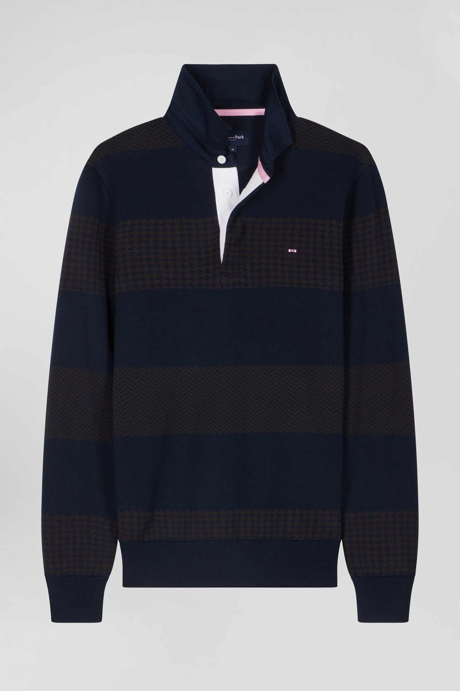 Regular brown striped cotton jumper with houndstooth jacquard and rugby shirt collar