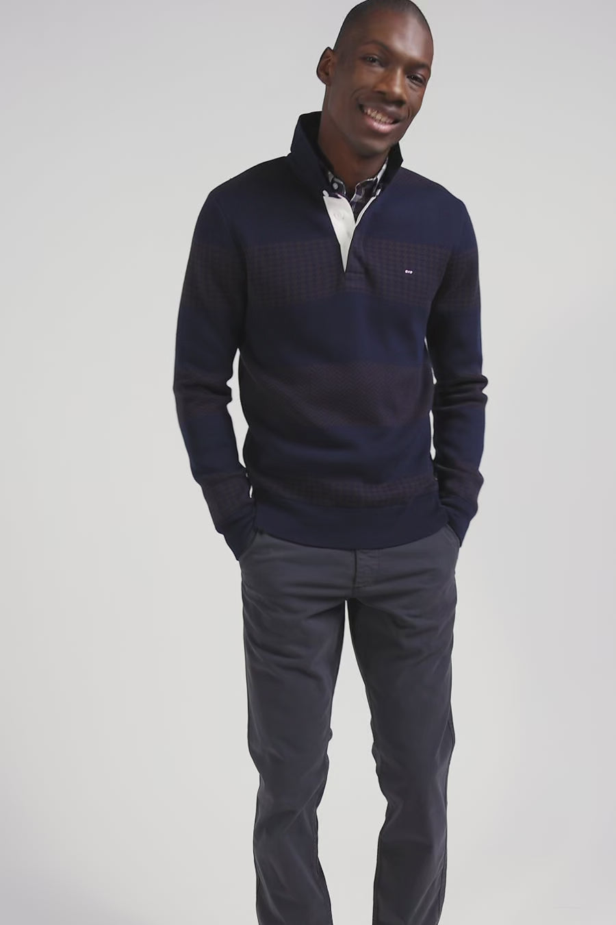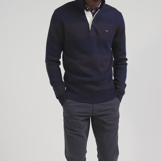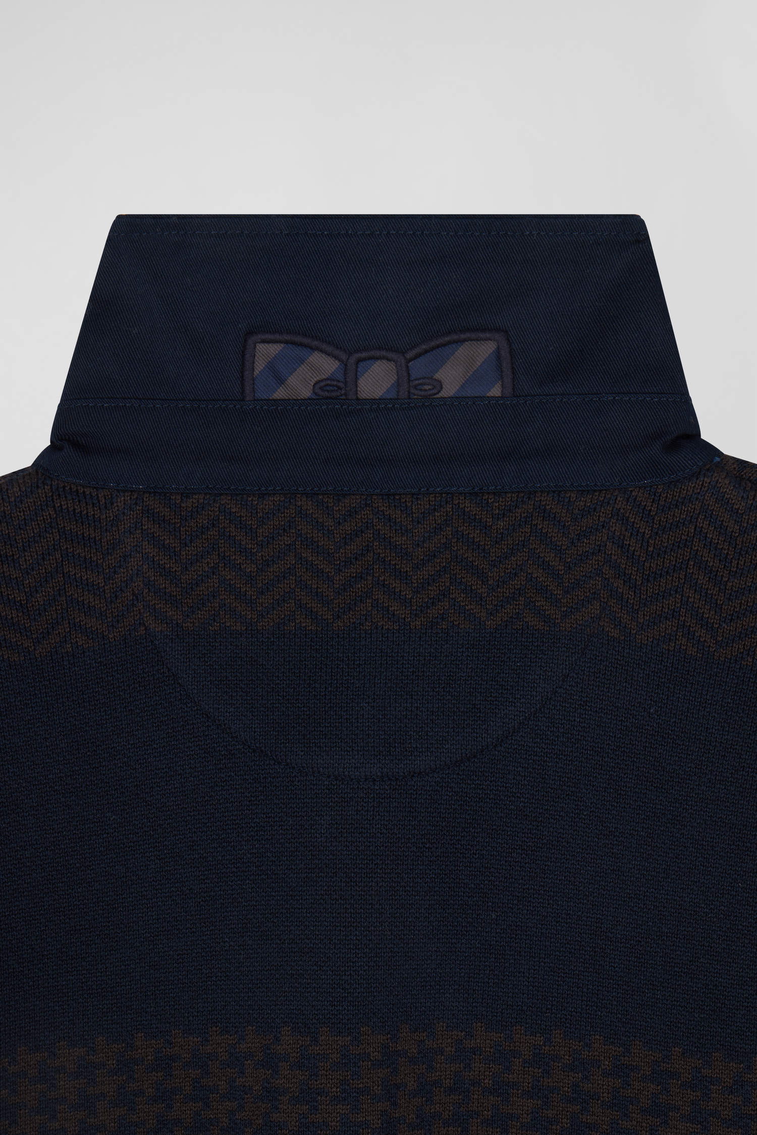 This men's cotton sweater features a twill jersey collar and a design inspired by our House's hooped jerseys. Here, stripes alternate between the houndstooth pattern and plain jacquard. This creative combination creates a unique visual dynamic. The jersey collar is enhanced by bow-tie embroidery at the back, complemented by an application of tie fabric for a distinct signature. The white ribbon placket underneath completes this men's sweater, brilliantly combining tradition and modernity.