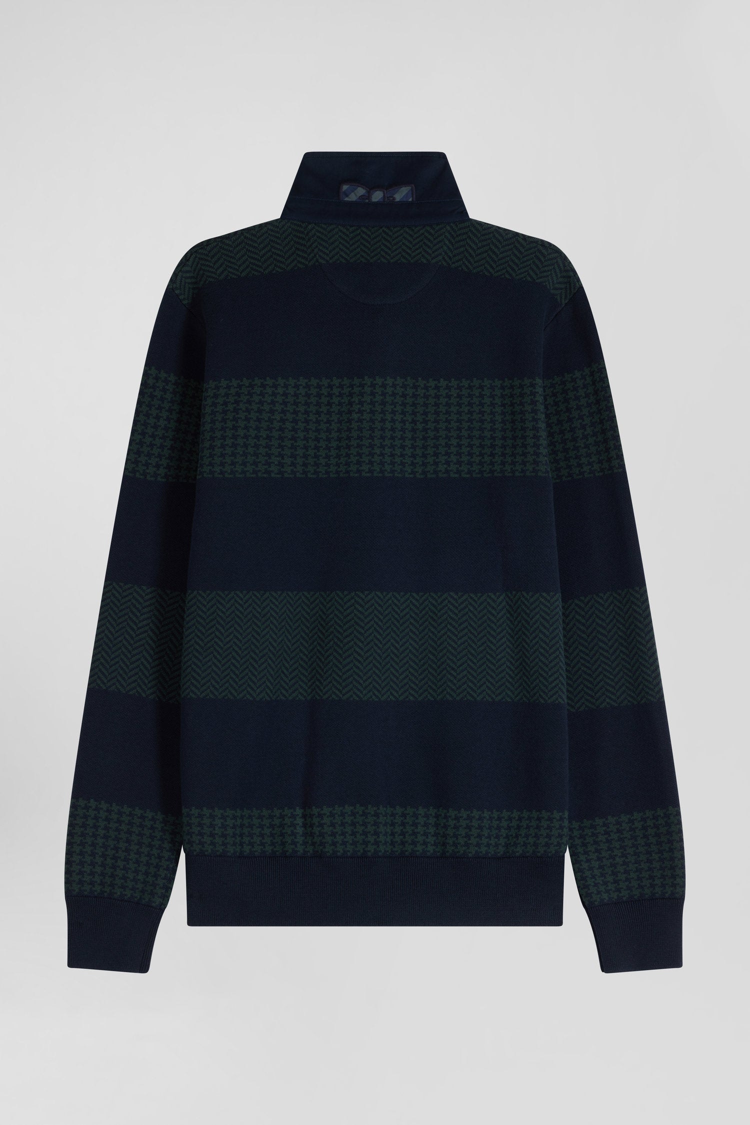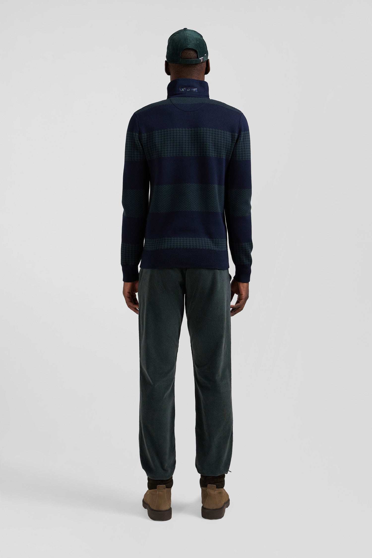Regular green striped cotton jersey jumper with houndstooth jacquard and and rugby shirt collar
