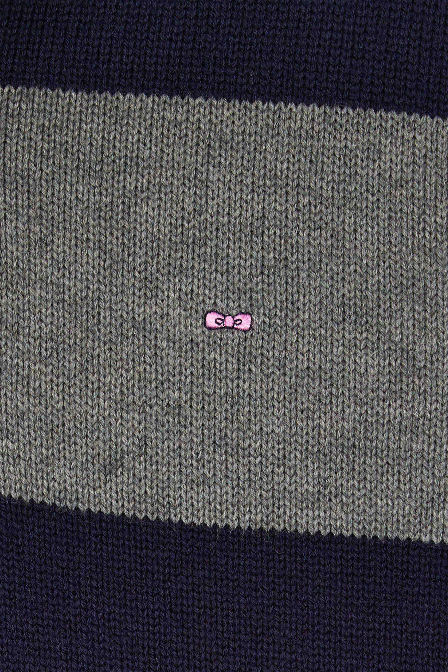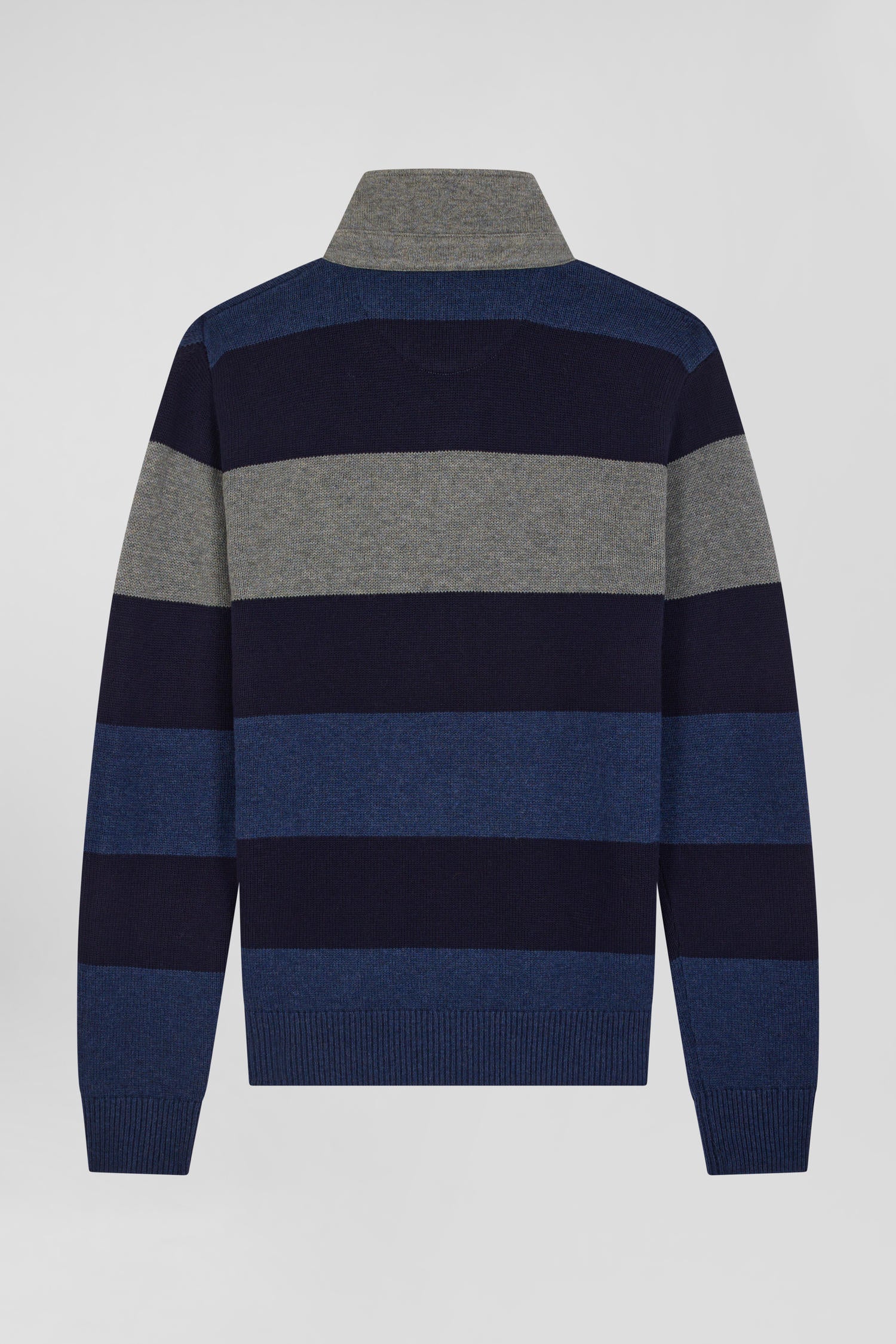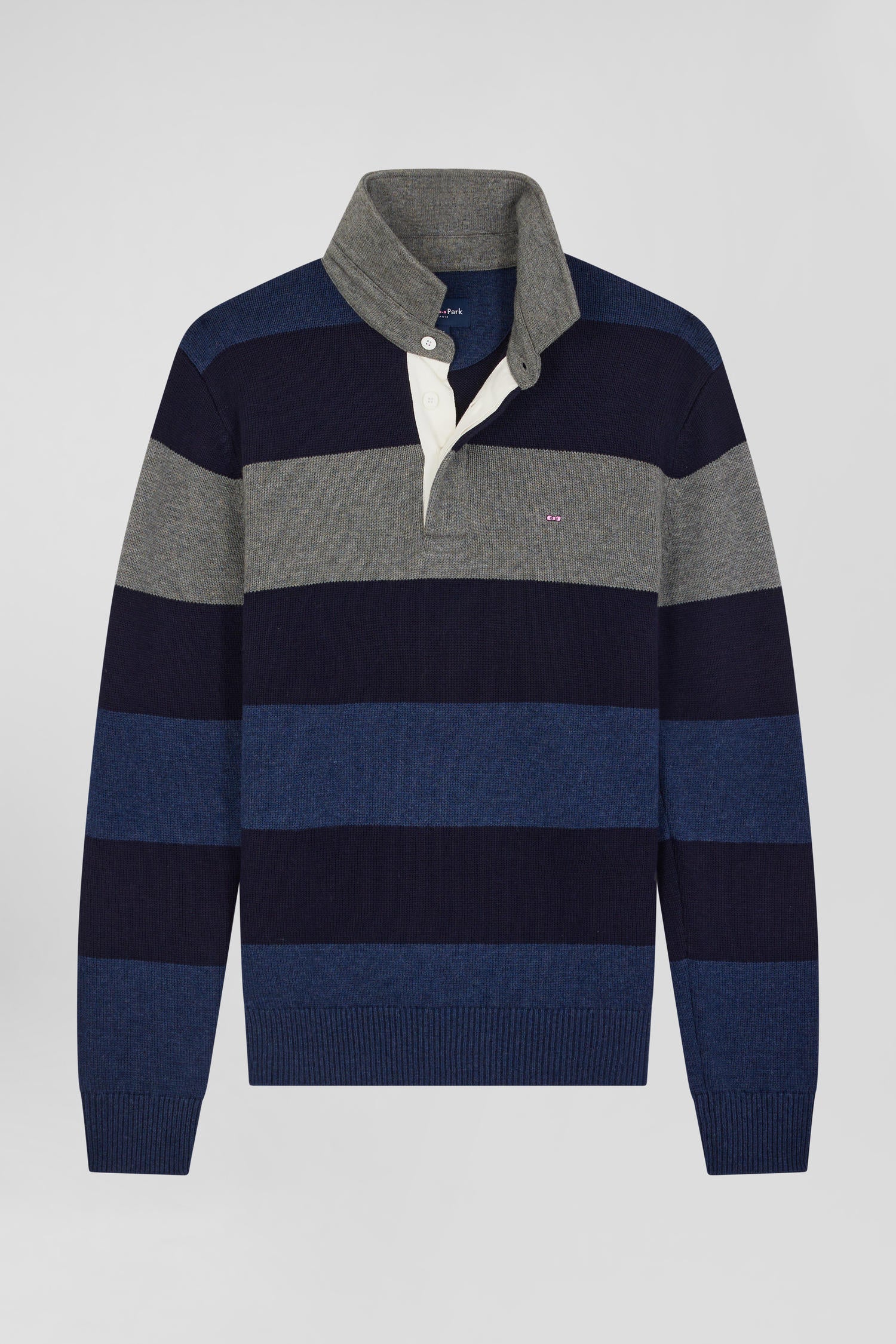 Our men's jersey-neck sweater, designed in a harmonious blend of wool and cotton, offers both warmth and softness. This sweater features a jersey half-moon and a tricolored knitted liner ribbon on the inside, adding a refined touch and a nod to our sporting heritage. The effect of contrasting dots enriches the design of this sweater, while its horizontal stripes, inspired by rugby jerseys, bring a sporty and authentic spirit to this masculine sweater.