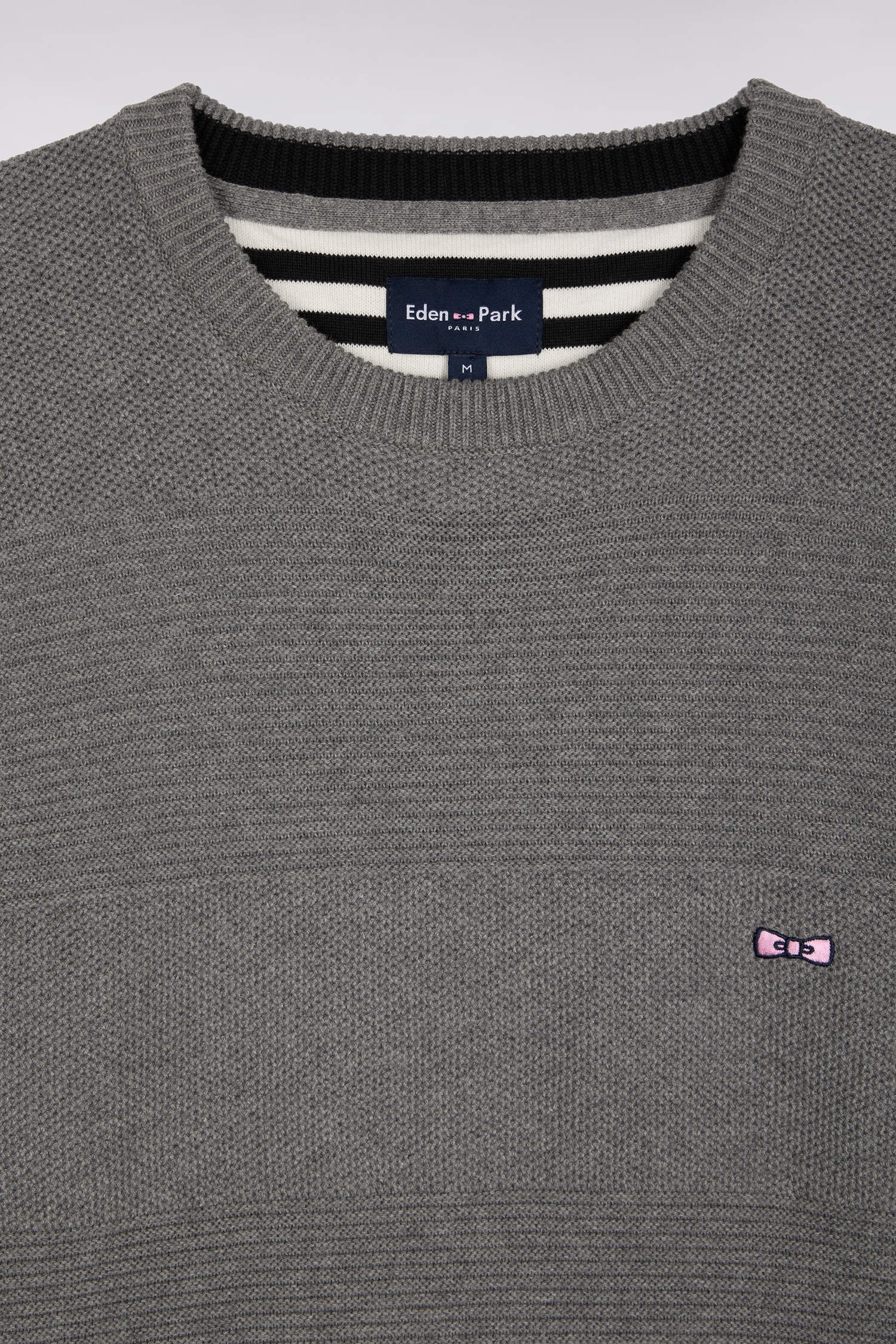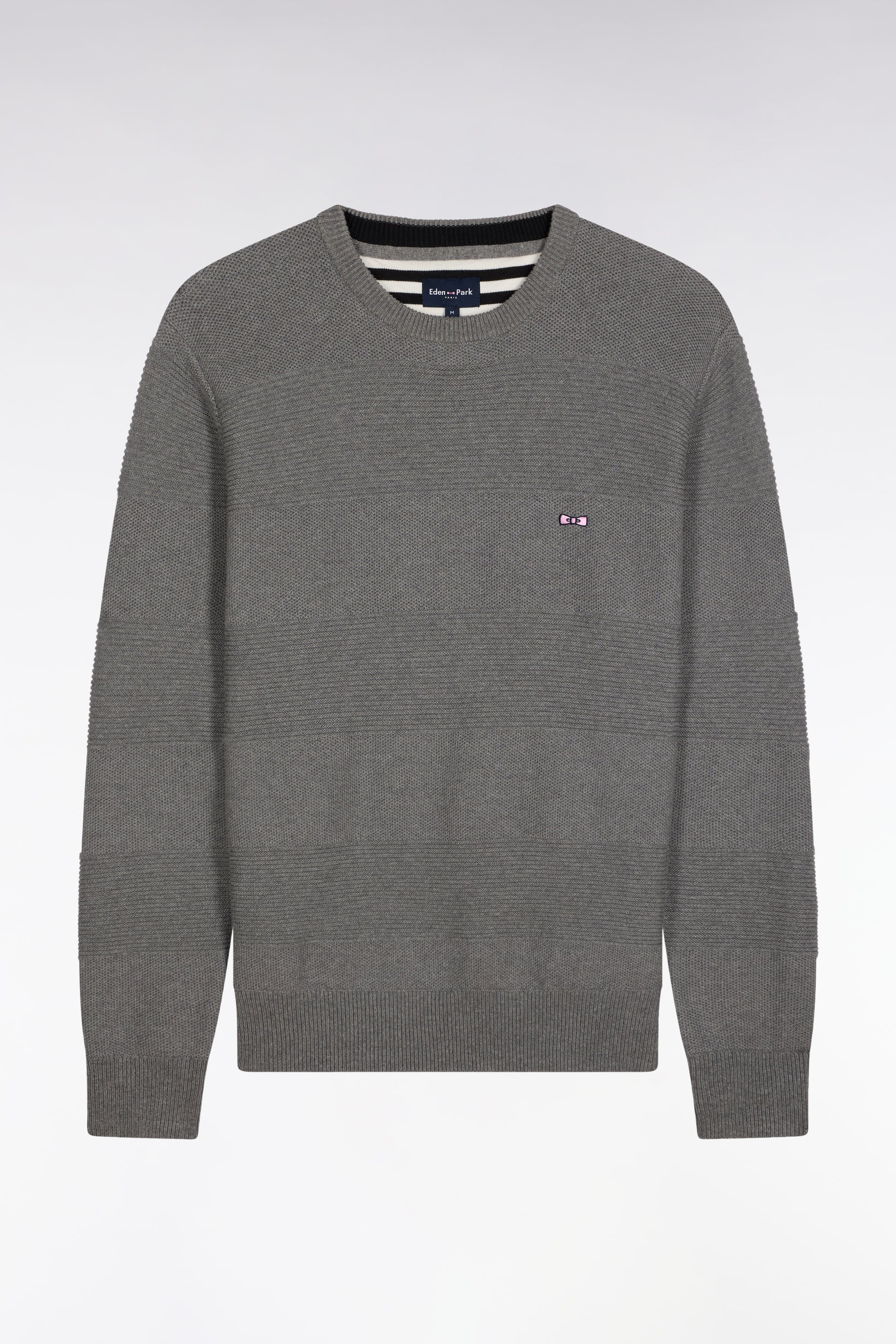 With its alternating ribbed stitch and honeycomb knit, this men's round-neck sweater in pure cotton revisits rugby stripes in a subtly textured version that pays tribute to the expertise of the company's workshops. The straight cut, bow-tie embroidery and meticulous finishing touches, such as the striped half-moon, make it an Eden Park wardrobe essential: a chic, timeless synthesis of our sporting heritage and our French Flair sense of masculine elegance. This model is available in 4 colors