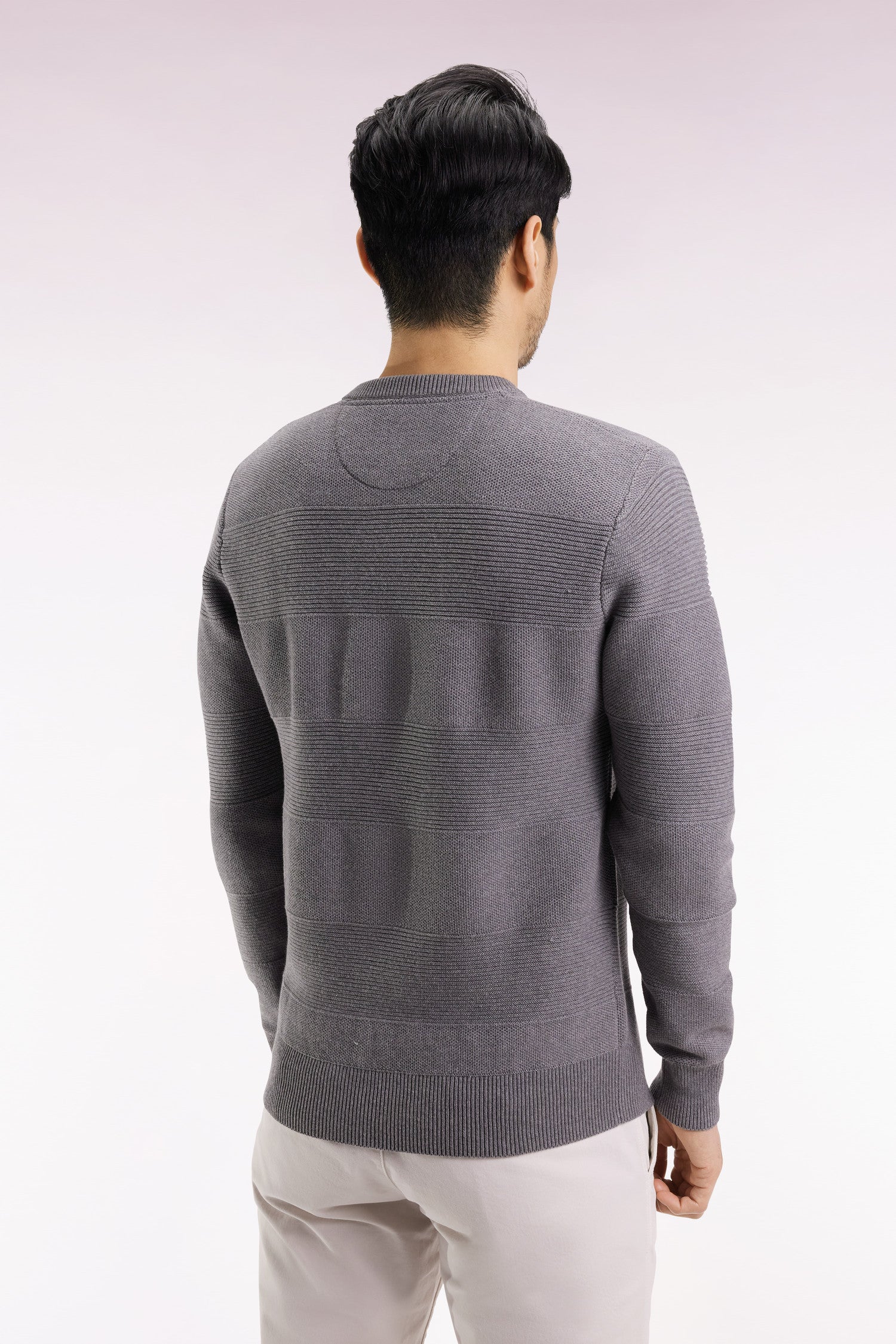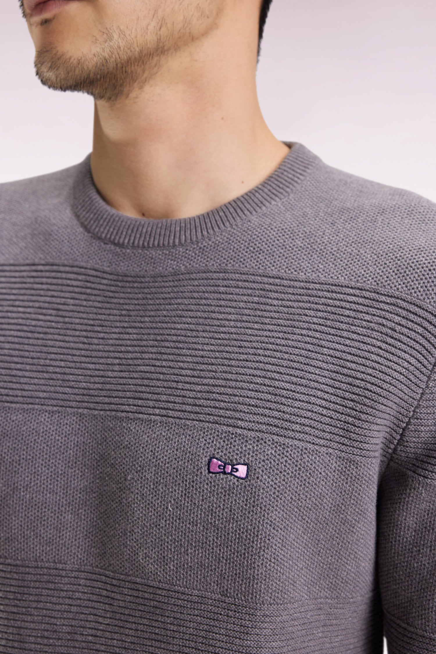 Grey cotton round-neck sweater with stripe effect