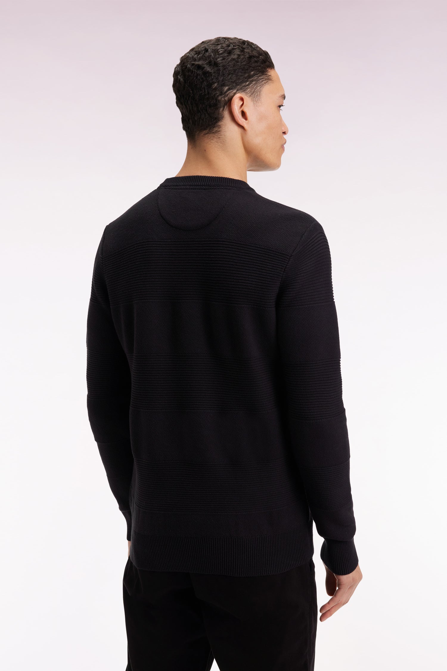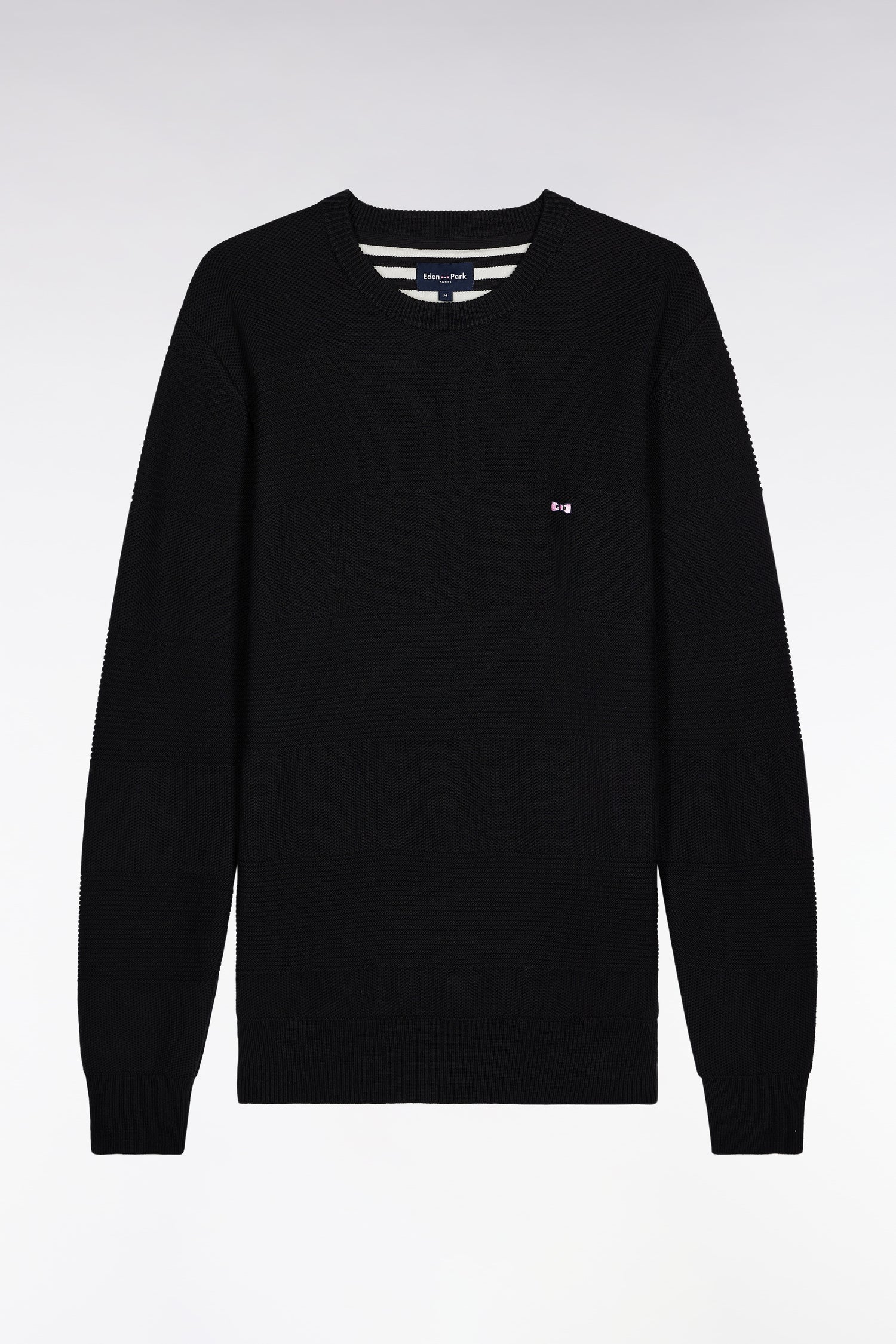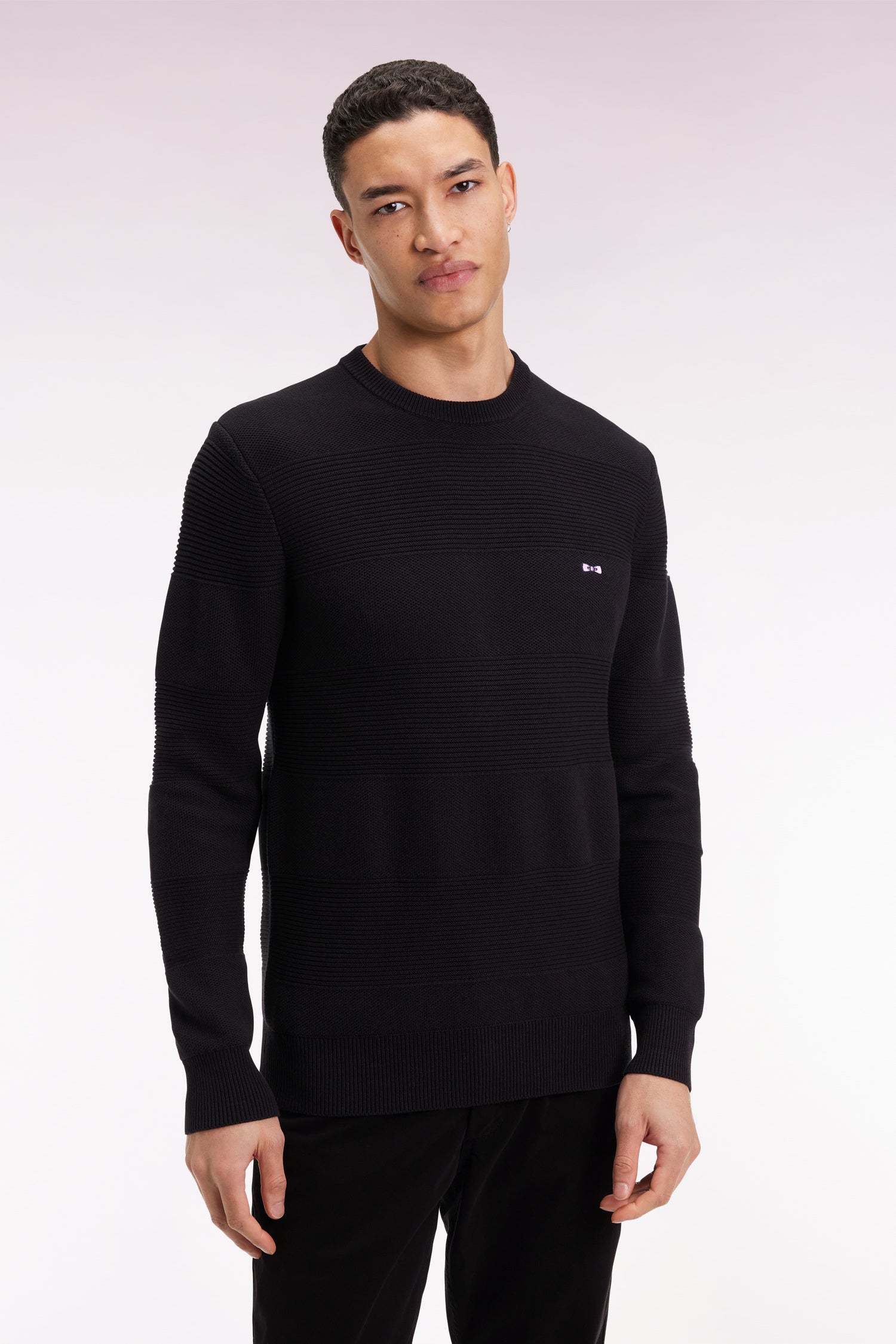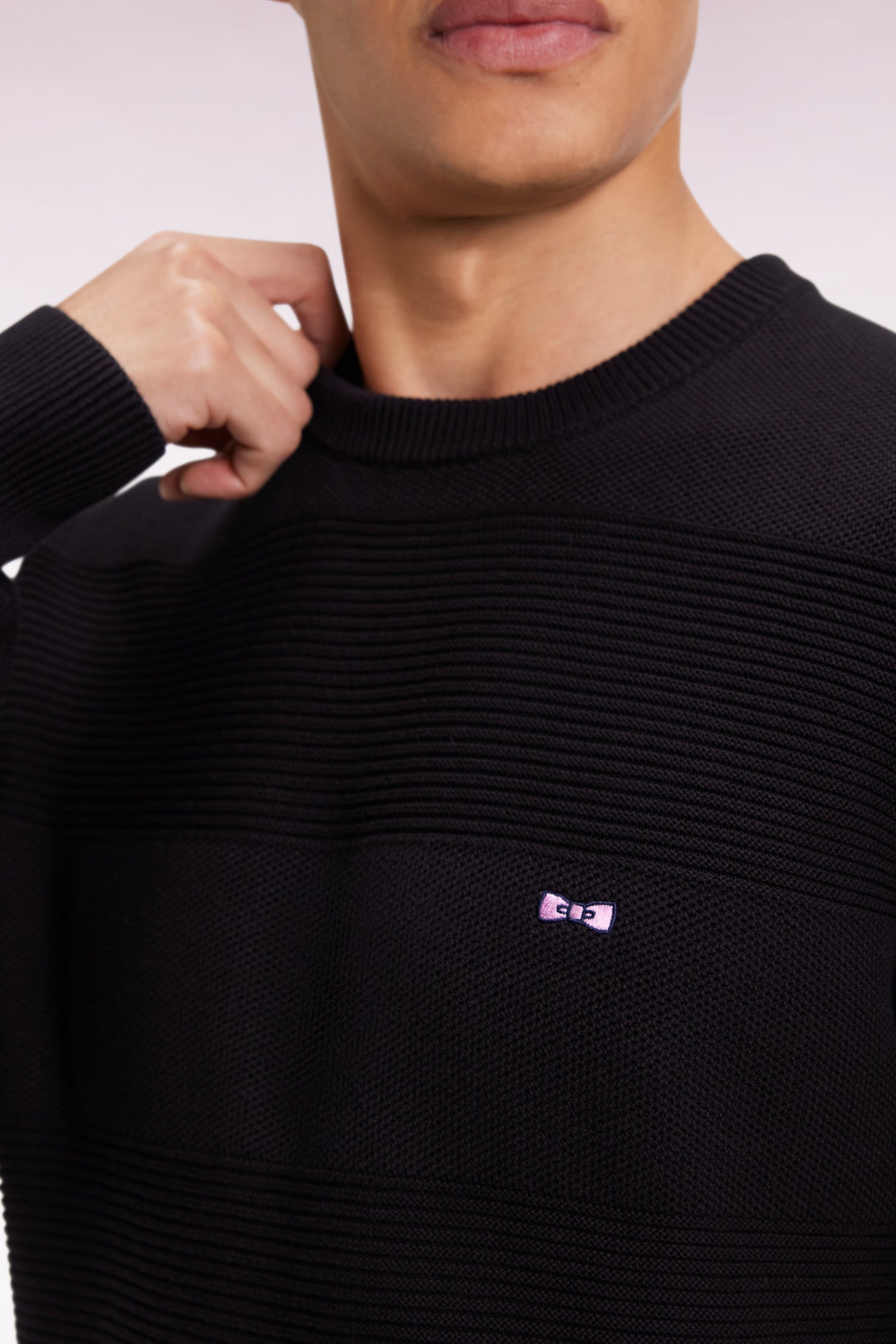 With its alternating ribbed stitch and honeycomb knit, this men's round-neck sweater in pure cotton revisits rugby stripes in a subtly textured version that pays tribute to the expertise of the company's workshops. The straight cut, bow-tie embroidery and meticulous finishing touches, such as the striped half-moon, make it an Eden Park wardrobe essential: a chic, timeless synthesis of our sporting heritage and our French Flair sense of masculine elegance. This model is available in 4 colors