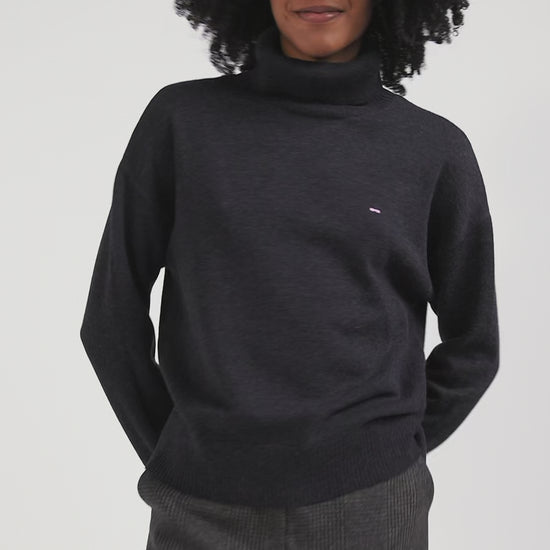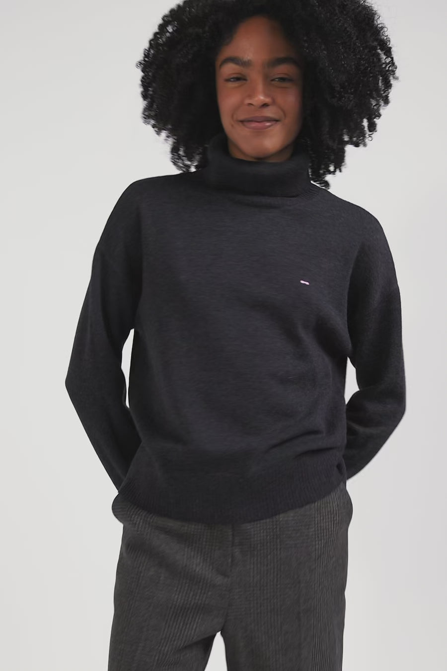 This plain turtleneck sweater, designed in a comfortable blend of natural fibers combining 55% wool and 45% cotton, combines warmth and softness. Featuring ribbed edges for a neat finish and perfect fit, this feminine, slightly loose-fitting sweater is adorned with Eden Park's signature discreet bow-tie embroidery. Available in six timeless colors, this soft turtleneck sweater is ideal for enhancing your winter wardrobe with elegance and simplicity.