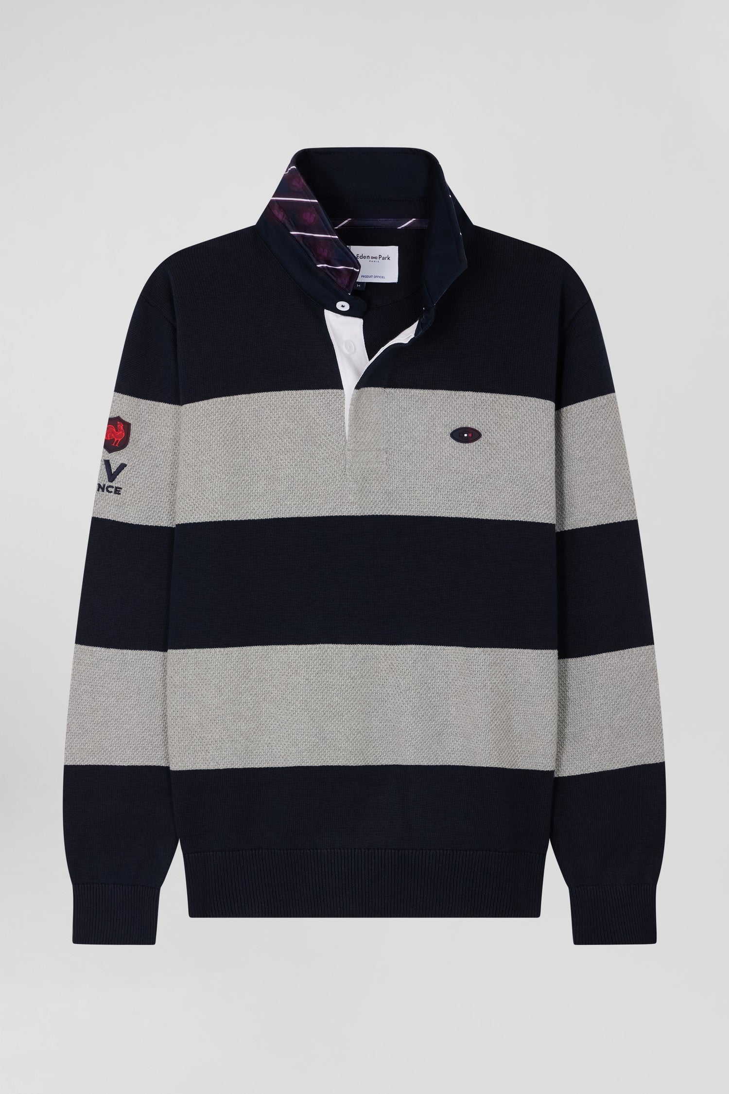 This jersey-neck sweater with hooped stripes brilliantly combines the elegance and sporting spirit of our House. The underside of the collar, adorned with a striped tie fabric, is enriched with embroidery and silicone rubber badges representing Eden Park emblems and those of the XV de France, this 100% cotton piece marries innovation and tradition.
