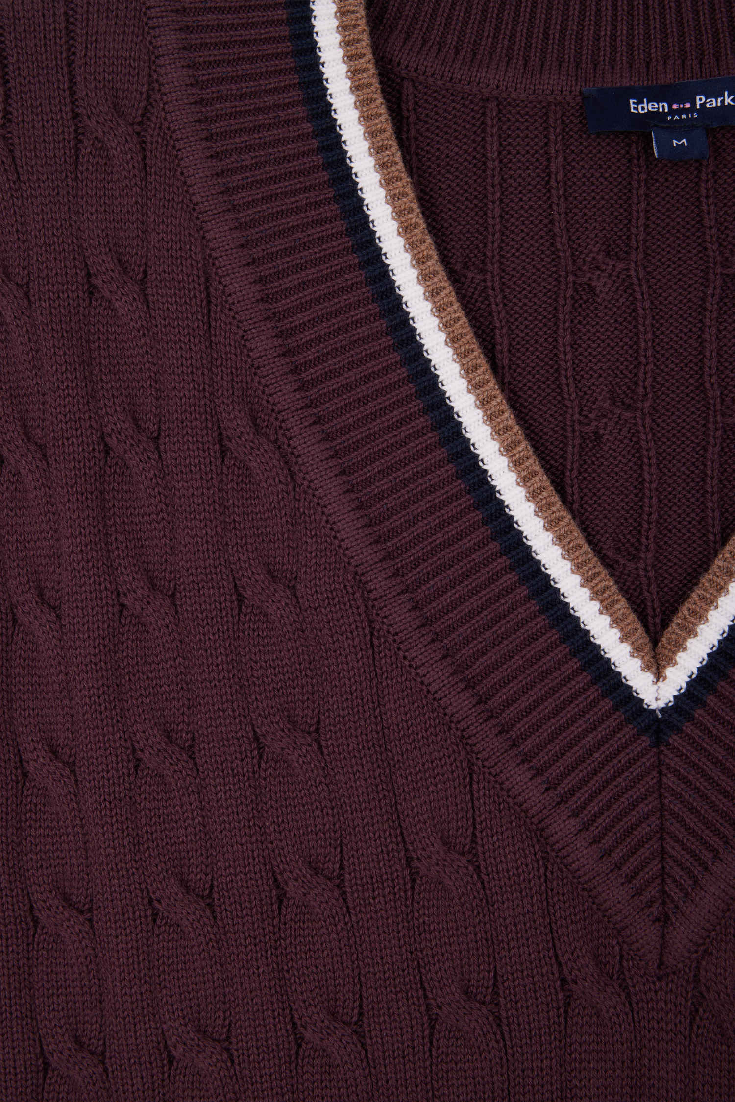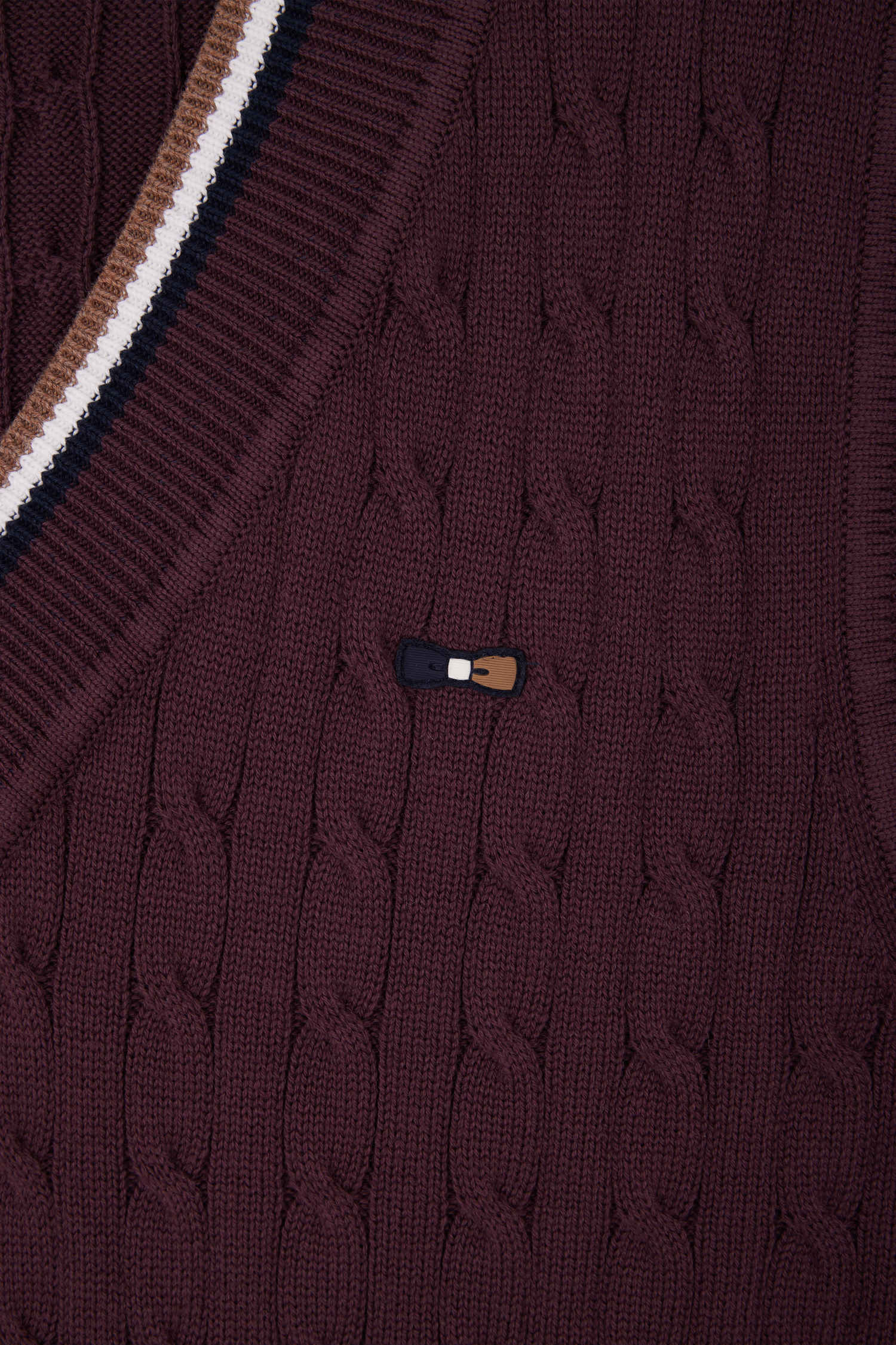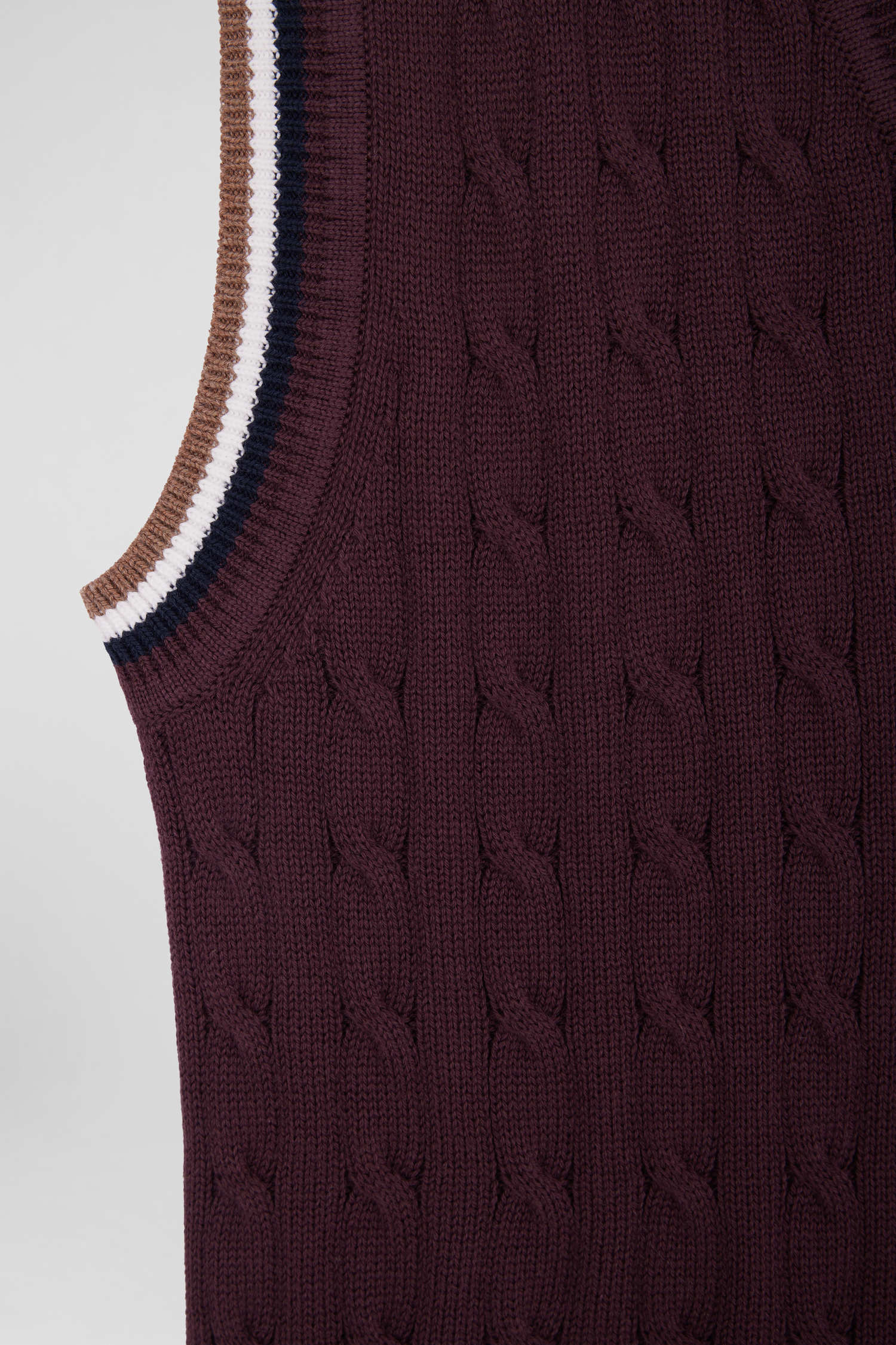 Relaxed burgundy cable-knit cotton V-neck sleeveless jumper