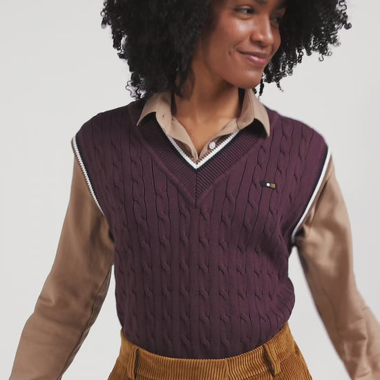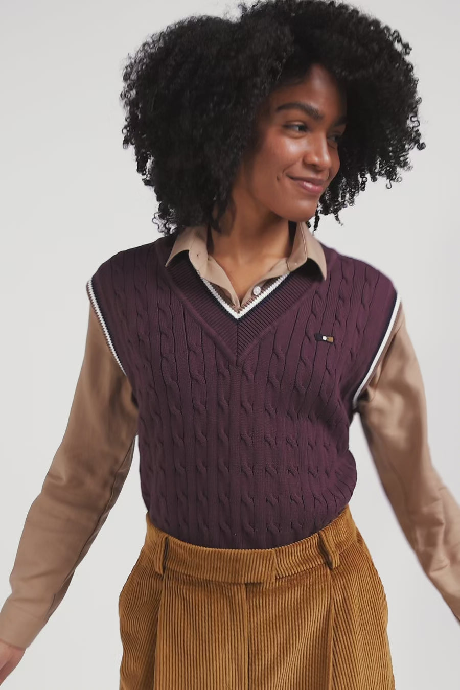 Opt for a sporty-chic look with our women's sleeveless cable-knit sweater, perfect as a layering piece or worn on its own. This model features elegant contrast piping at the V-neck and sleeve edges, adding a touch of refinement. The classic twists offer a play of texture, making this sleeveless sweater an essential, ideal over a shirt for a sophisticated look or next to the skin for an on-trend outfit.