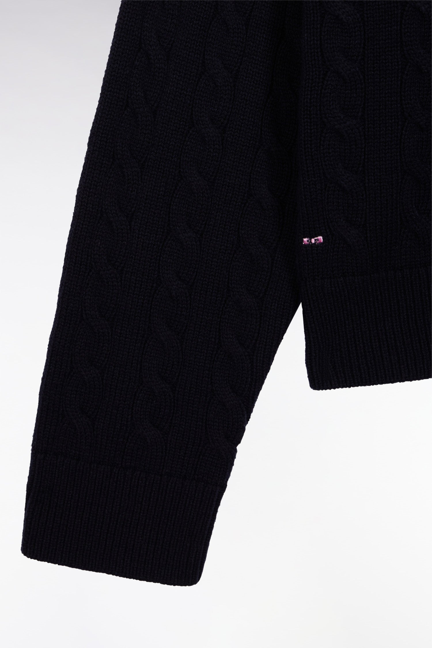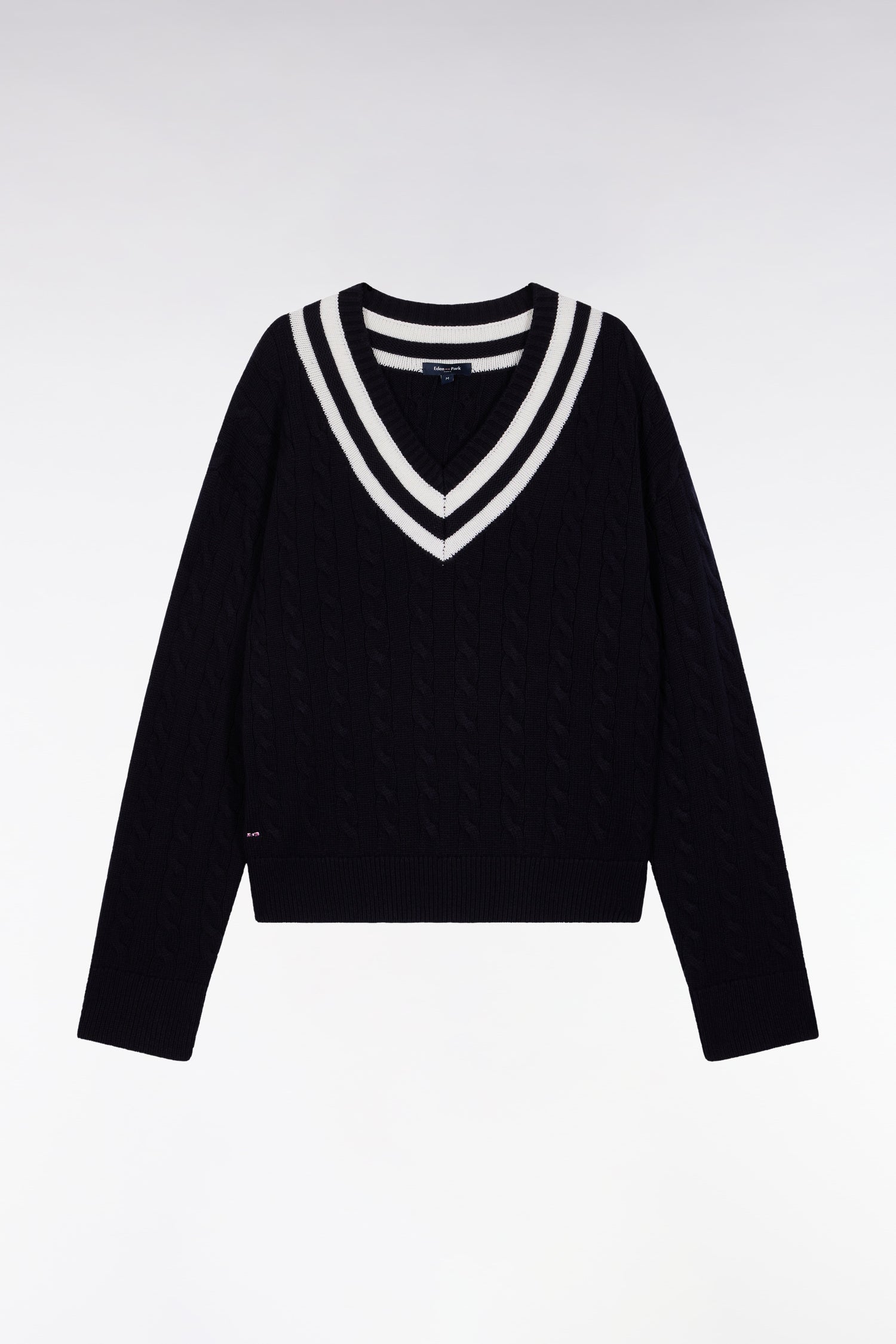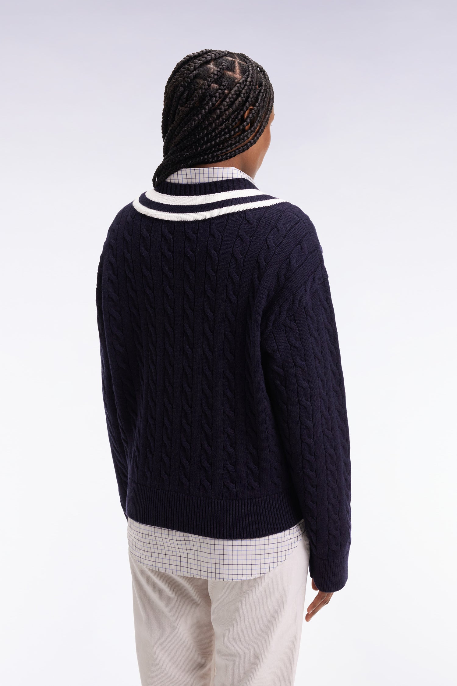 Inspired by the most elegant sports fields, this cricket sweater revisits the iconic V-neck with contrasting stripes in a contemporary oversized cut. Knitted in a navy twisted knit with the enveloping softness of wool and cotton, this women's sweater blends preppy spirit and urban style. Wear with a shirt accessorized with a tie and wide-leg pants to cultivate the casual elegance so typical of our house.