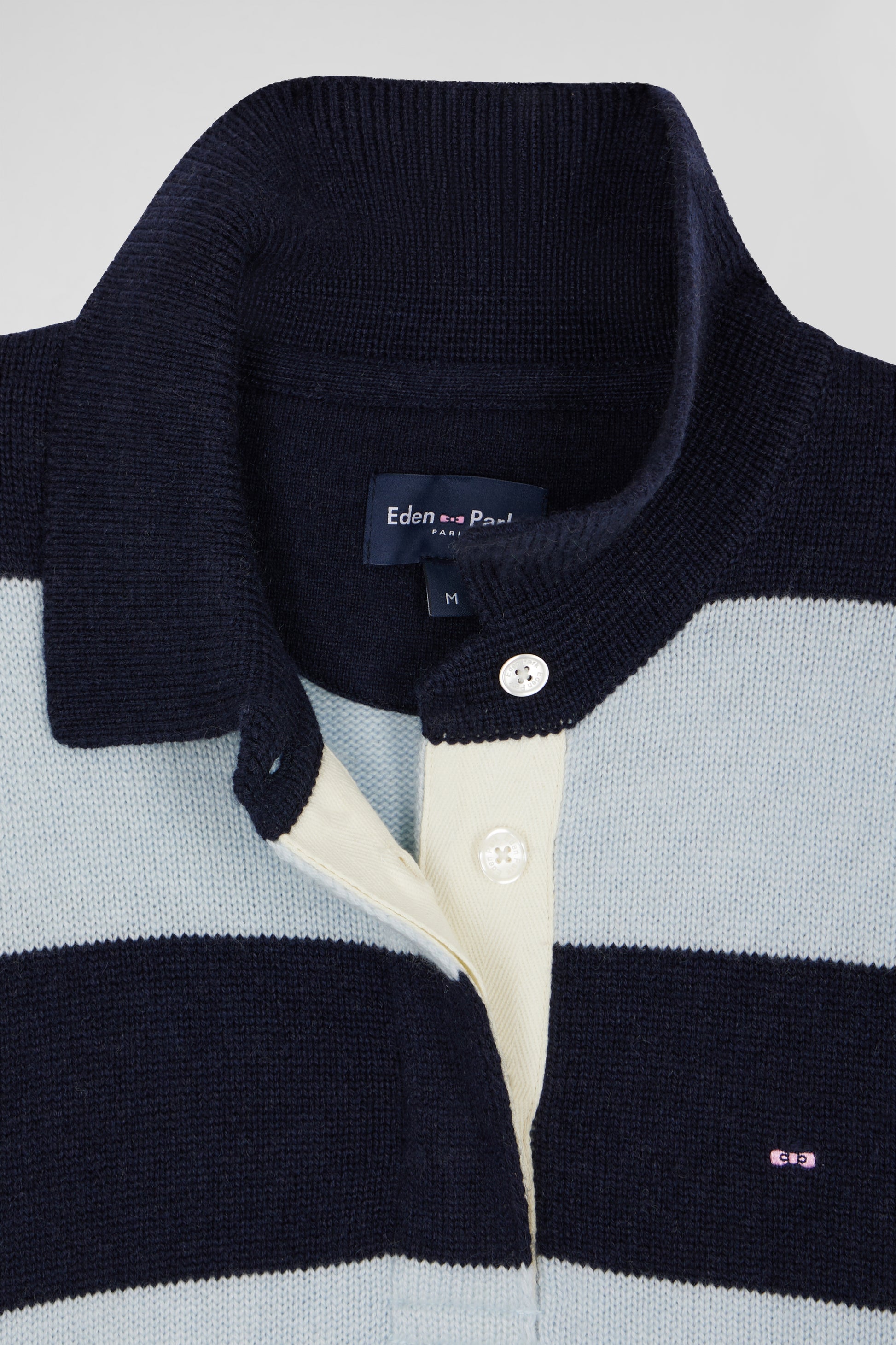 Add a modern touch to your winter wardrobe with this women's striped sweater, the perfect embodiment of Eden Park style. Crafted in wool and cashmere, it features elegant light blue and navy stripes, enhanced by a contrasting collar. Its relaxed fit and refined design make it ideal for a chic, cosy look, whether at the office or at the weekend.