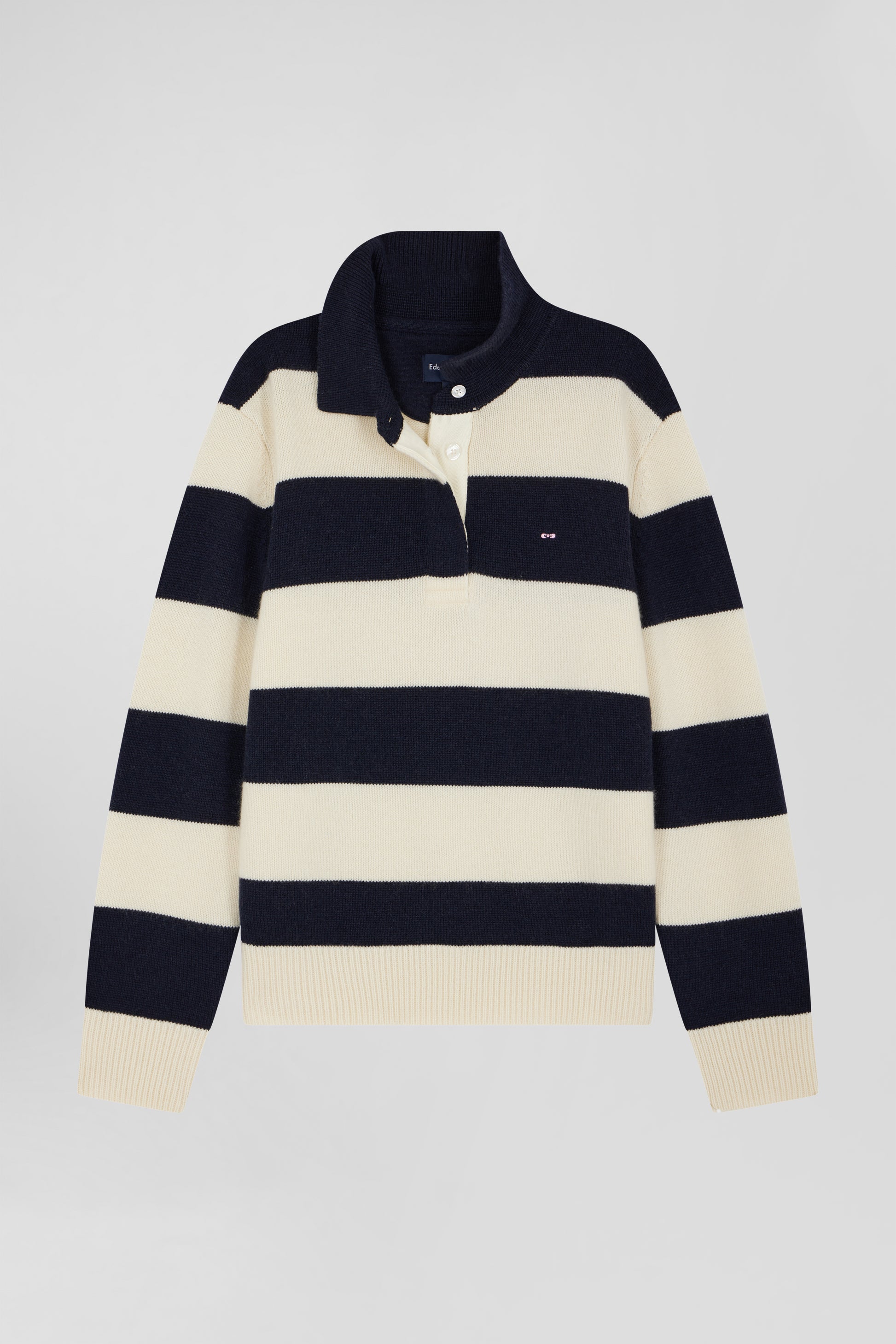 Add a modern touch to your winter wardrobe with this women's striped sweater, the perfect embodiment of Eden Park style. Crafted in wool and cashmere, it features elegant navy and ecru stripes, enhanced by a contrasting collar. Its relaxed fit and refined design make it ideal for a chic, cosy look, whether at the office or at the weekend.