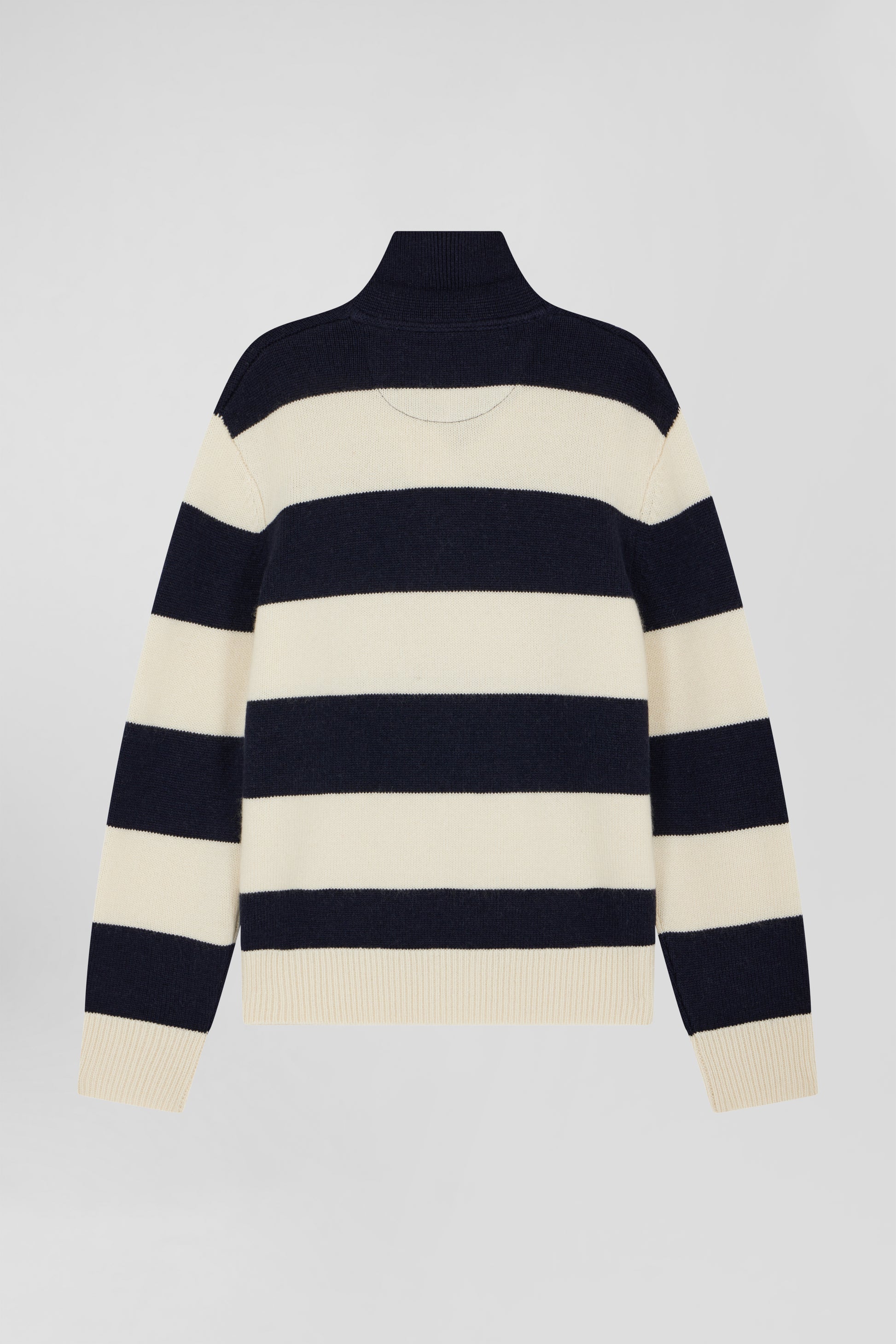Navy blue and ecru striped wool and cashmere polo-neck sweater