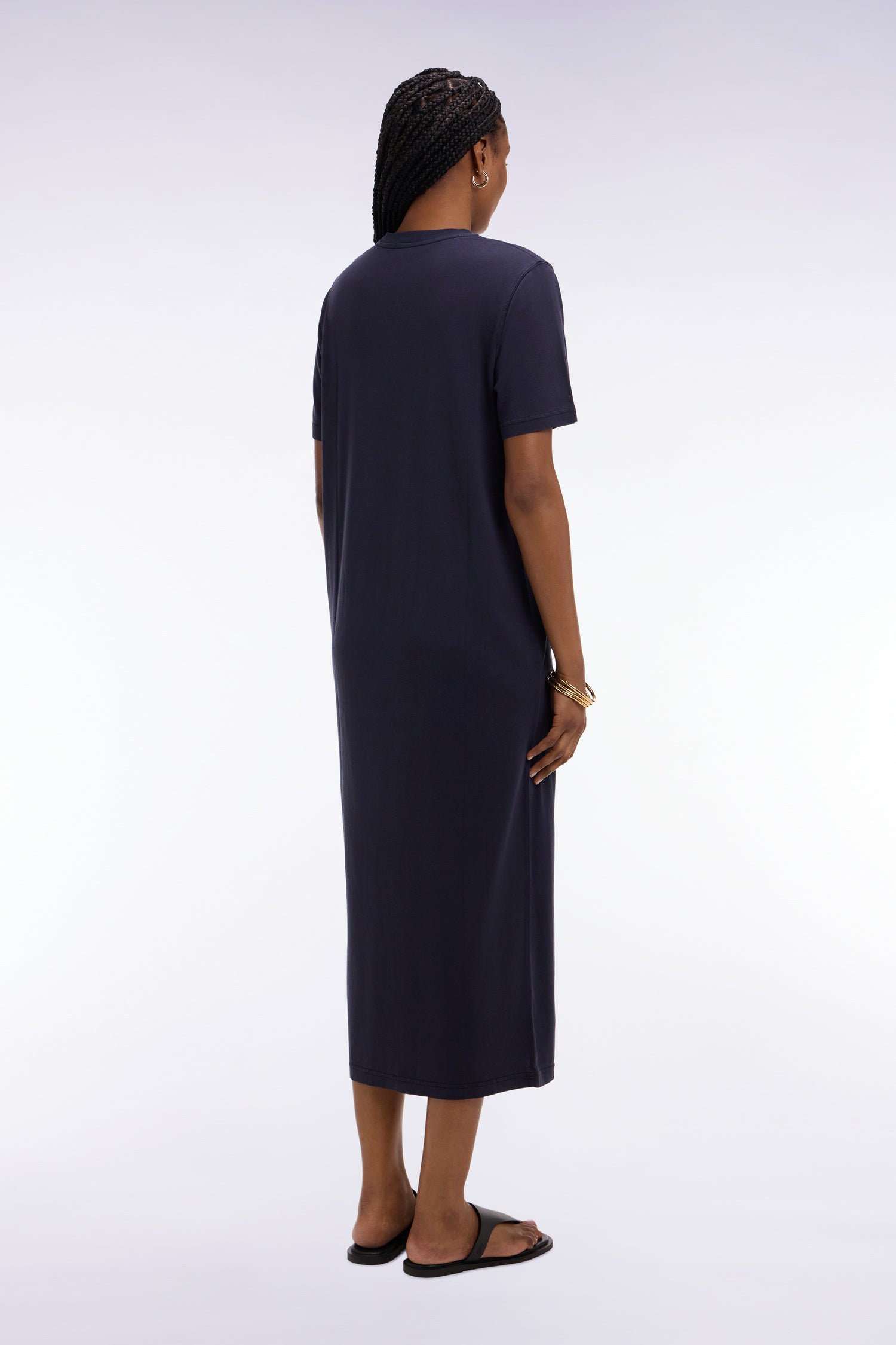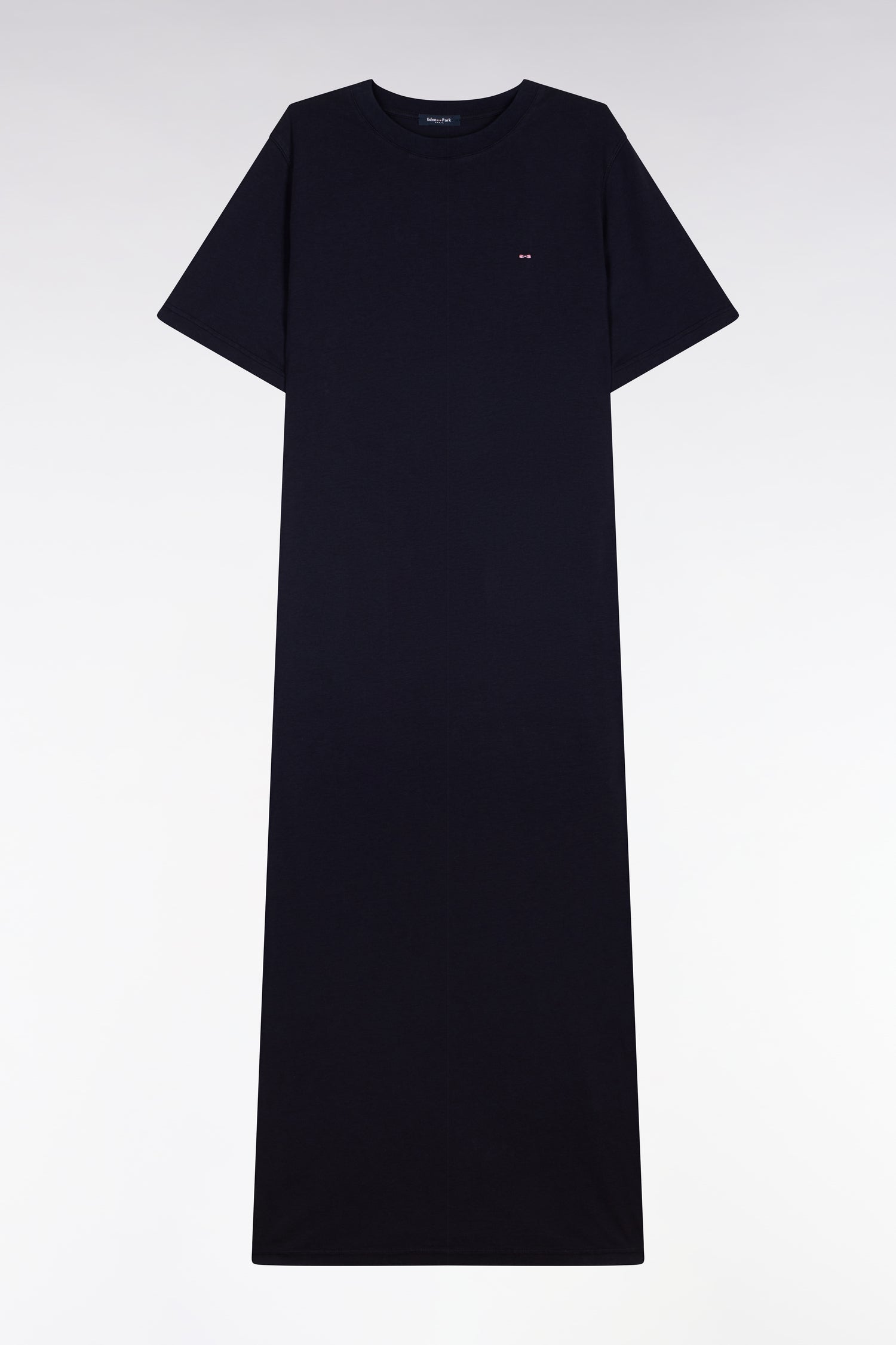 This long T-shirt dress in lyocell and overdyed cotton combines fluidity, softness and lightness to offer absolute comfort all day long. Its regular straight cut and natural drape are enough to perfect a summer look, simply pair it with a pair of sandals or low-top sneakers. Its side slit facilitates movement and energizes the look while emphasizing the femininity of this essential. A minimalist and modern piece, perfect for summer as well as mid-season. This timeless T-shirt dress is available in classic colors, beige, navy or black and in grass green, this season's star shade.