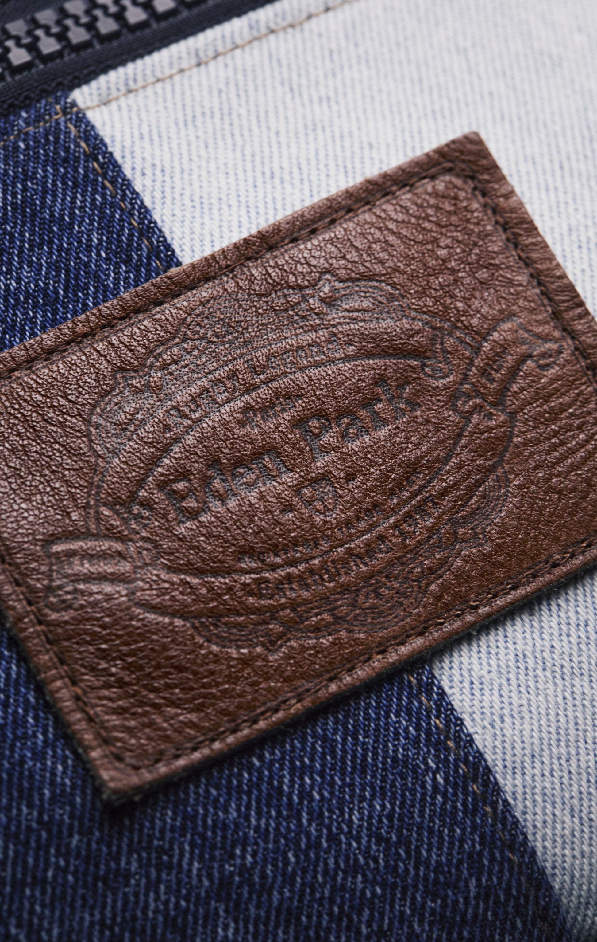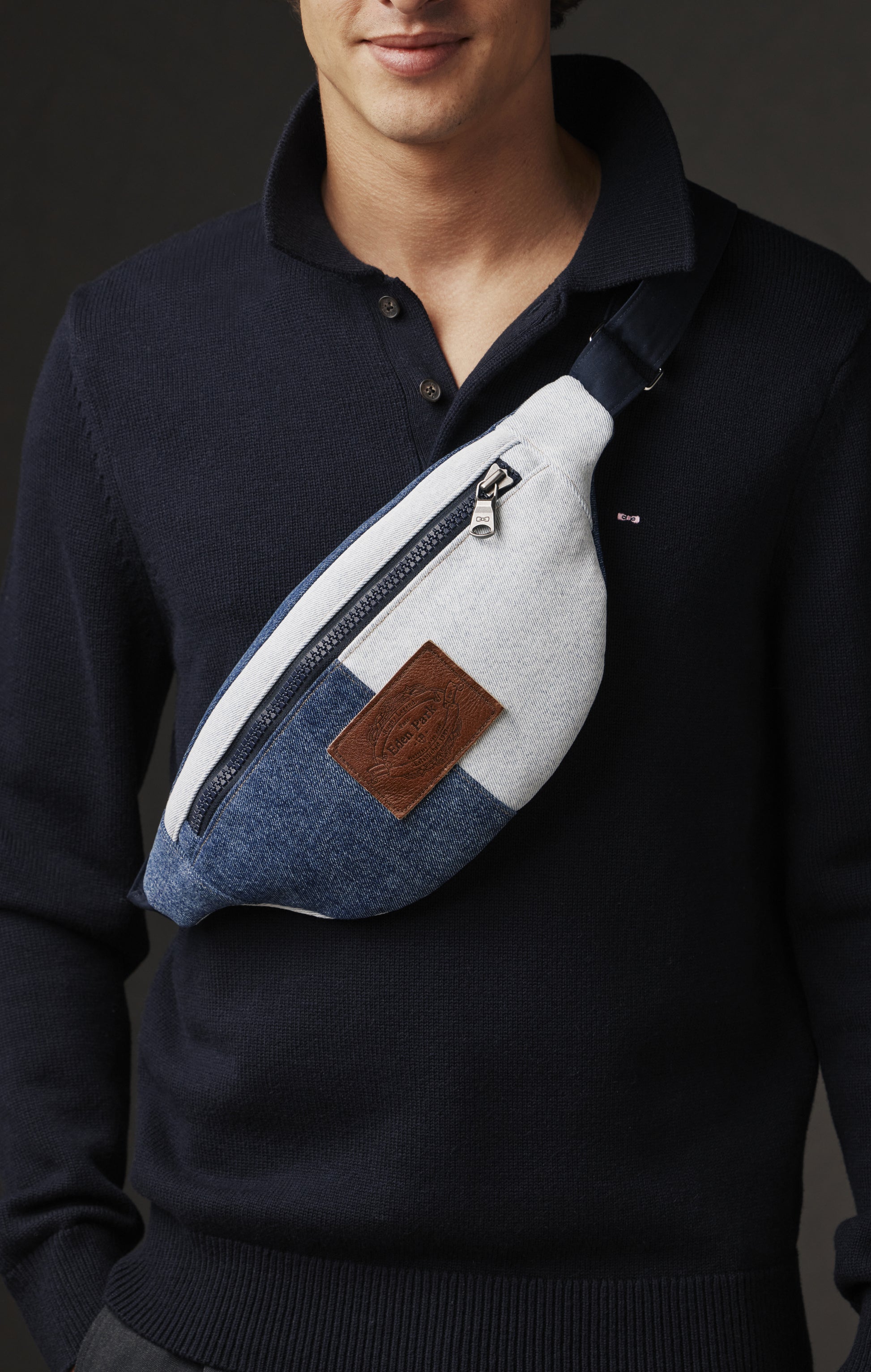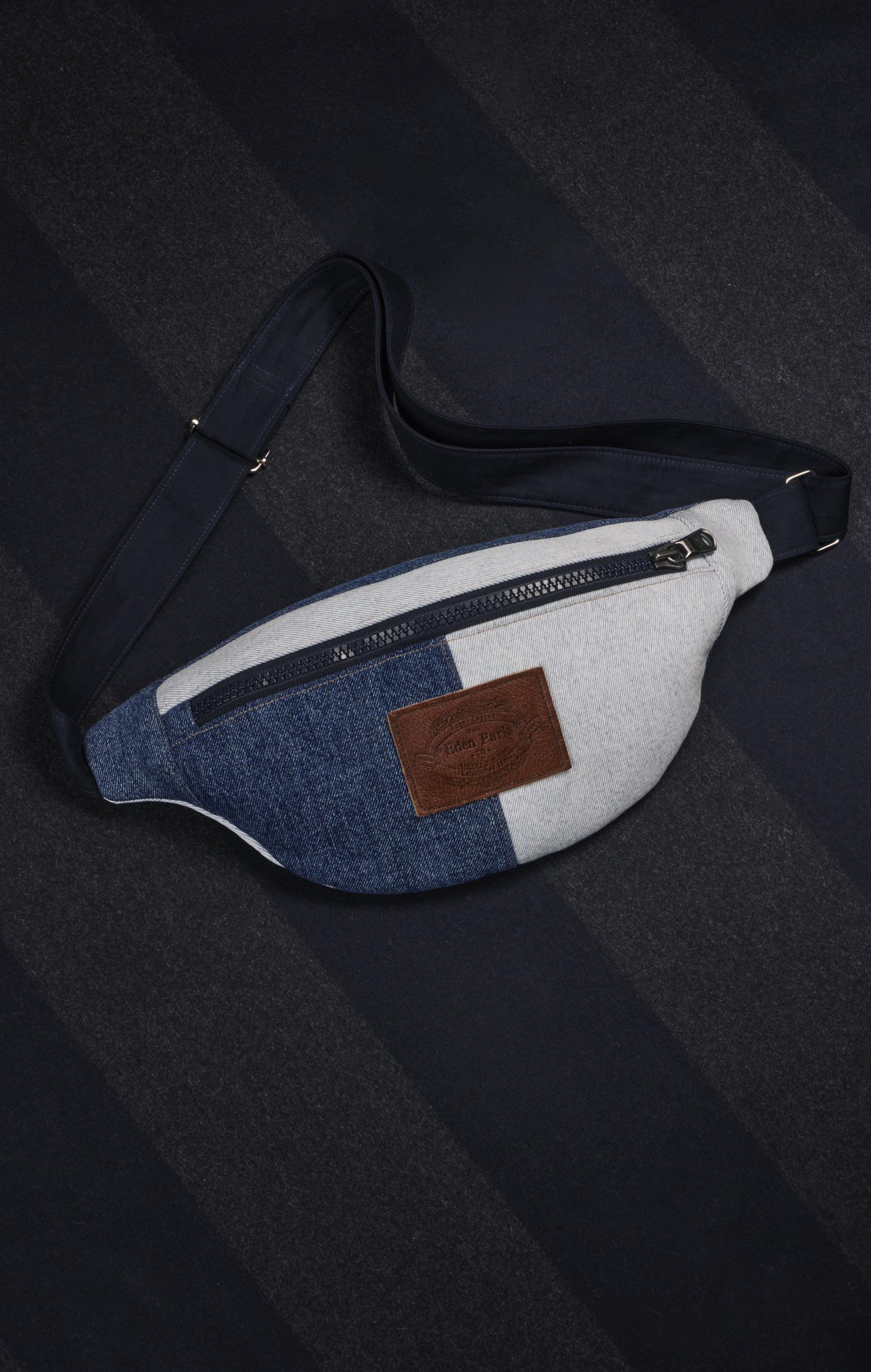 Imagined and handcrafted as part of our Pap'Atelier capsule, this two-tone denim fanny pack was made from scraps of our jeans transformed into bobs and tote bags for the same exclusive and sustainable collection. The zips come from archival garments, given a new lease of life in our workshop, while new metal buckles guarantee comfort and sturdiness. An interior zipped pocket and adjustable strap complete its functional design, designed to optimize everyday use. With its main zipper (length 27cm), its upcycled label in stylized leather and its generous dimensions, this accessory combines practicality, originality and a commitment to more sustainable fashion. Dimensions: 40cm x 17cm
