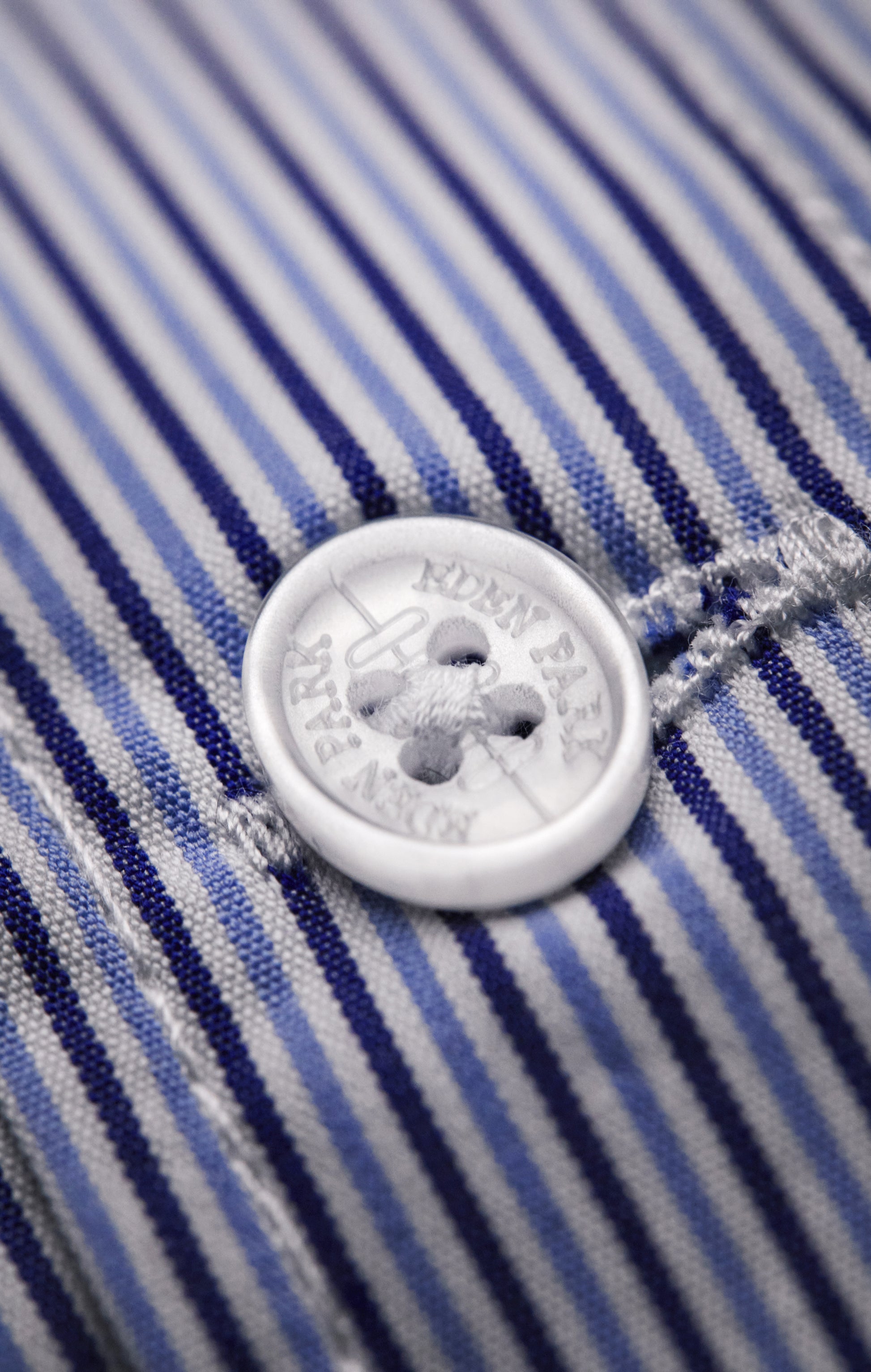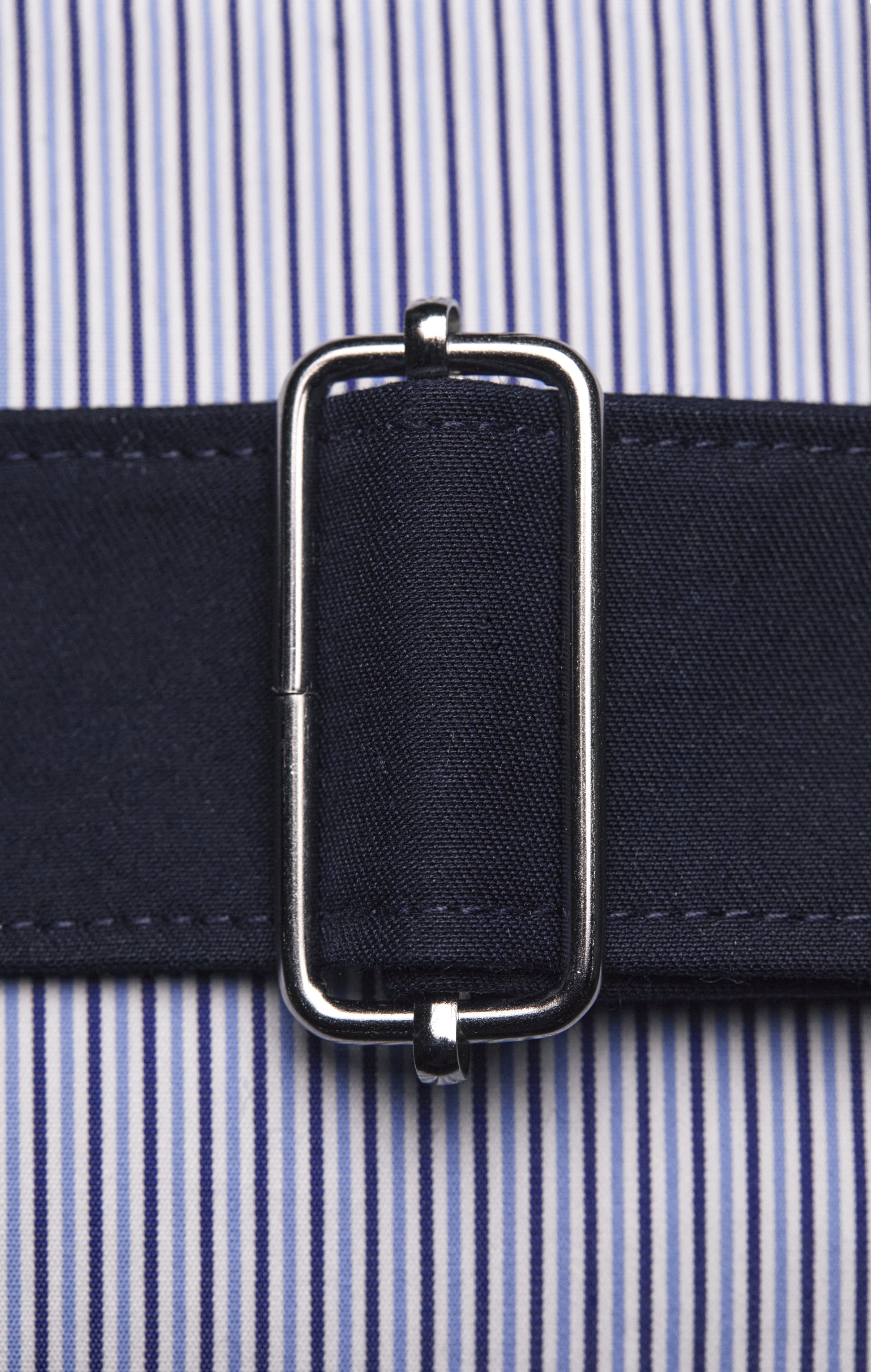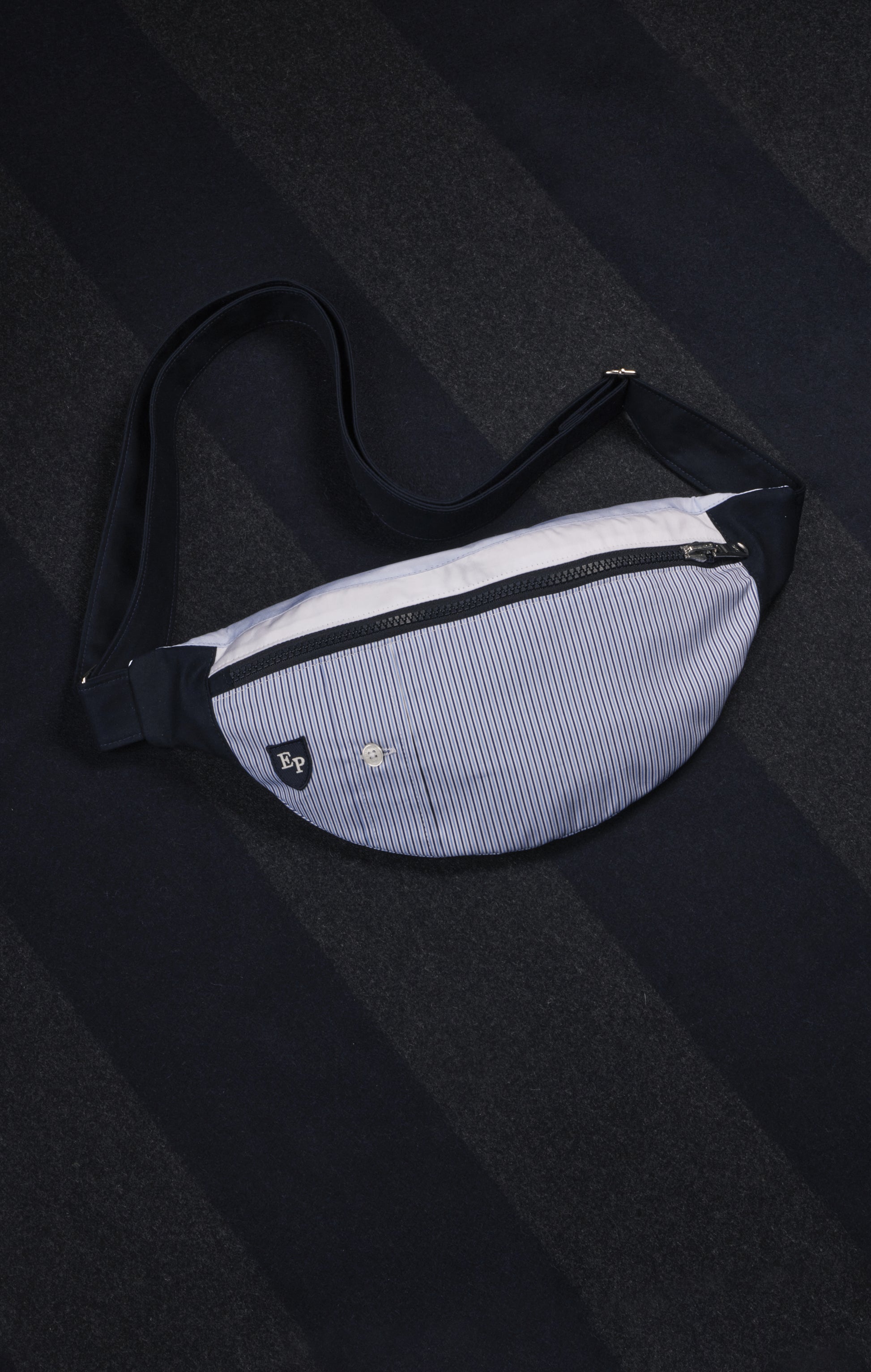 This banana bag was made from fabric scraps from upcycled shirts used to create other pieces in this Pap'Atelier collection, and the presence of a branded oval button on the yoke from a button placket offers a subtle reminder. True to our upcycling approach, this sky-and-white striped banana incorporates zippers recovered from historic pieces, while the two metal buckles are new to guarantee comfort and solidity. Practical and functional, this unisex banana features an inside zipped pocket and an adjustable strap to suit all body shapes. Its generous dimensions (37 x 15.5 cm) make it an ideal accessory to accompany your everyday travels with style and commitment. This unique accessory is available on our website for a limited time only.