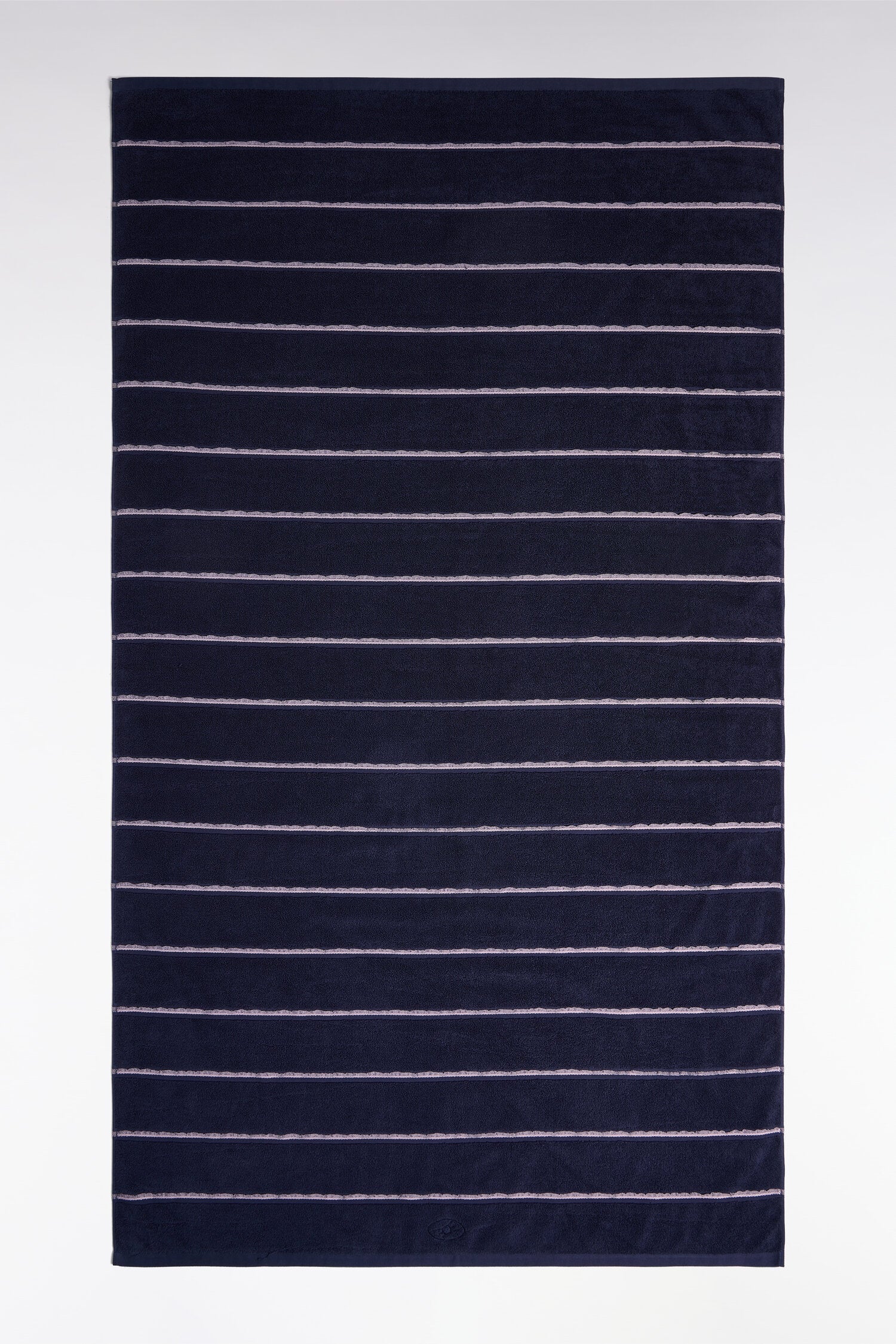 Cette serviette de plage en coton éponge associe confort et élégance sport chic. Son jacquard à fines rayures contrastées évoque les maillots de bain masculins de la Maison, tandis que la broderie ton sur ton signe une allure discrètement identitaire. Douce, absorbante et généreuse par ses dimensions, elle accompagne aussi bien les journées plage que les moments piscine. Disponible en plusieurs coloris coordonnés aux collections homme, elle complète parfaitement la silhouette estivale Eden Park.