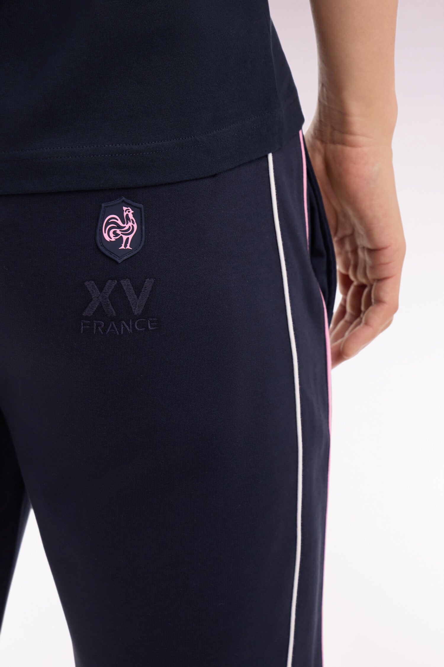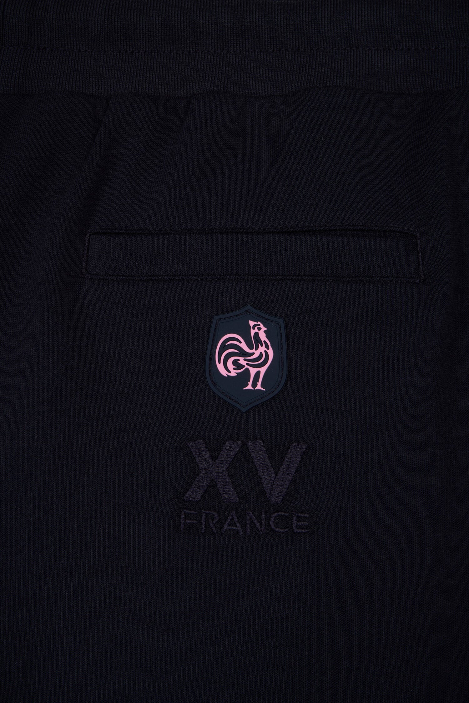 Ce short en molleton interlock revisite le style rugby dans une version raffinée pensée pour la ville. Des passepoils contrastés soulignent la jambe pour une touche graphique et élégante alors que badges et broderies XV de France scellent une passion partagée pour l'ovalie. Idéal pour les moments de détente comme pour vos sorties du week-end, ce short marine se coordonne aisément au sweatshirt zippé assorti pour une silhouette contemporaine aux influences athlétiques.