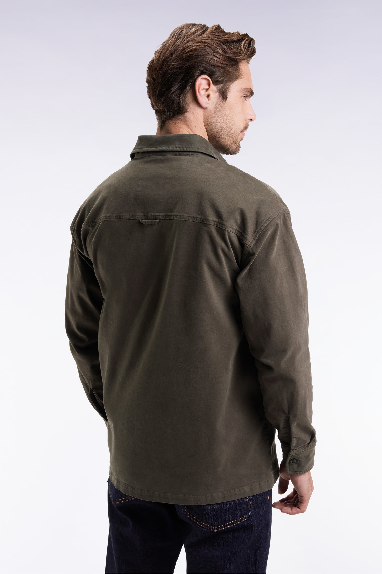 With its twill fabric and khaki hue, this stretch cotton overshirt takes its inspiration from the military wardrobe and turns it on its head. Unlined, it can be worn as a light jacket or a structured shirt, as you wish. Flap pockets with gussets, personalized buttons and branded elements reinforce its functional character. A sober, timeless, masculine piece to slip into any seasonal silhouette. A pure design, supported by excellent cuts and materials.