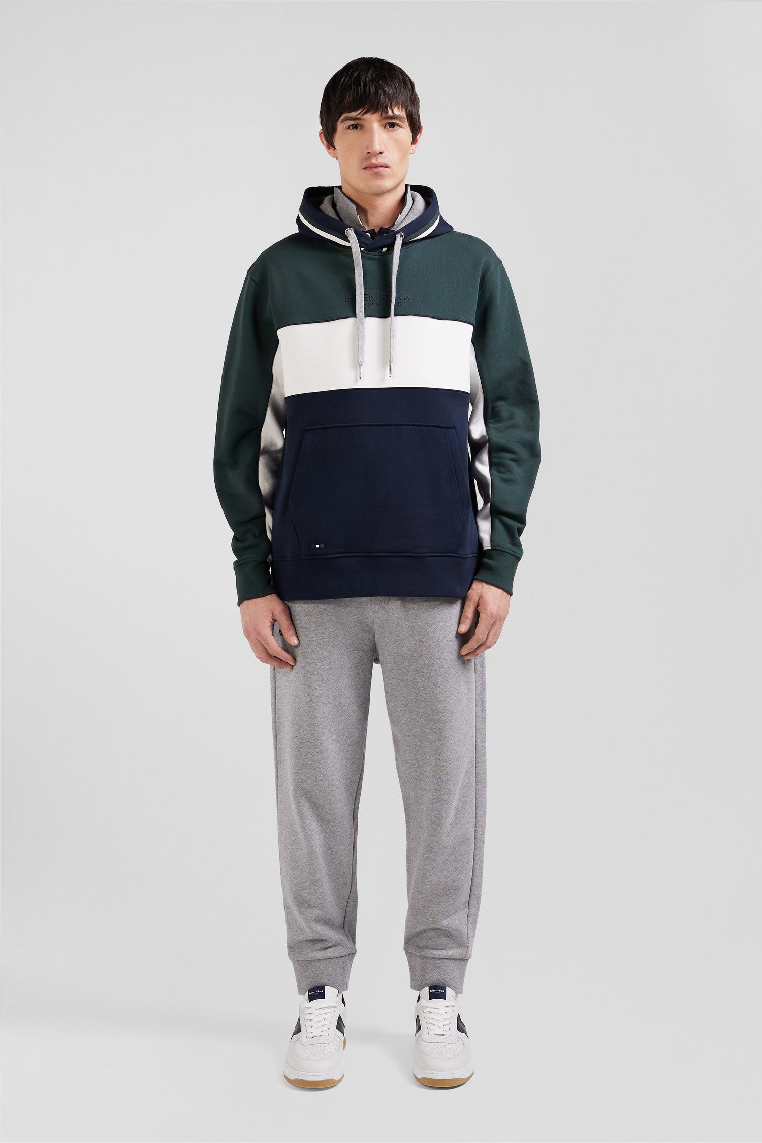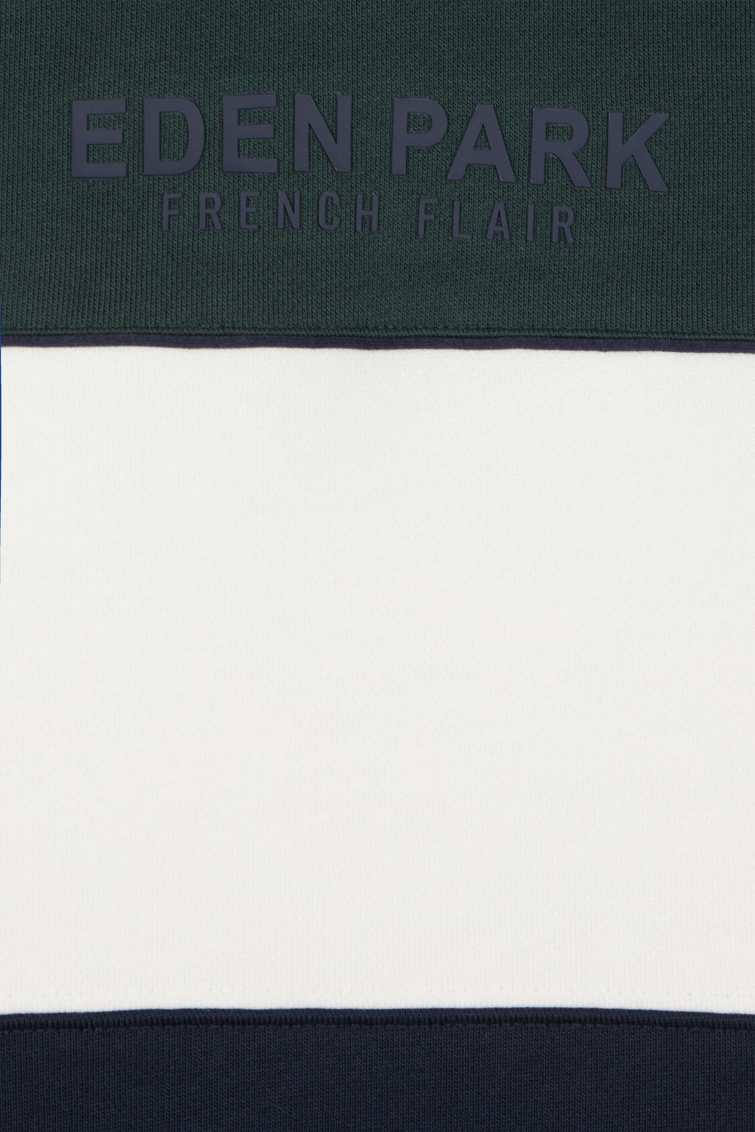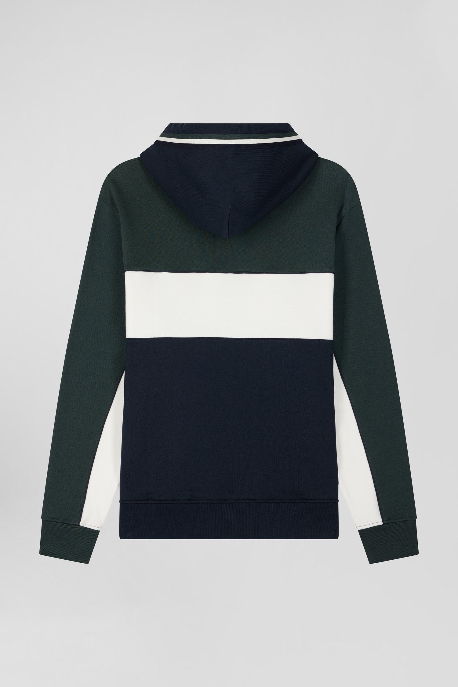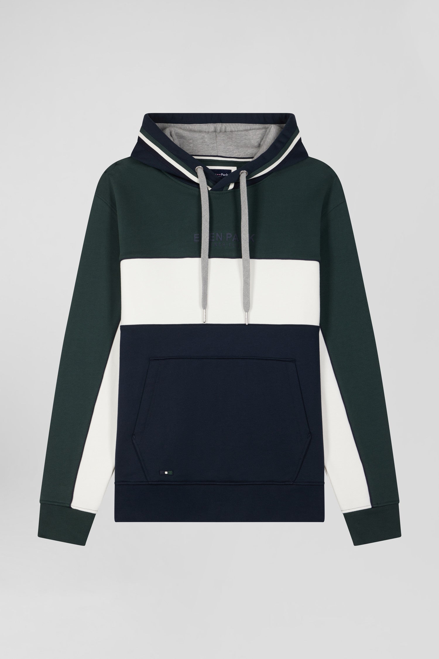 Opt for our tricolored hooded sweatshirt, a must-have for any fashionista. Made from brushed fleece, it offers incomparable softness. Elegant piping highlights the sleeve cut-outs, while the Eden Park French Flair lettering asserts its identity. A knitted ribbon applied around the hood adds a touch of refinement to this hoodie, perfectly fusing comfort and style.