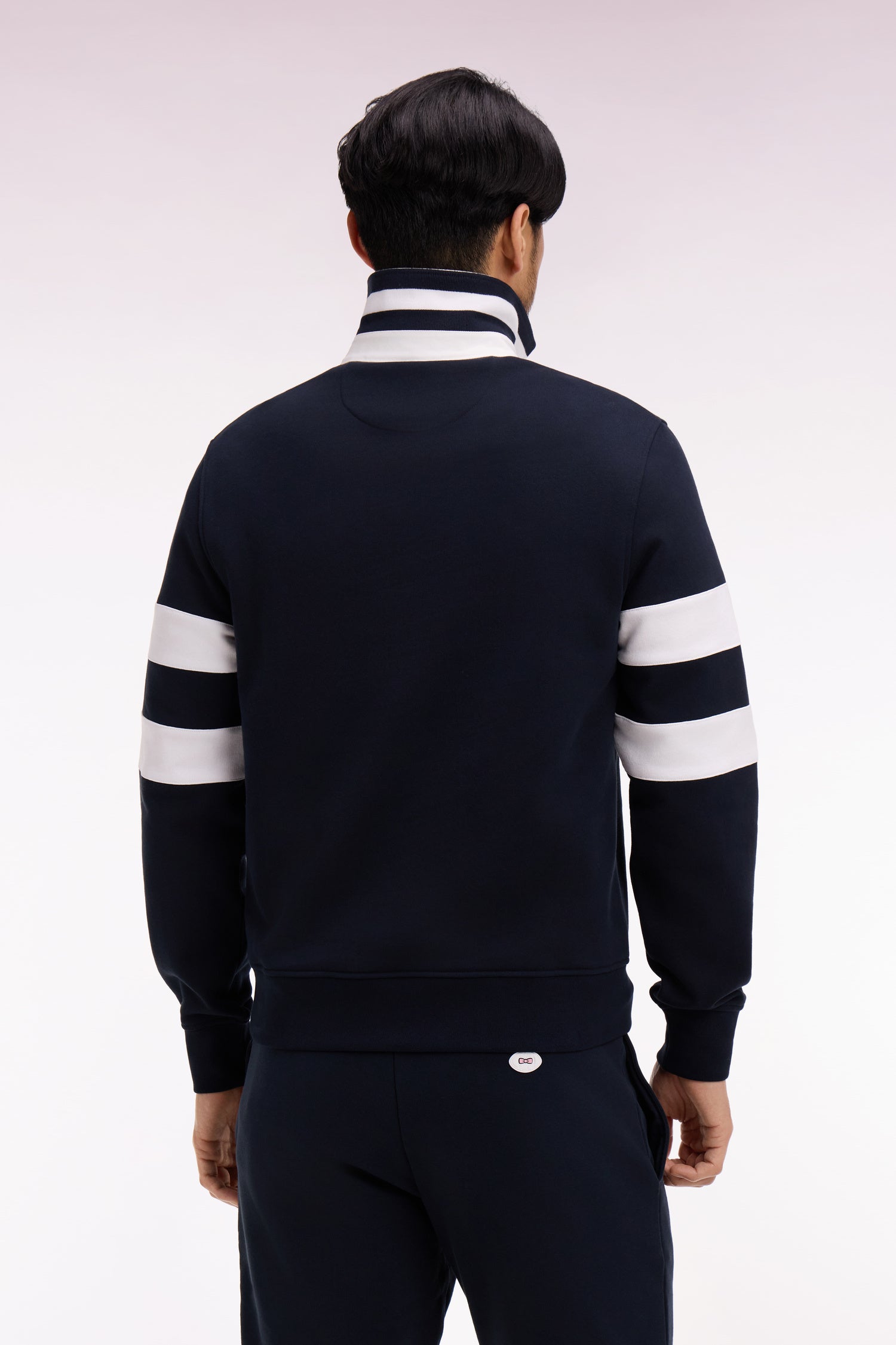Ce sweatshirt homme revisite l’iconique maillot de rugby dans une version contemporaine adapté à l'extérieur du terrain. Le col maillot contrasté à dessous de col rayé, les bandes découpées bicolores sur les manches et le badge poitrine signent une silhouette sport chic lumineuse. Confectionné dans un molleton doux, ce sweatshirt apporte une touche preppy idéale pour les looks décontractés de mi-saison. Un modèle intemporel masculin offert en ciel, rose ou marine. À Porter avec un jean ou son short en molleton pour un total look d'inspiration retour de l'entrainement.